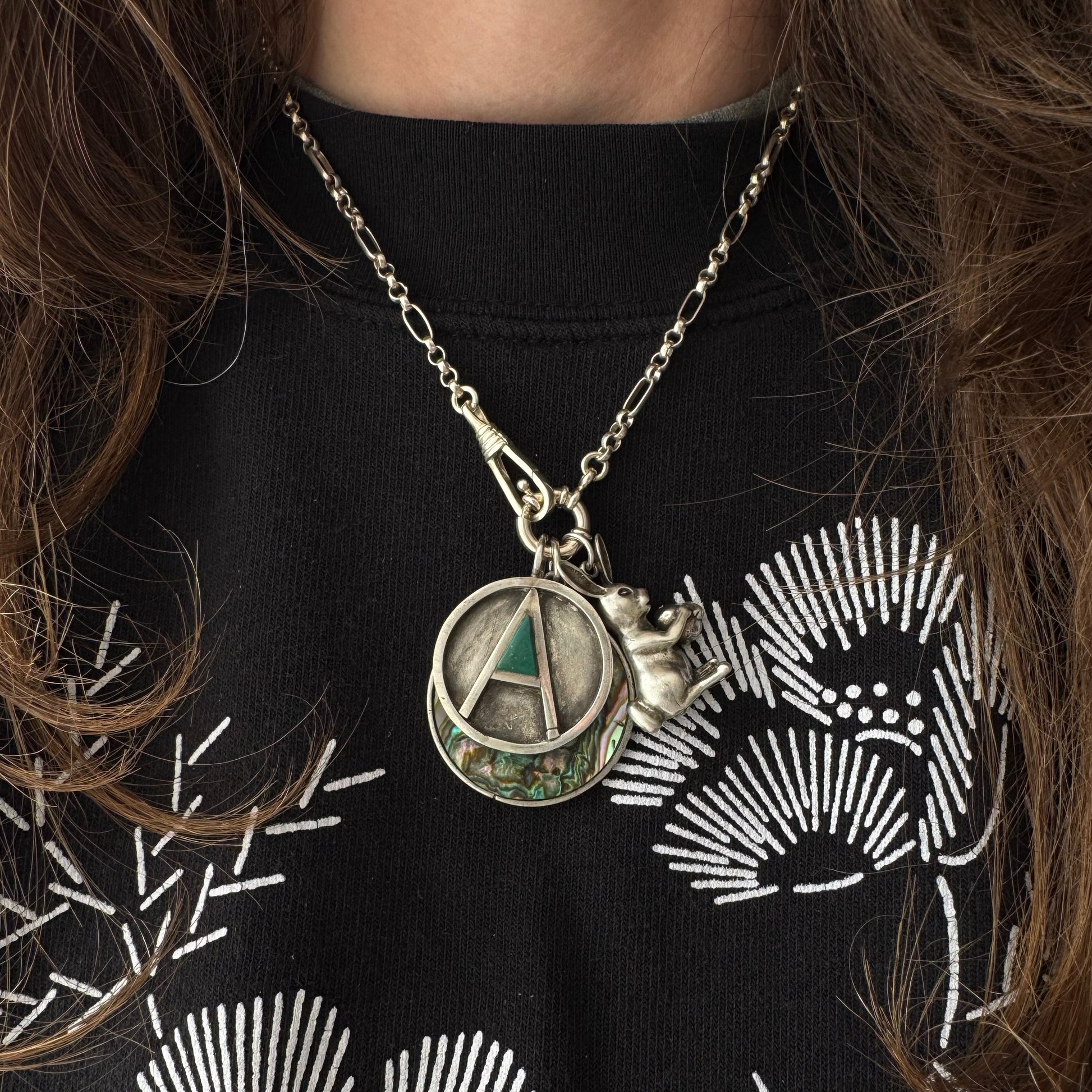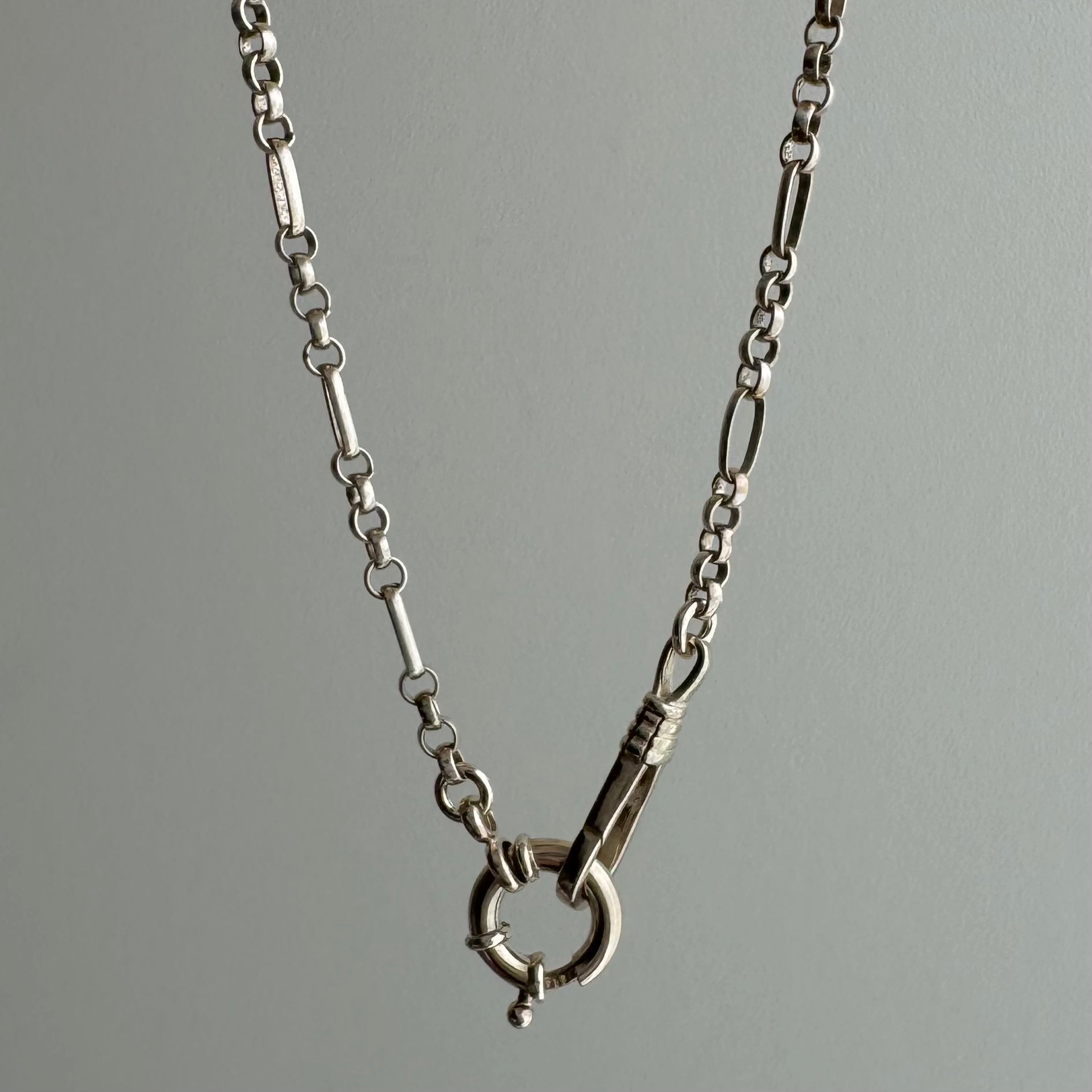 a vintage petite trombone link chain has been re-worked with new clasps reminiscent of a watch chain — a new clasp in the style of a dog clip clasp, but without the swivel feature, and a new sailor clasp.