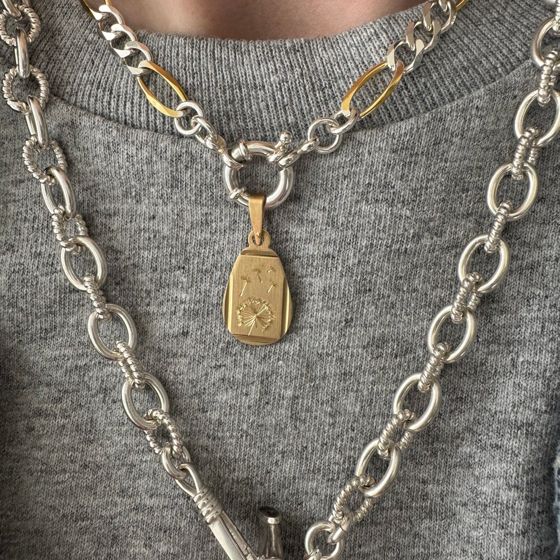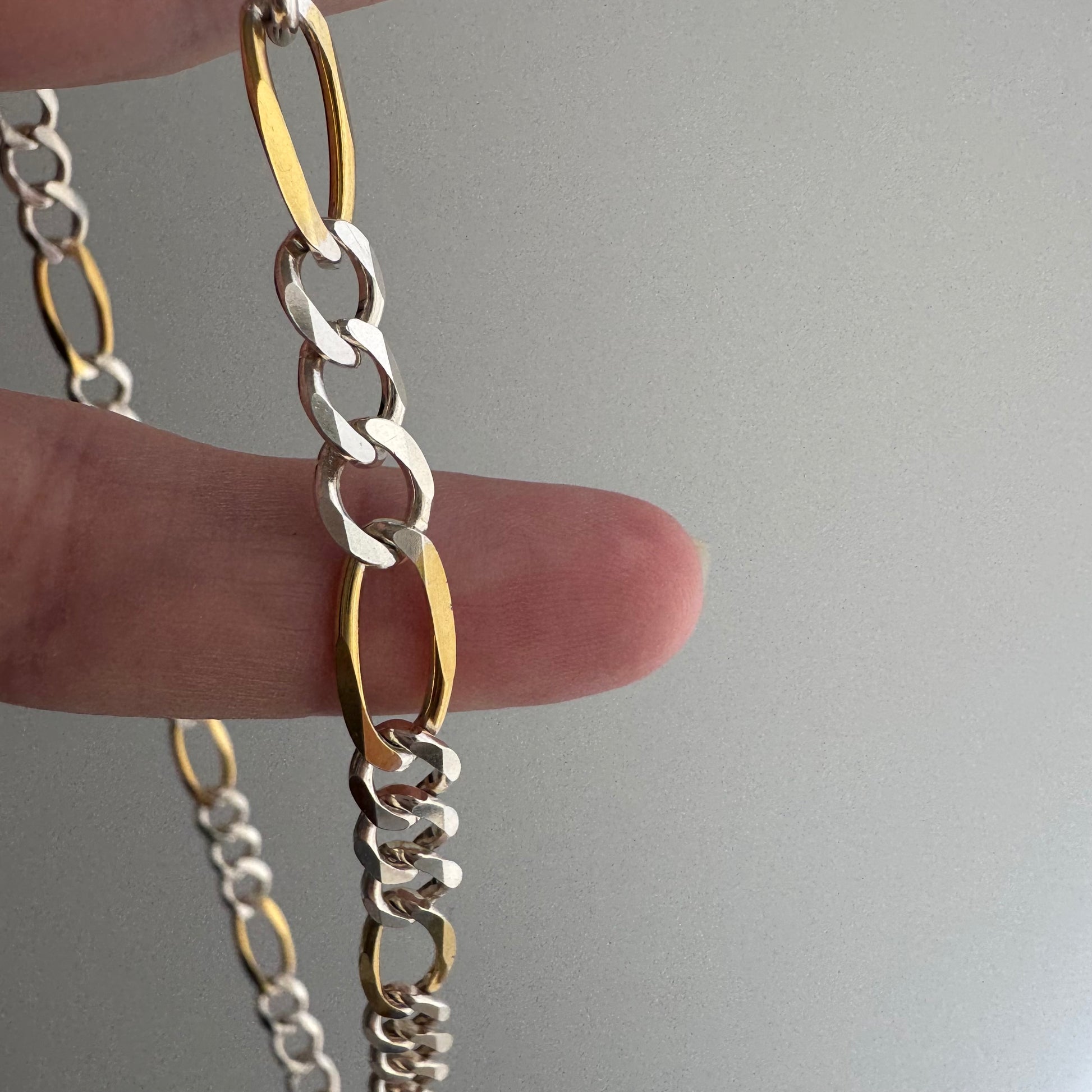 a chunky two tone preloved two tone figaro chain has been re-worked with new clasps reminiscent of a watch chain — a new clasp in the style of a dog clip clasp, but without the swivel feature, and a new sailor bolt clasp.