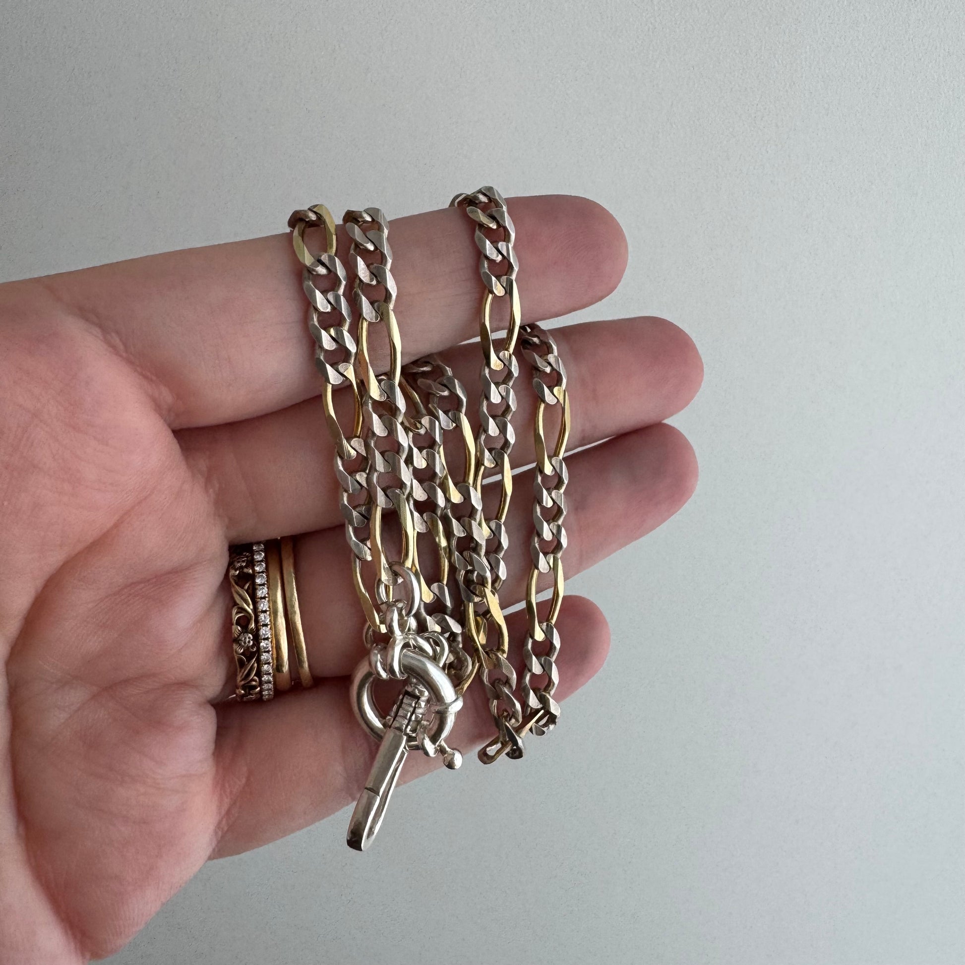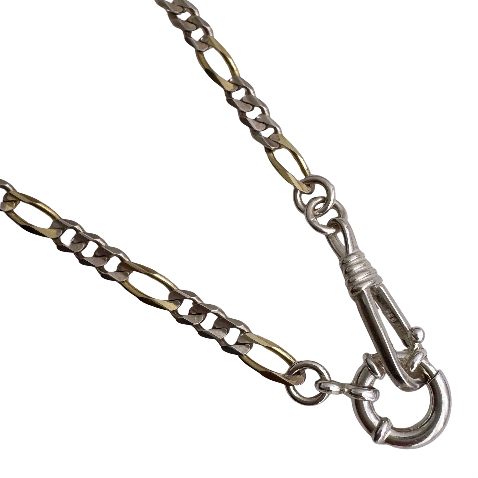 a sturdy two tone vintage figaro chain has been re-worked with new clasps reminiscent of a watch chain — a new clasp in the style of a dog clip clasp, but without the swivel feature, and a new sailor clasp.