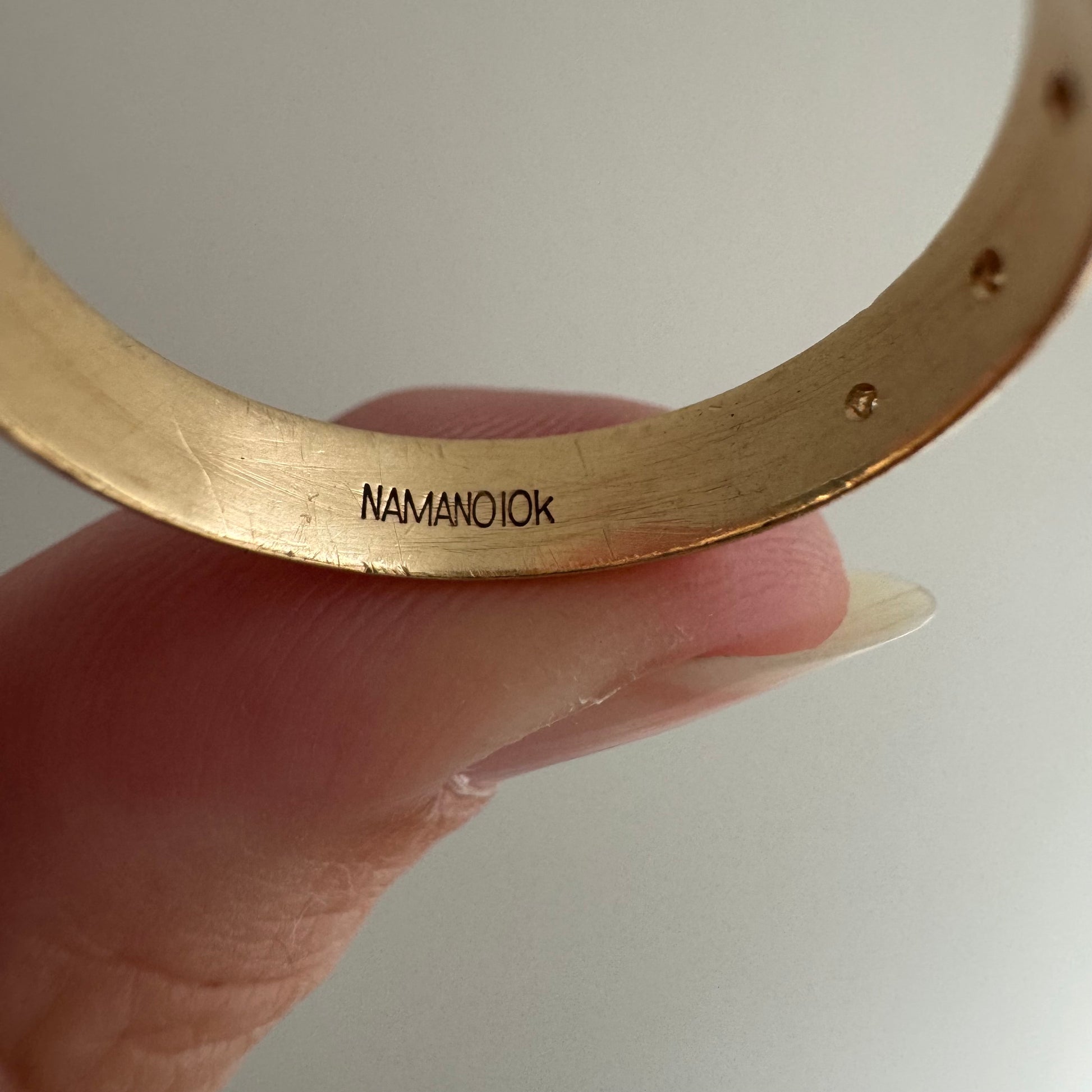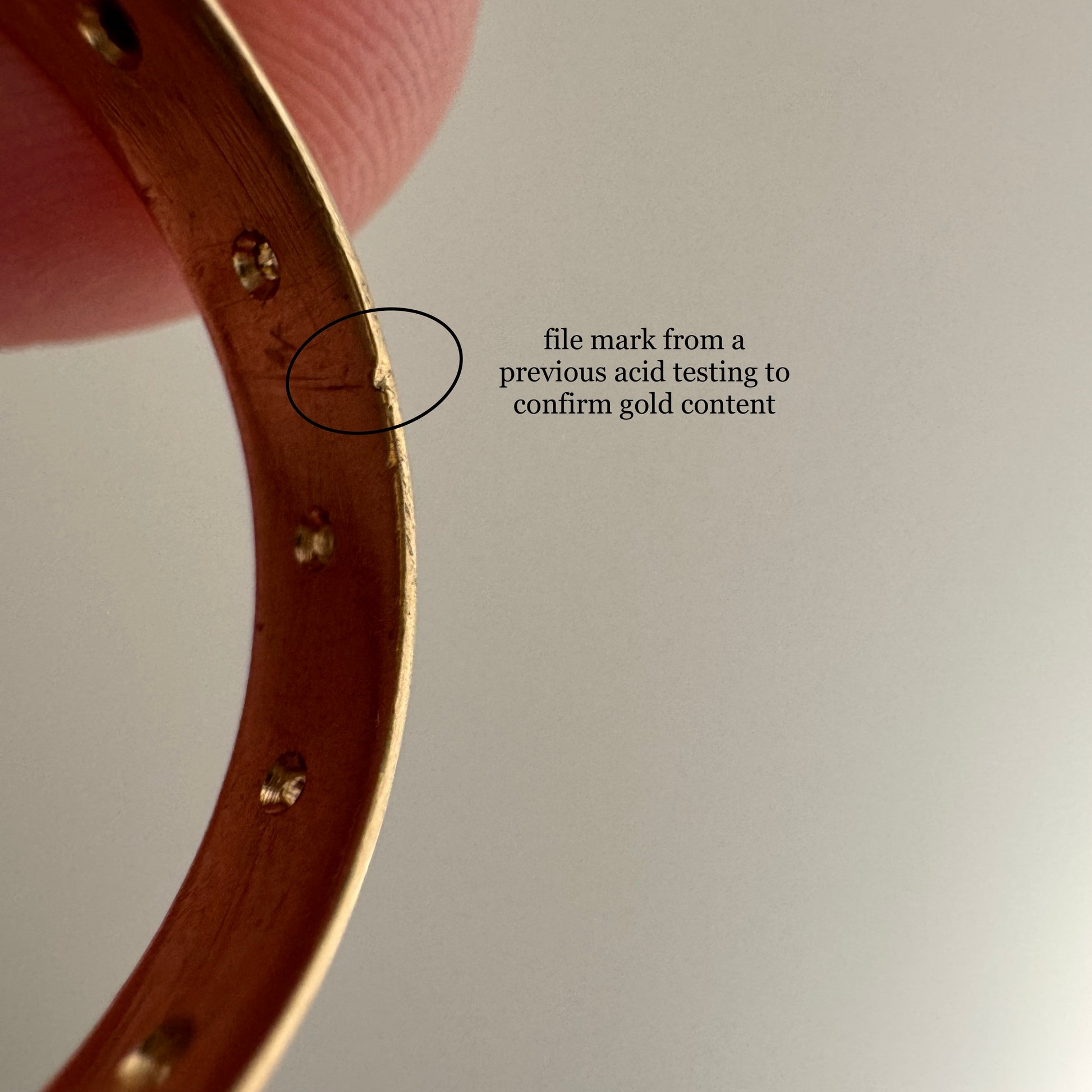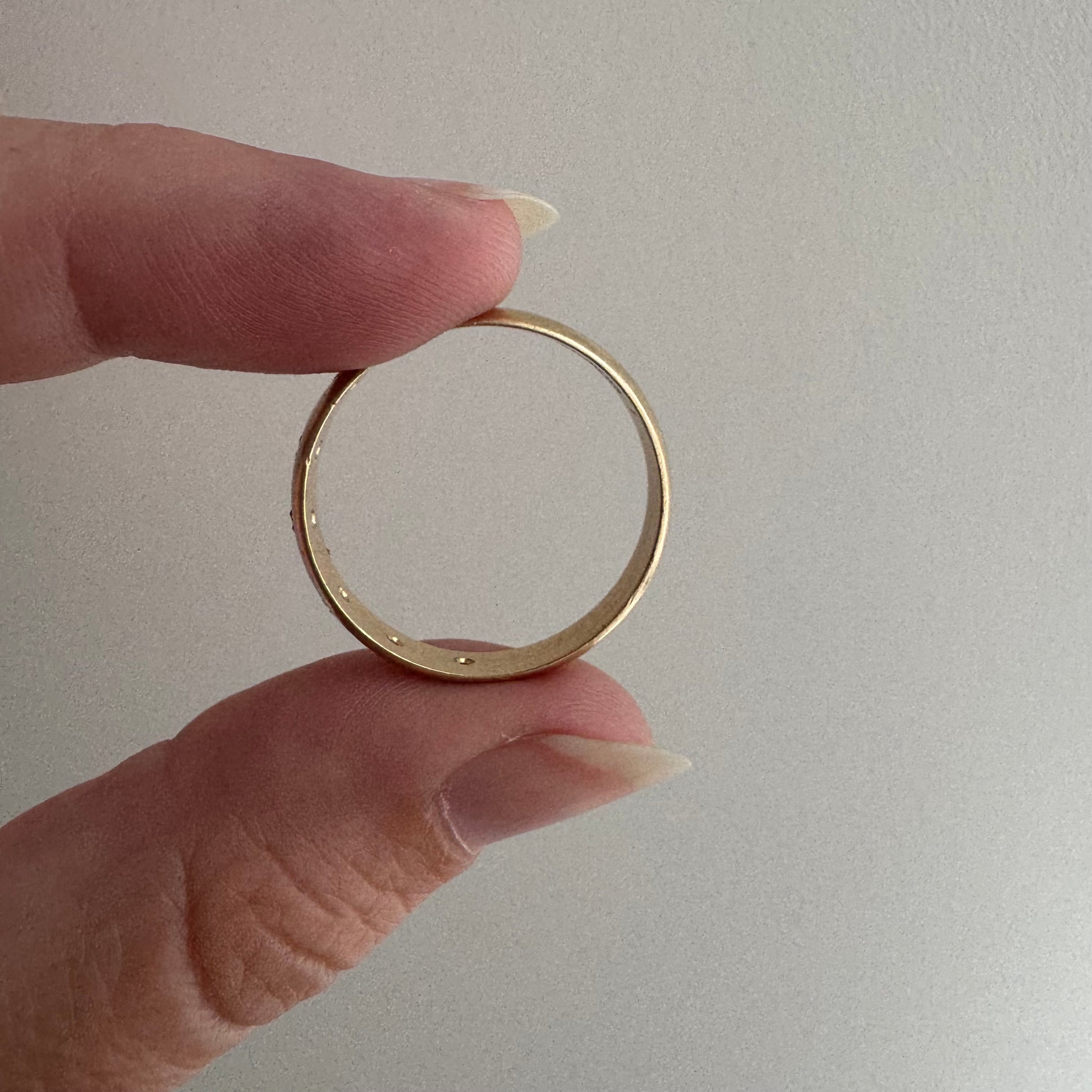this particular band is a vintage shallow D-shaped band by Namano in a pale hue of solid 10k yellow gold. the seven diamonds are new round brilliant cuts. the star set diamonds are done by hand, so you'll notice they aren't perfectly equidistant or level, and each one has its own little quirks in its eight point setting. it's a wearable prayer about our connection with each other, the universe, and the magic that is in the now, which is possible only because of what has come before and what is yet to unfold