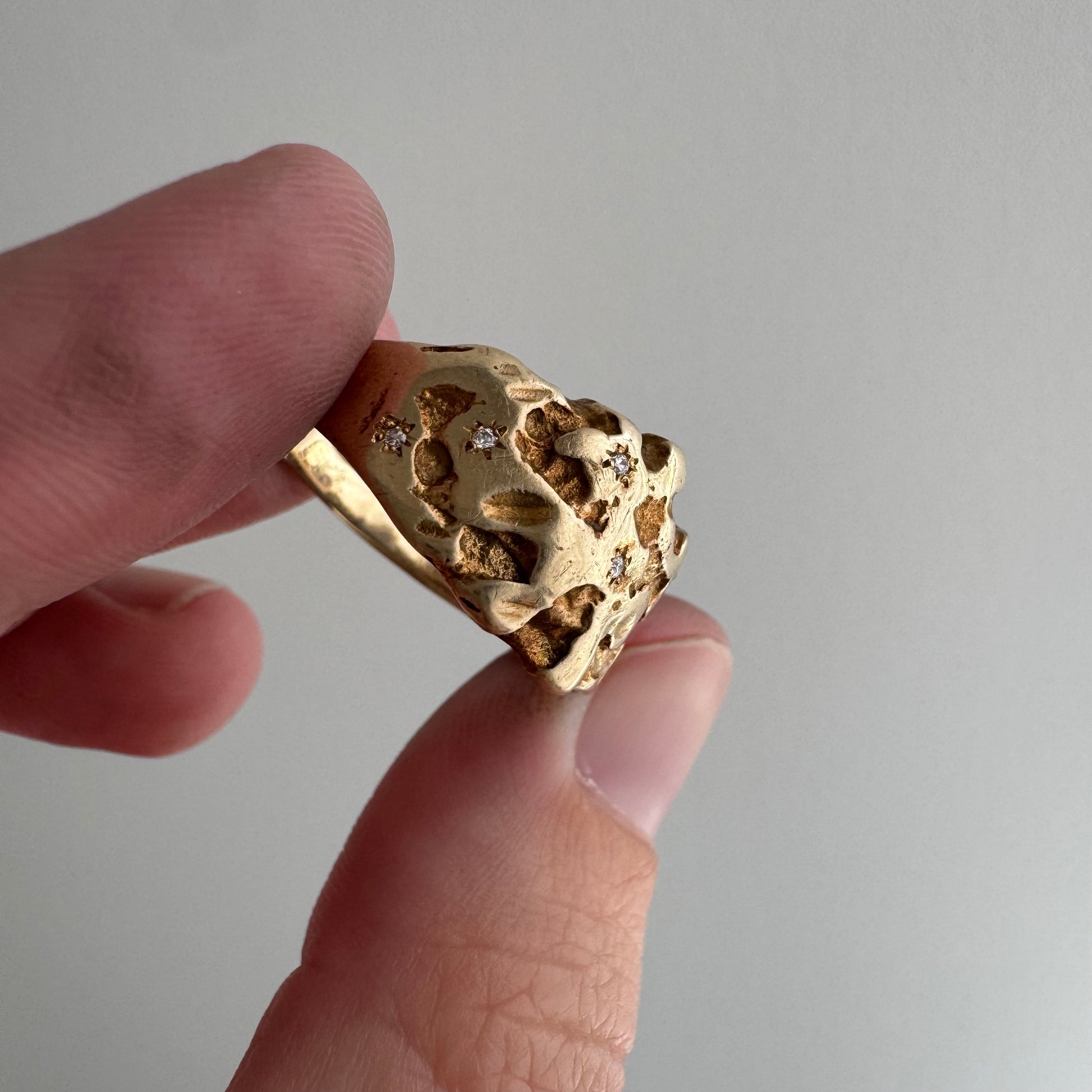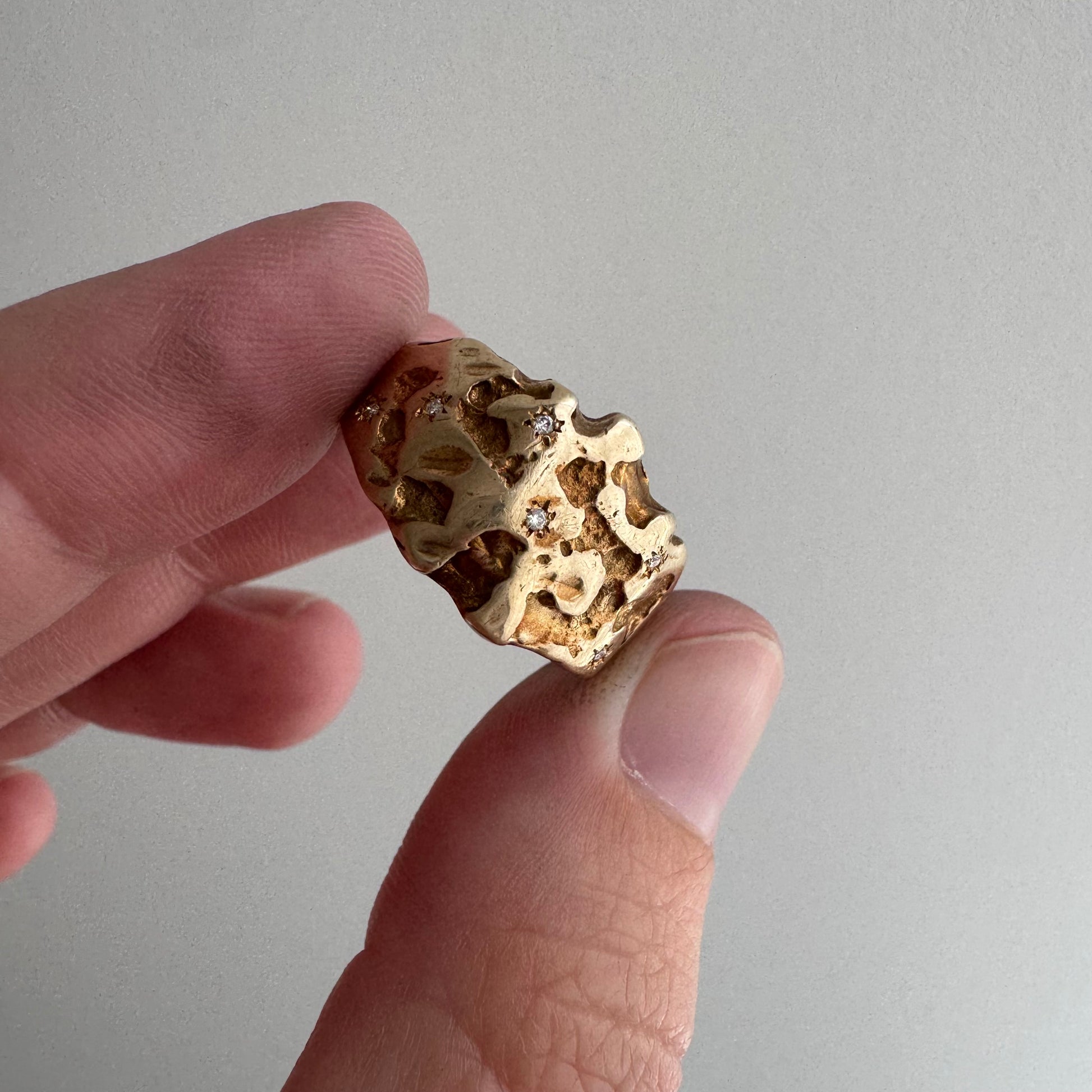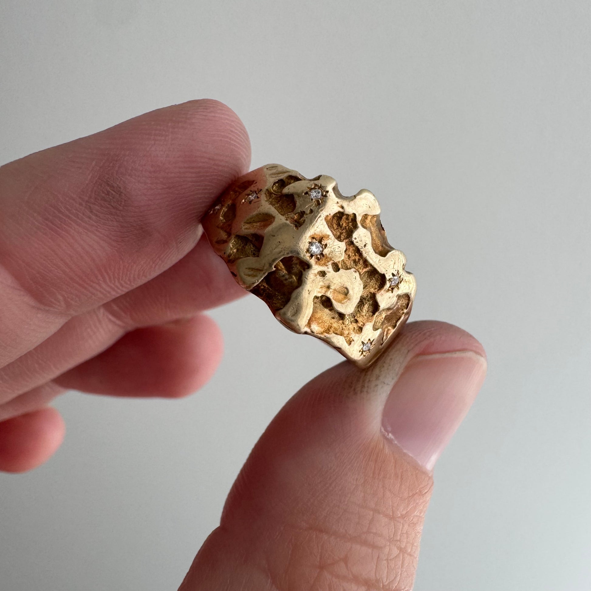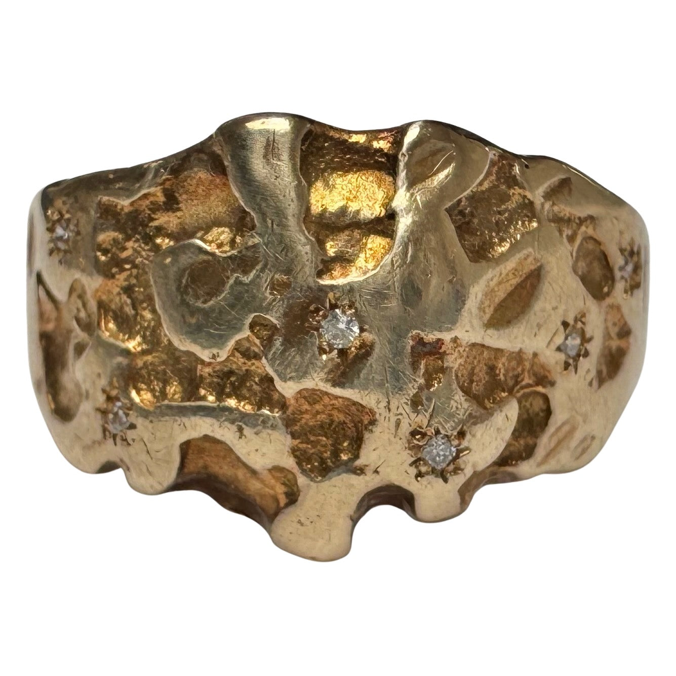 this particular ring is a rustic nugget style wide, sturdy tapered, bomed band in a buttery hue of solid 10k yellow gold. the six diamonds are new round brilliant cuts. the star set diamonds are done by hand, so you'll notice that each one has its own little quirks. it's a wearable prayer about our connection with each other, the universe, and the magic that is in the now, which is possible only because of what has come before and what is yet to unfold