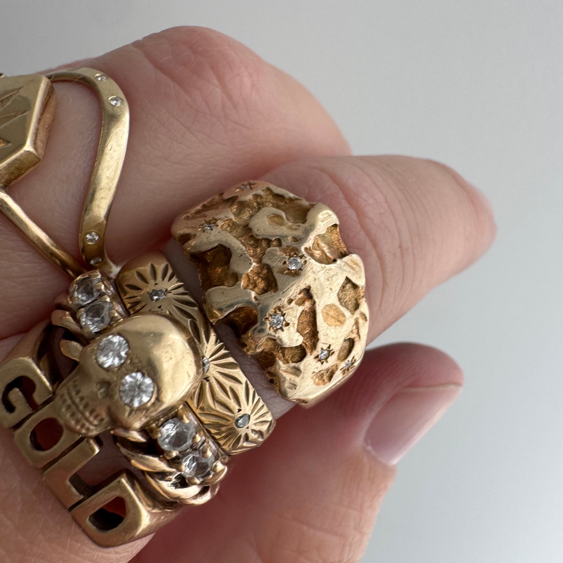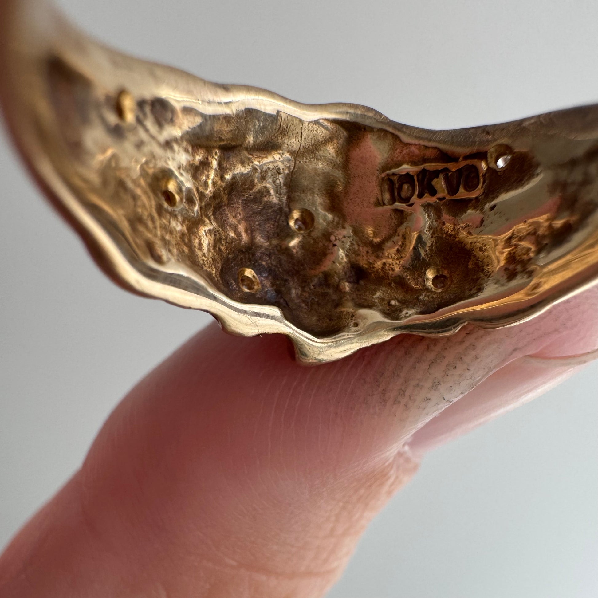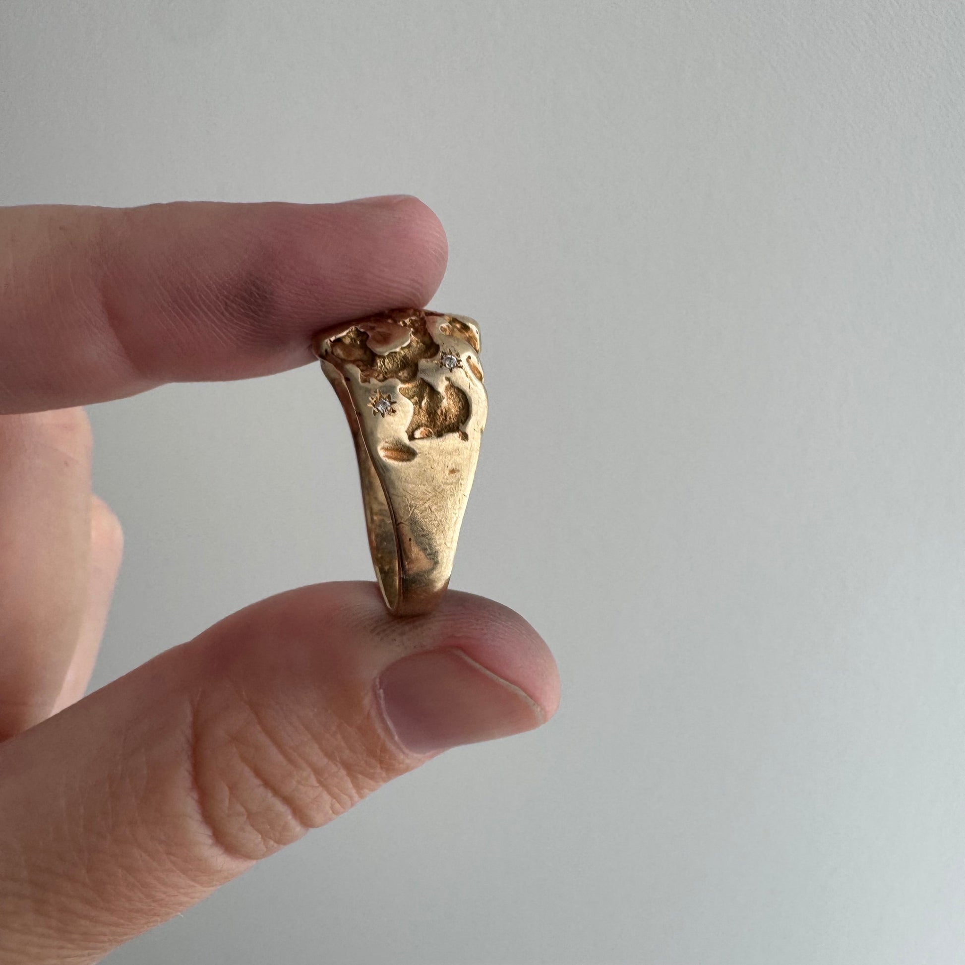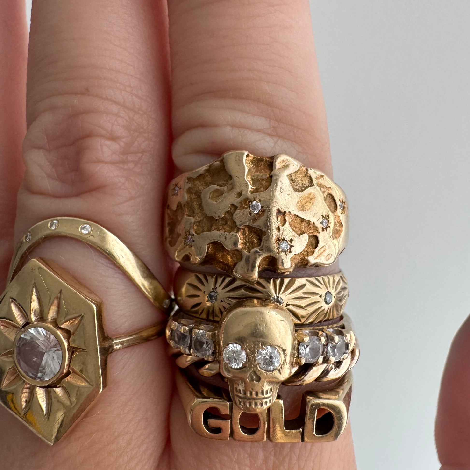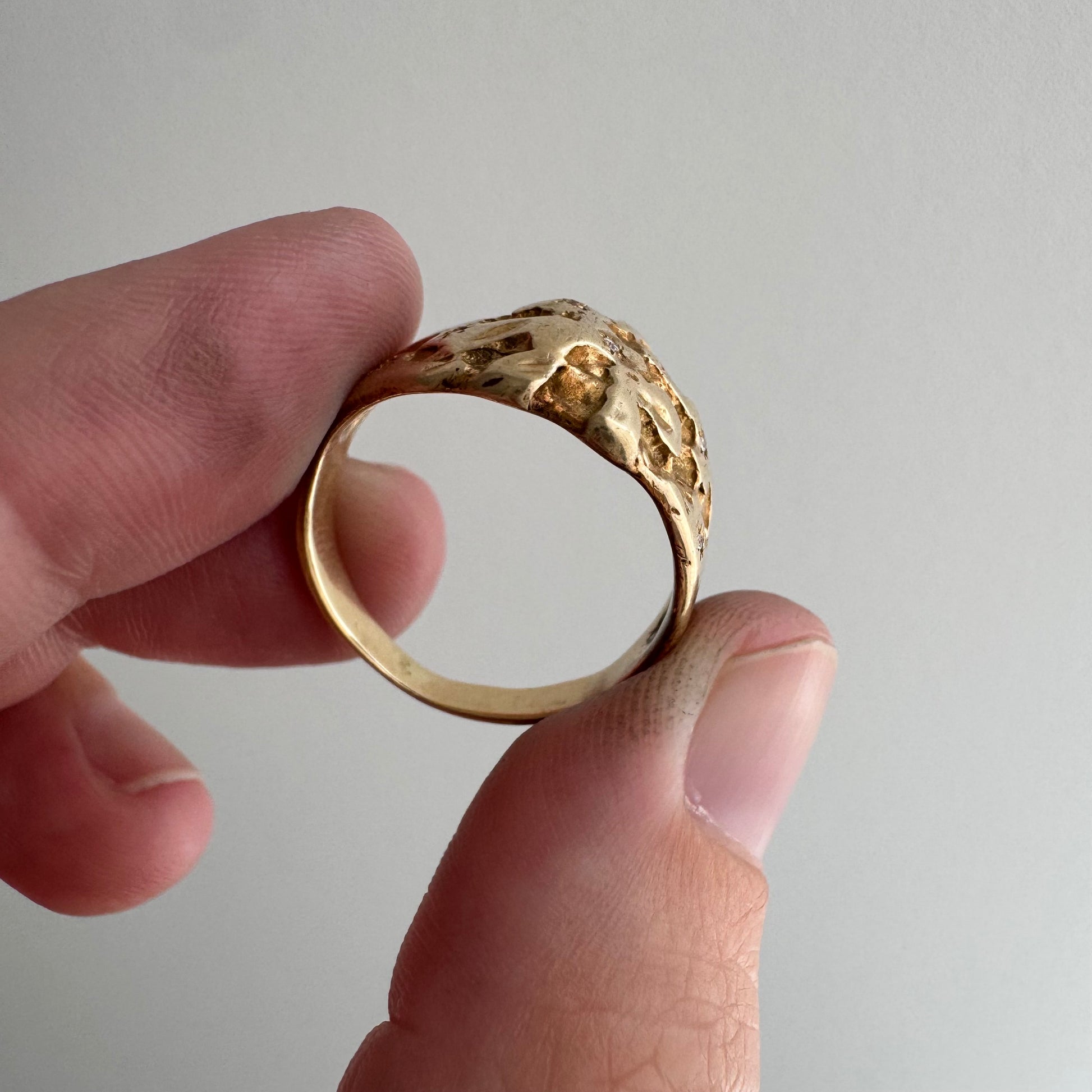 this particular ring is a rustic nugget style wide, sturdy tapered, bomed band in a buttery hue of solid 10k yellow gold. the six diamonds are new round brilliant cuts. the star set diamonds are done by hand, so you'll notice that each one has its own little quirks. it's a wearable prayer about our connection with each other, the universe, and the magic that is in the now, which is possible only because of what has come before and what is yet to unfold