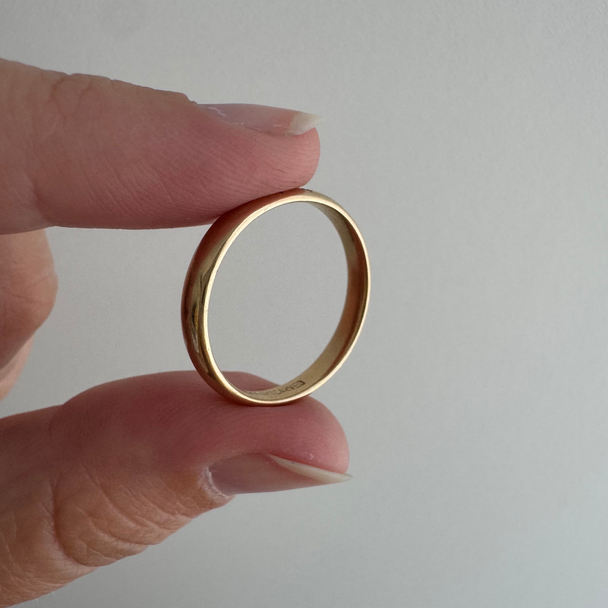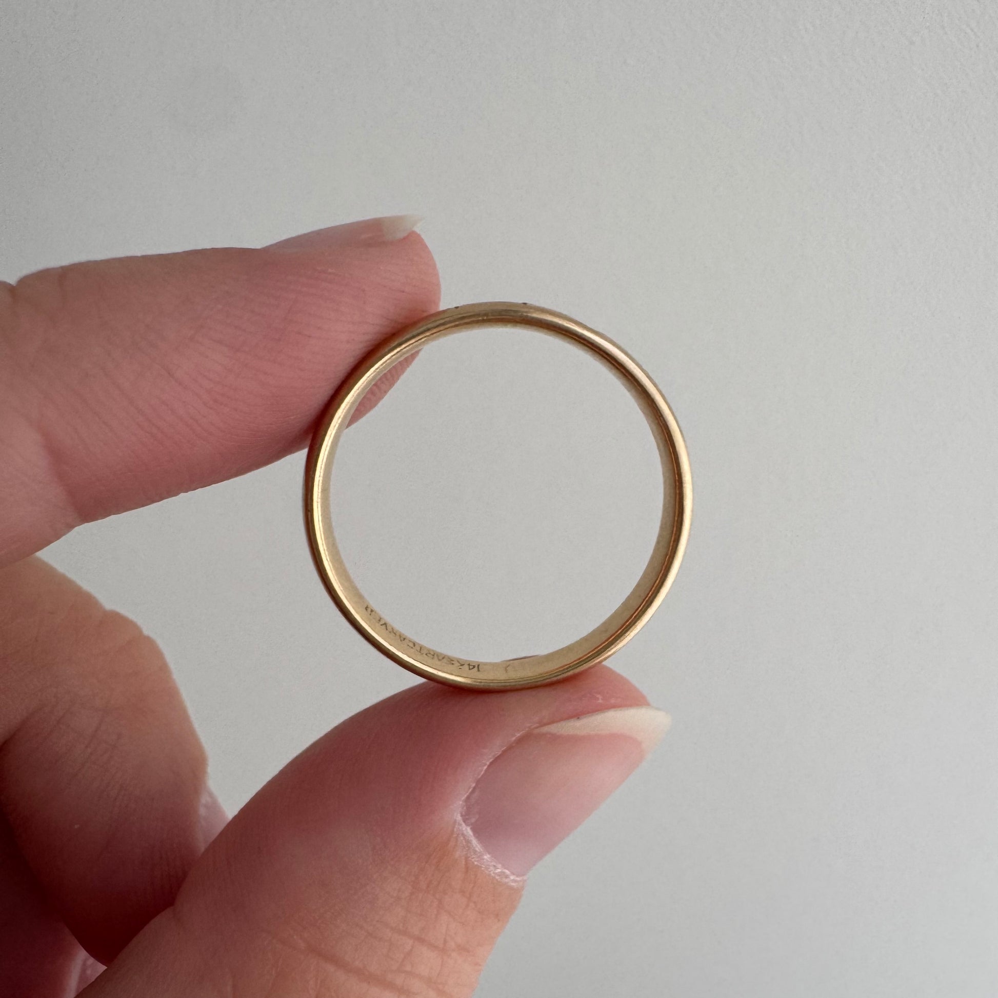 this is a vintage band so there are slight fluctuations in width from wear, and it averages to about ~3.23mm wide x ~1.4mm thick