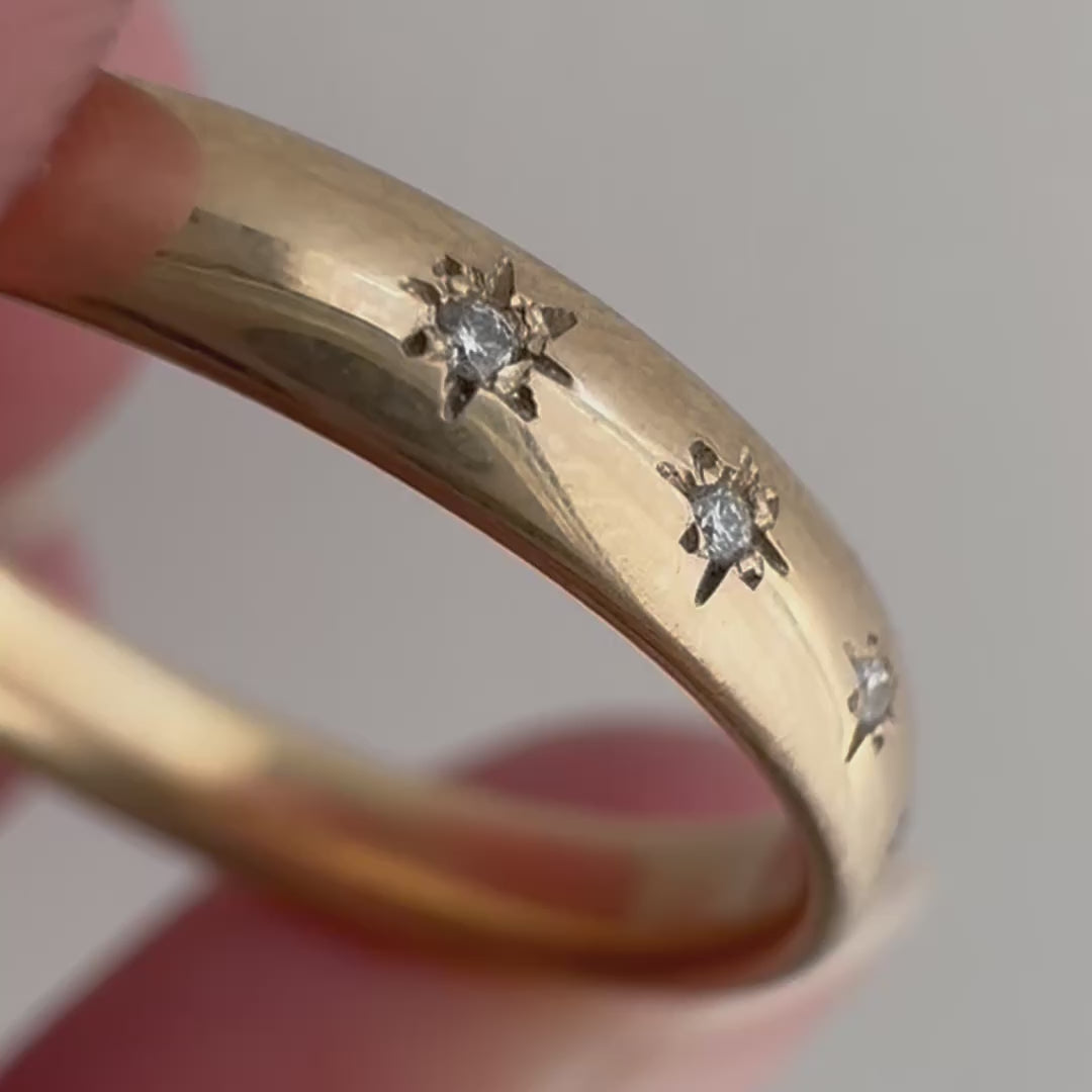-star settings are each done by hand on a vintage band, which is extra tricky. they are neither perfectly level or equidistant and each one has eight points, but they points are all unique, like actual stars. this is the magic of a truly hand-set stone, but if you prefer precision then this isn't your perfect treasure