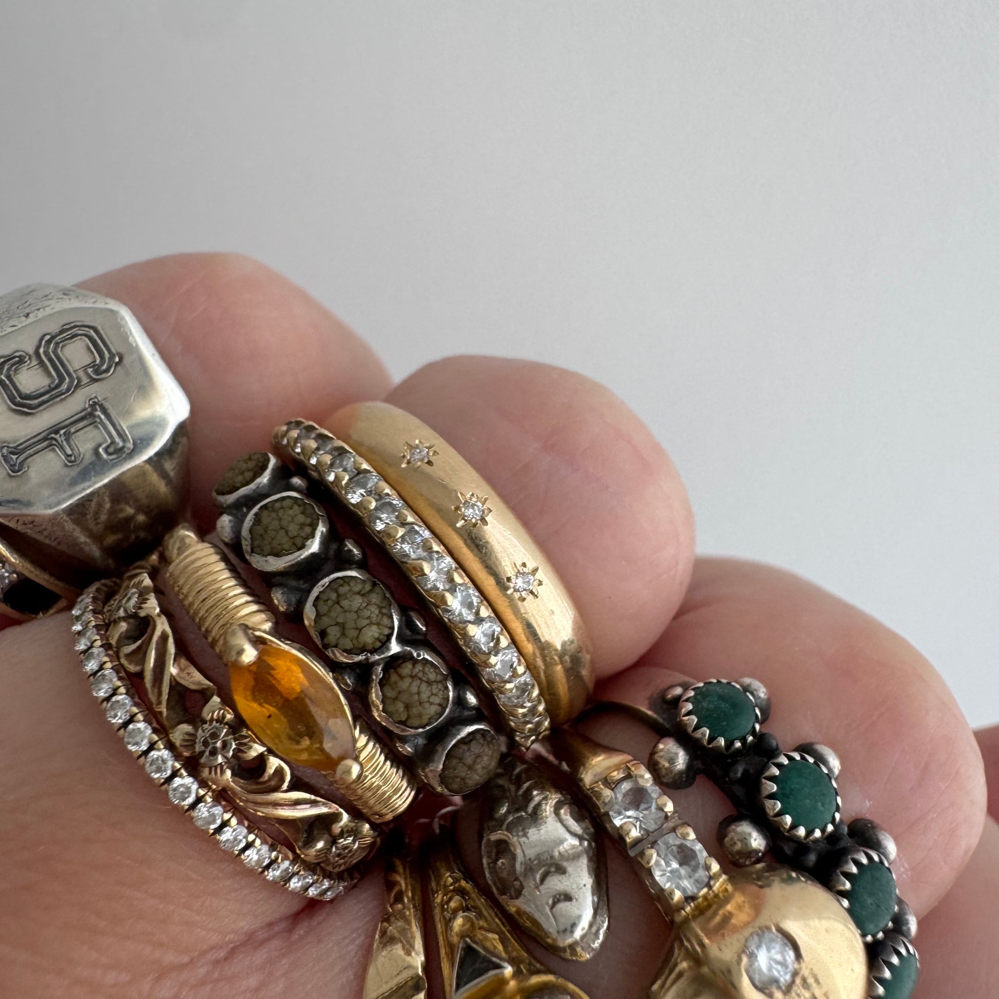 -star settings are each done by hand on a vintage band, which is extra tricky. they are neither perfectly level or equidistant and each one has eight points, but they points are all unique, like actual stars. this is the magic of a truly hand-set stone, but if you prefer precision then this isn't your perfect treasure