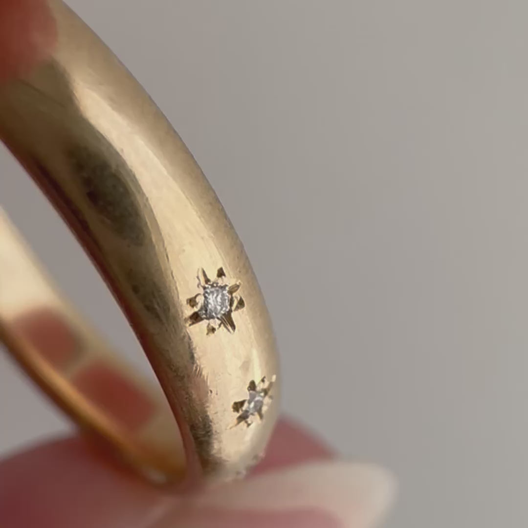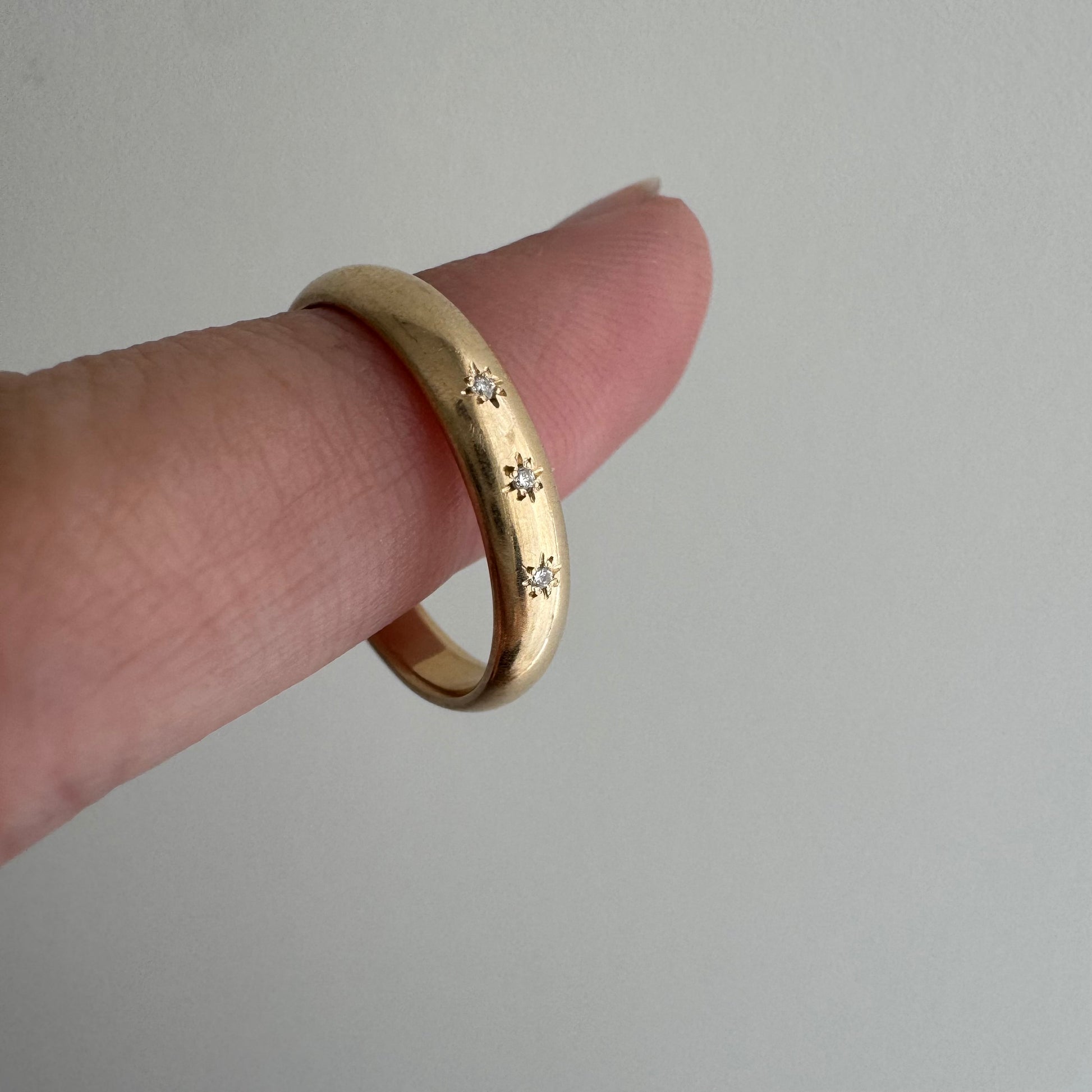 this particular band is a vintage comfort fit D-shaped band in a buttery hue of solid 14k yellow gold. the three diamonds are new round brilliant cuts. the star set diamonds are done by hand, so you'll notice they aren't perfectly equidistant or level, and each one has its own little quirks in its eight point setting. it's a wearable prayer about our connection with each other, the universe, and the magic that is in the now, which is possible only because of what has come before and what is yet to unfold