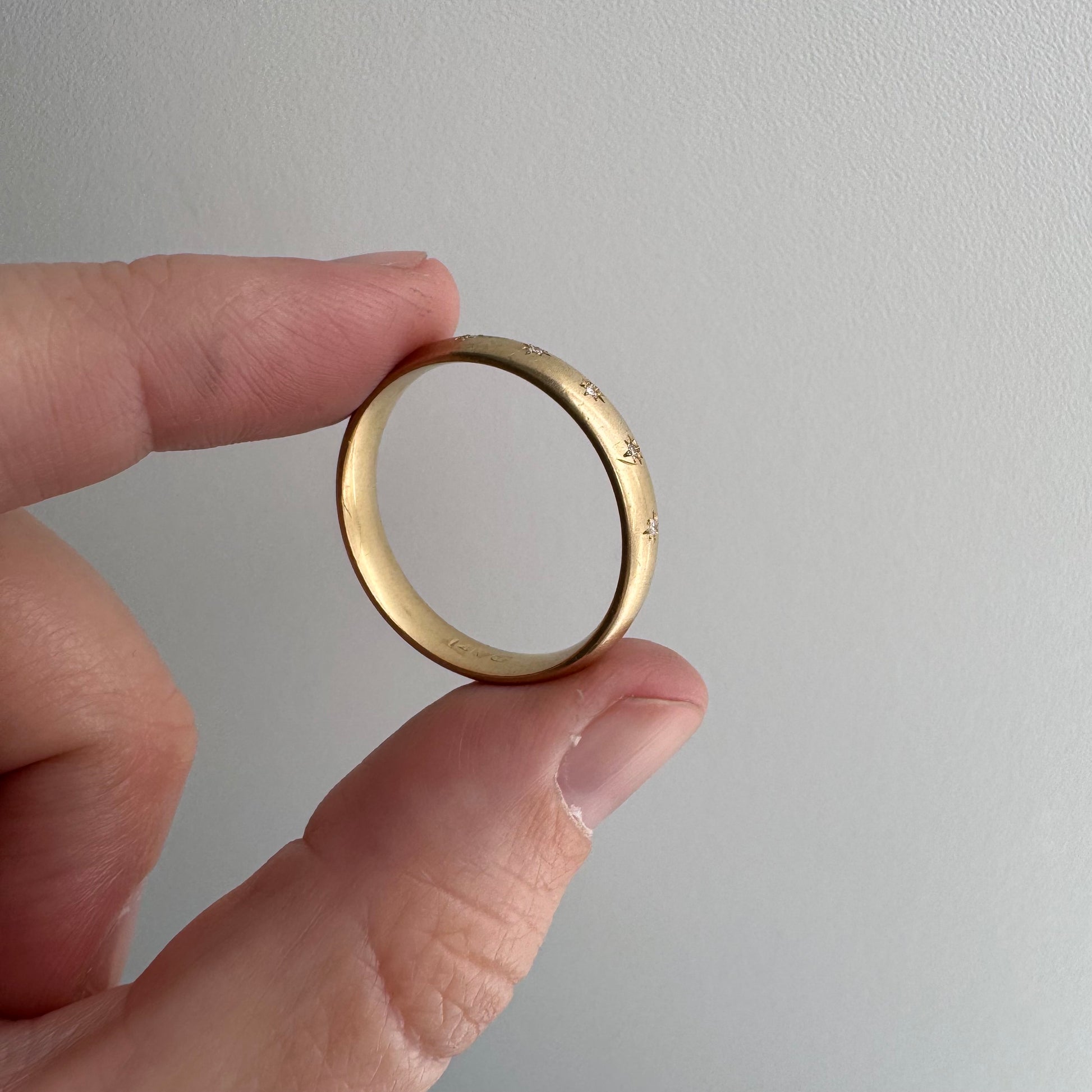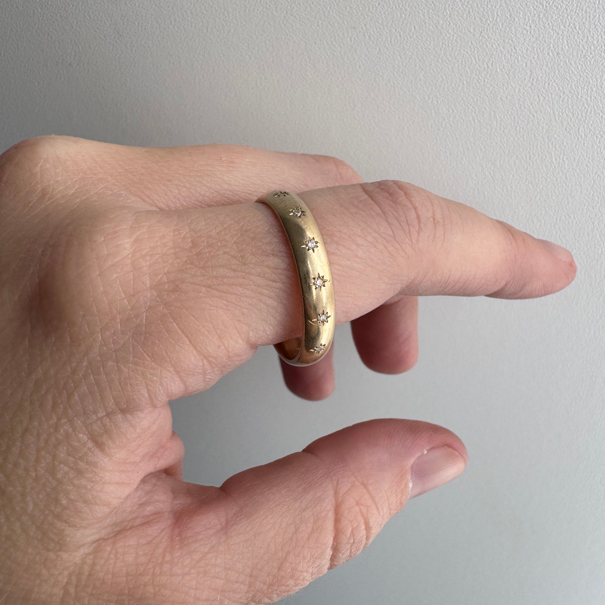 -star settings are each done by hand on a vintage band, which is extra tricky. they are neither perfectly level or equidistant and each one has eight points, but they points are all unique, like actual stars. this is the magic of a truly hand-set stone, but if you prefer precision then this isn't your perfect treasure. one of the star-set diamonds coincides with a heavier dent/scratch on the band, so it almost has a shooting star tail accidentally
