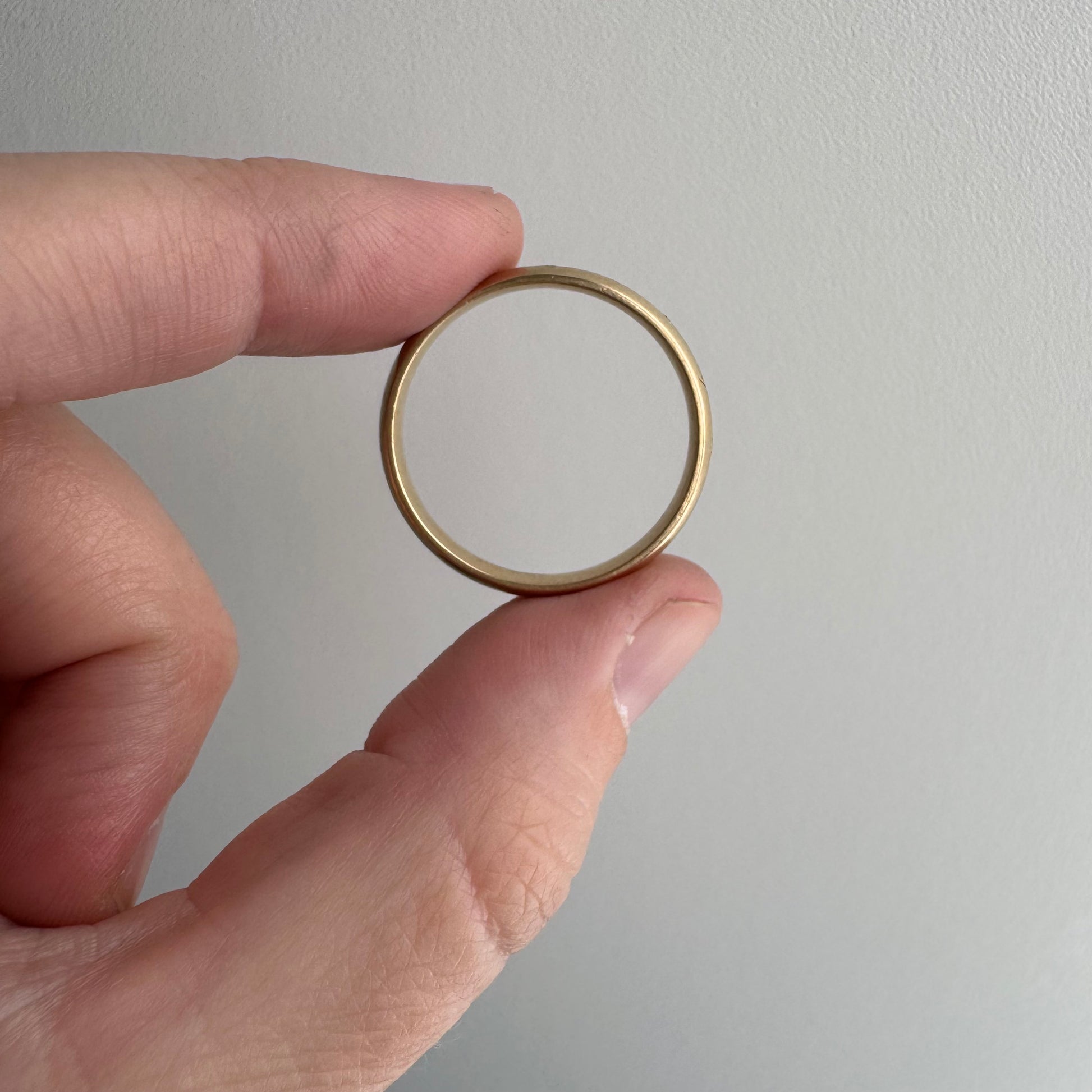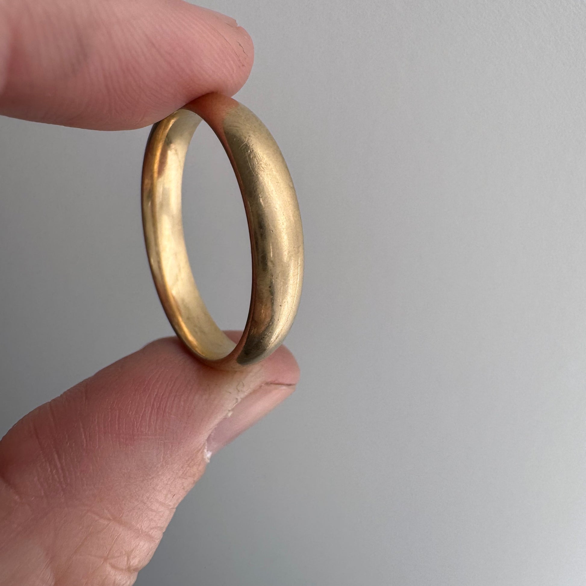 this is a vintage band so there are slight fluctuations in width from wear, and it averages to about ~4.3mm wide x ~1.65mm thick