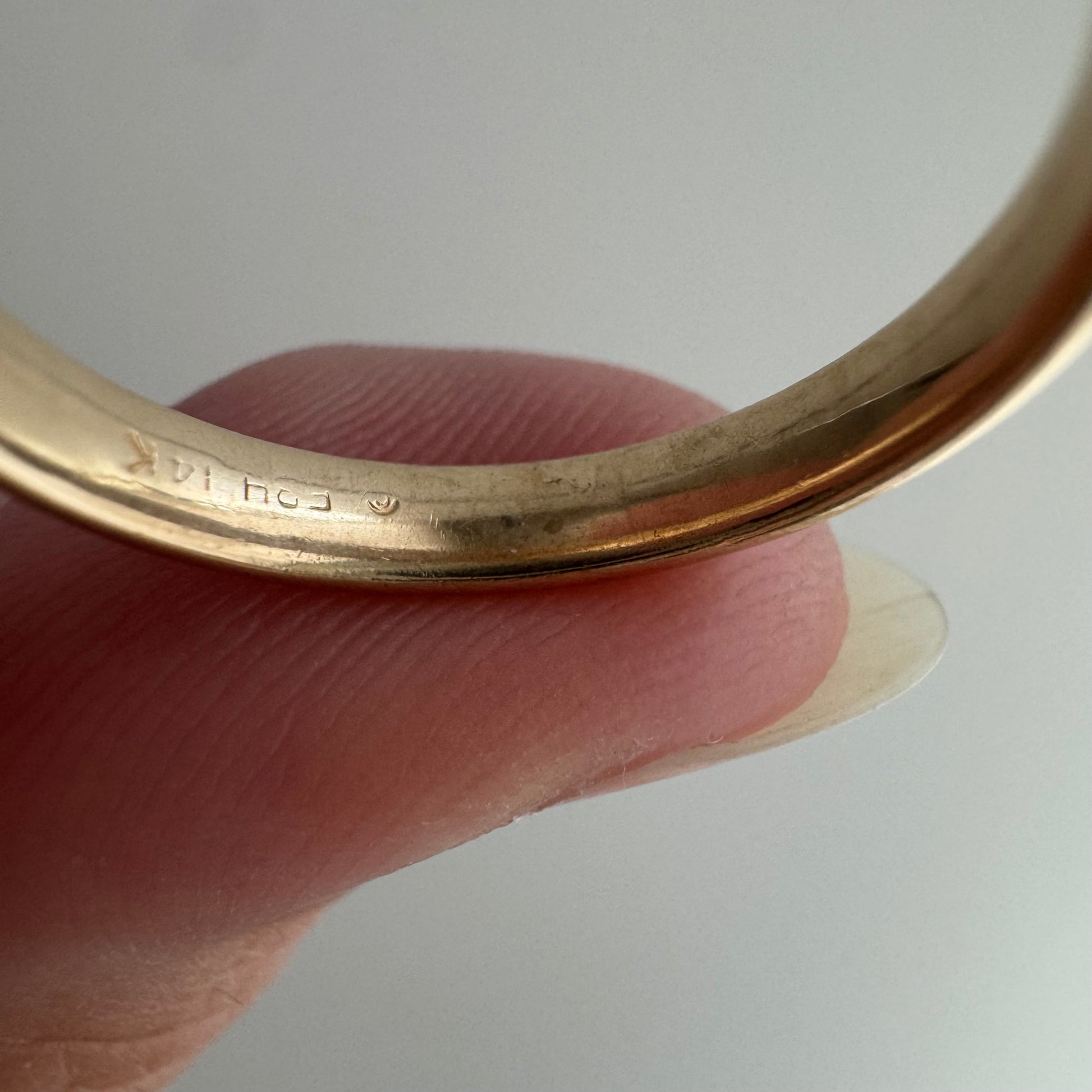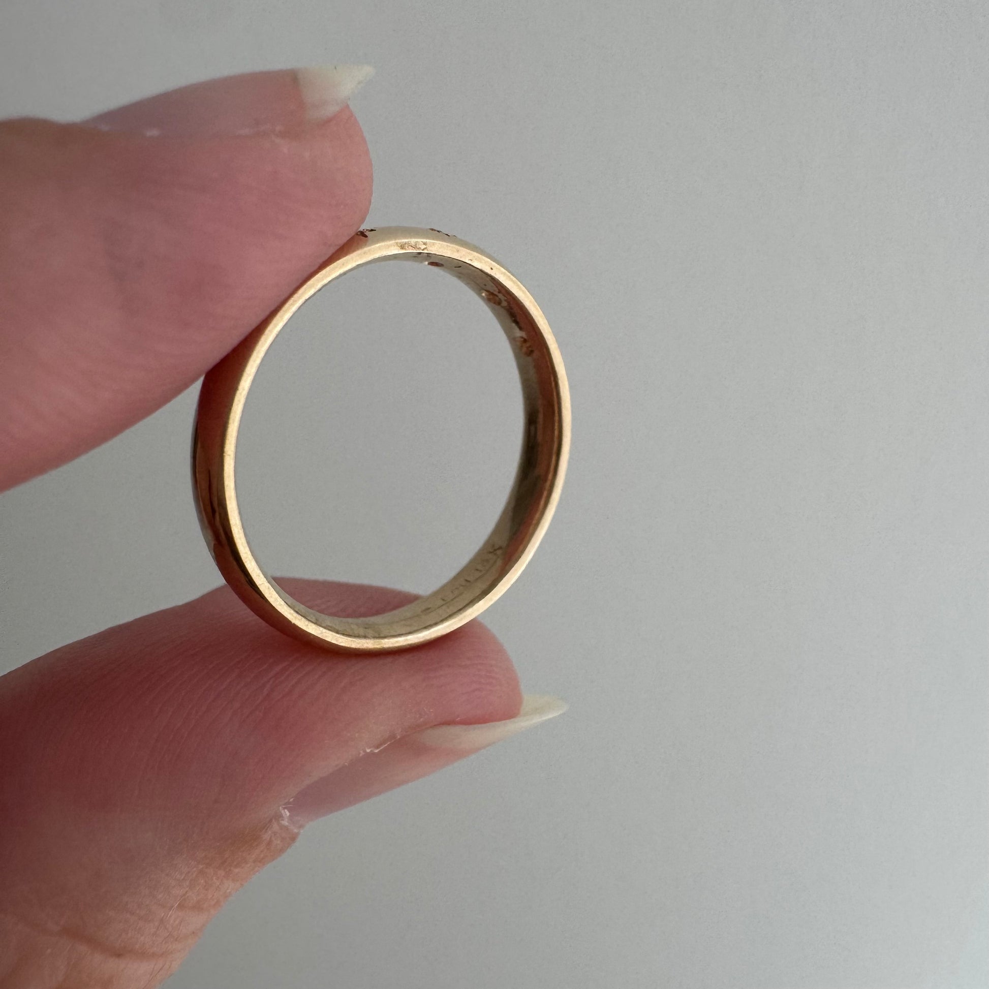 -this is a kinda quirky band in that are some inconsistencies in hue throughout the band that appear to be from impurities in the gold, rather than time-earned patina. these are a feature of the band, not something that can easily be polished out