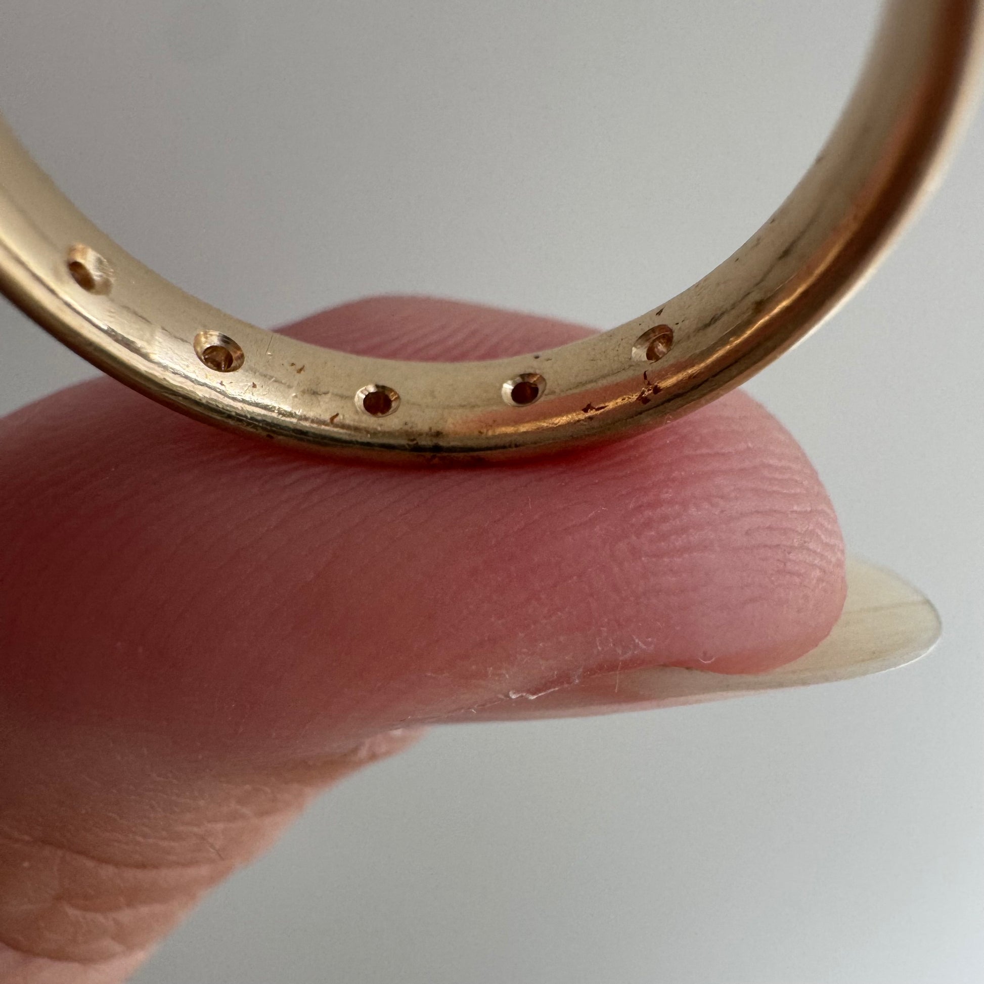 -top of the band around the stones has been polished more than the rest of the band, which means that there is a temporary minor discrepancy in luster and patina throughout the band, which will even out very quickly with wear