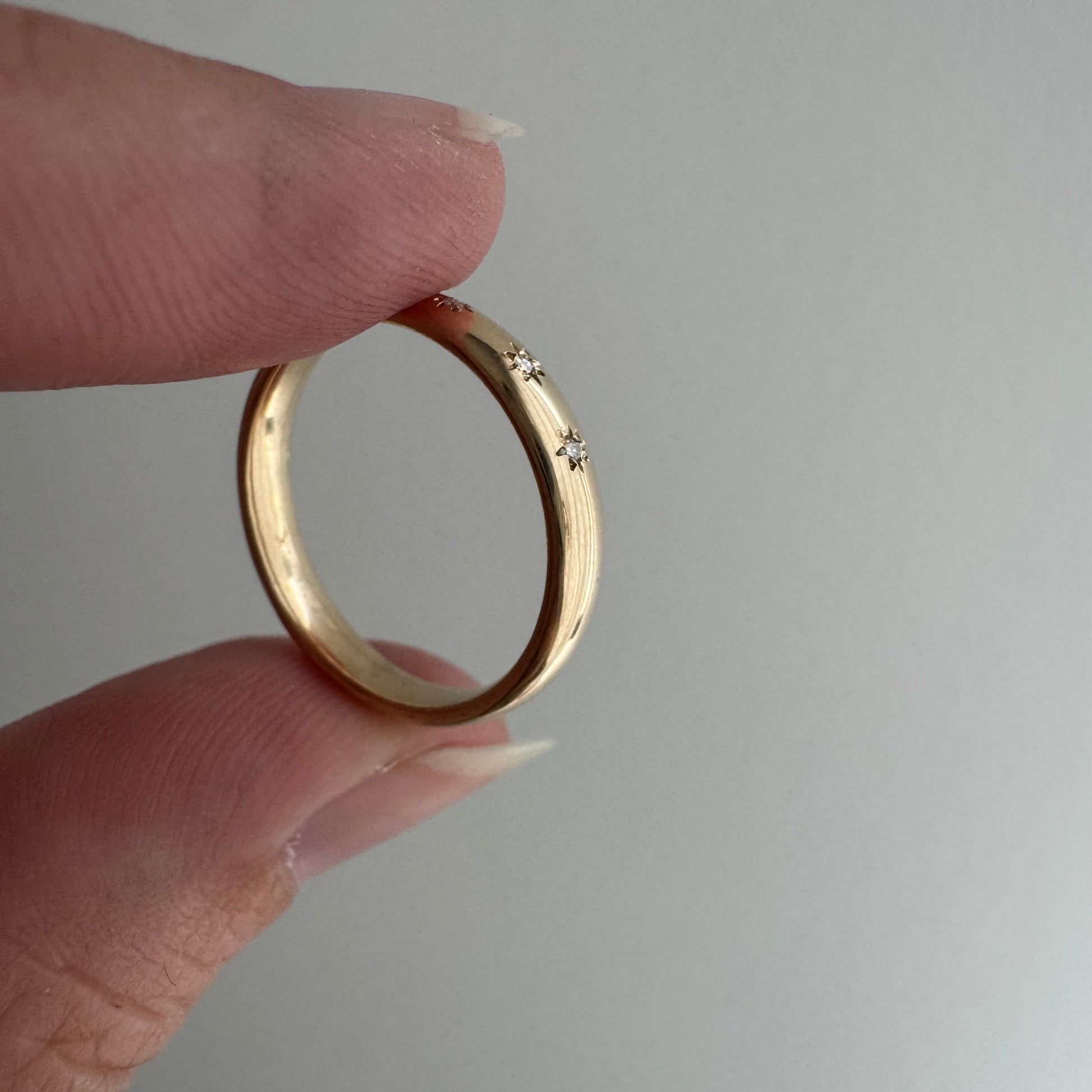 -star settings are each done by hand on a vintage band, which is extra tricky. they are neither perfectly level or equidistant and each one has eight points, but they points are all unique, like actual stars. this is the magic of a truly hand-set stone, but if you prefer precision then this isn't your perfect treasure