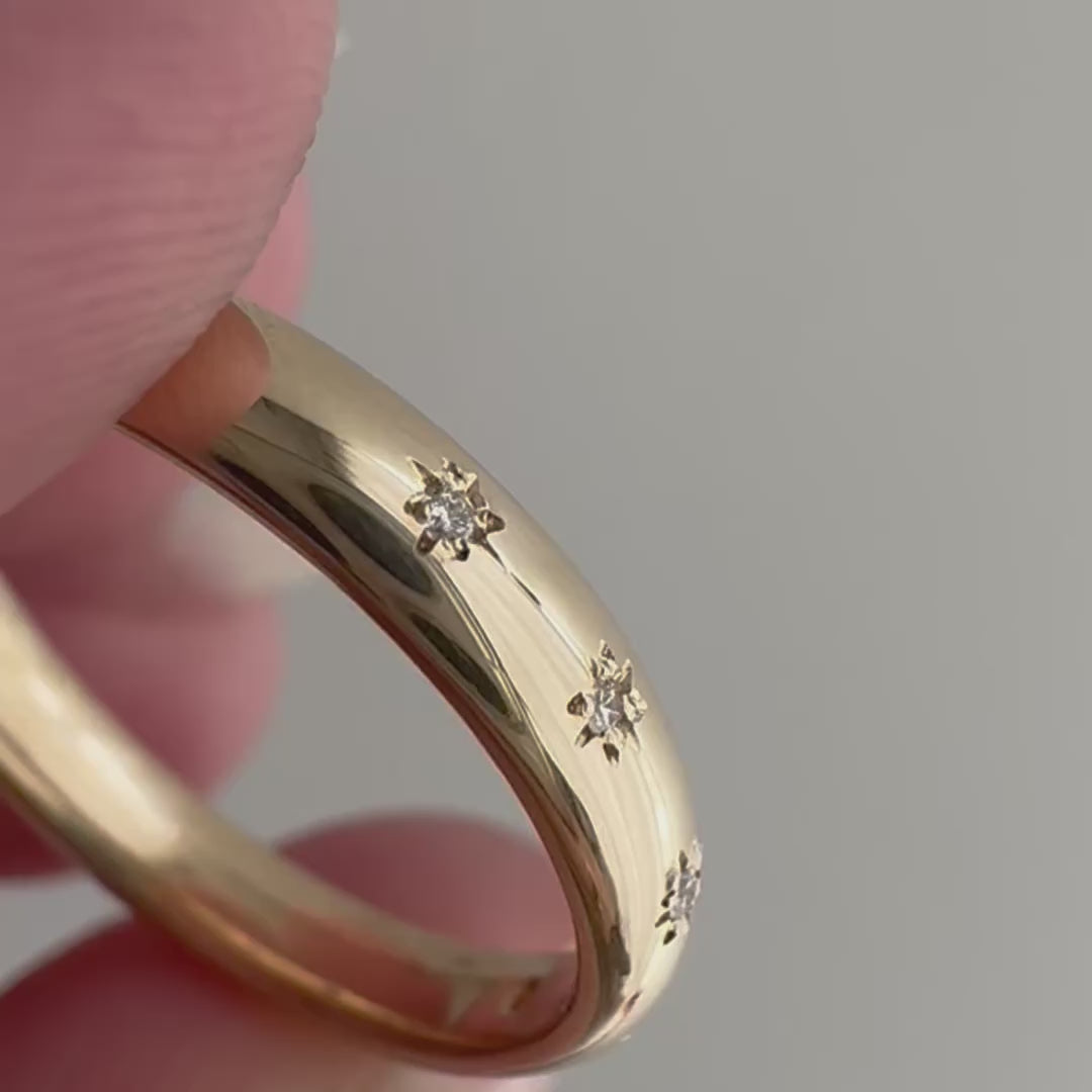 this particular band is a comfort fit band in a buttery hue of solid 14k yellow gold. the five diamonds are new round brilliant cuts. the star set diamonds are done by hand, so you'll notice they aren't perfectly equidistant or level, and each one has its own little quirks in its eight point setting. it's a wearable prayer about our connection with each other, the universe, and the magic that is in the now, which is possible only because of what has come before and what is yet to unfold