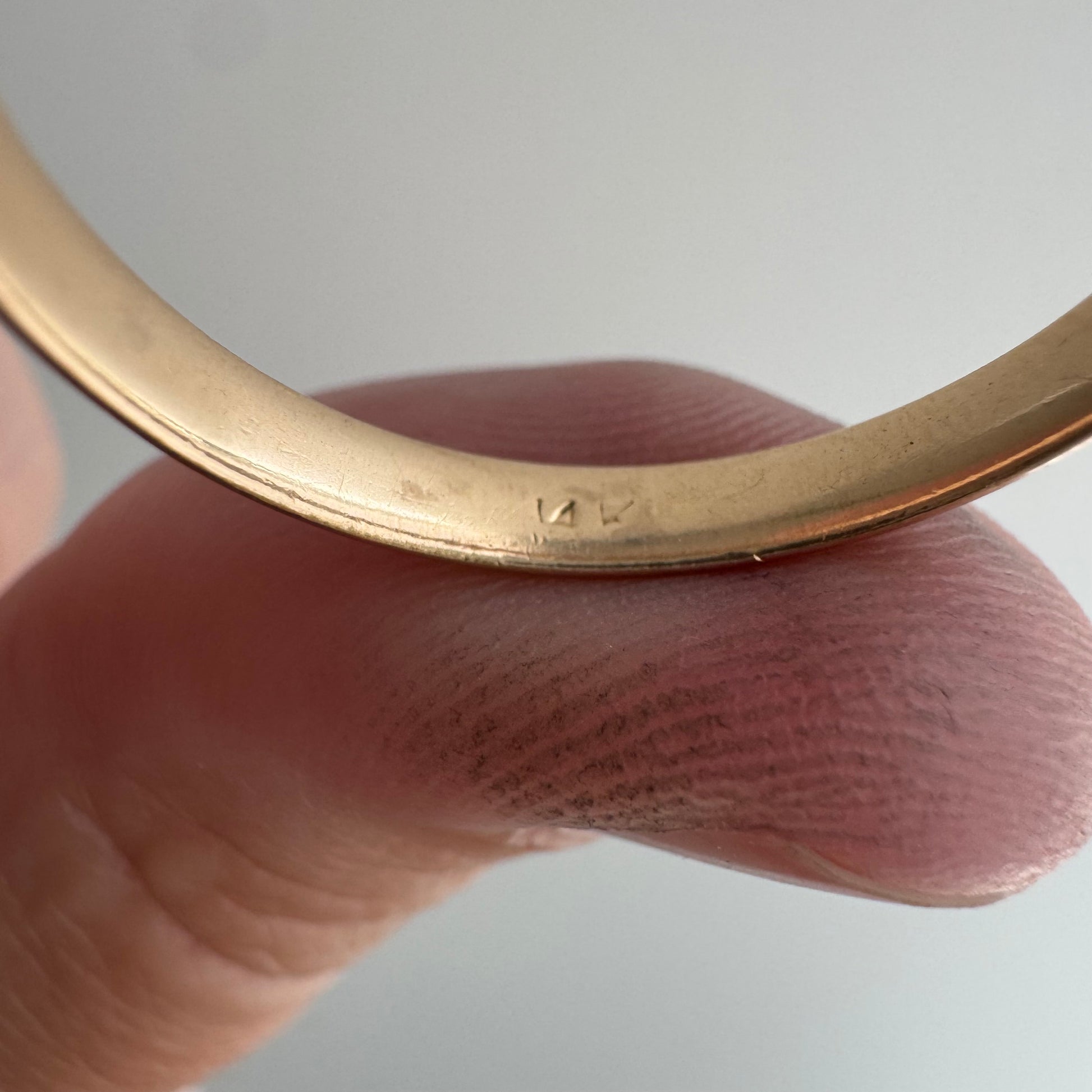 this particular band is a 1980s D-shaped band in a buttery, warm hue of solid 14k yellow gold. the seven diamonds are new round brilliant cuts. the star set diamonds are done by hand, so you'll notice they aren't perfectly equidistant or level, and each one has its own little quirks in its eight point setting. it's a wearable prayer about our connection with each other, the universe, and the magic that is in the now, which is possible only because of what has come before and what is yet to unfold