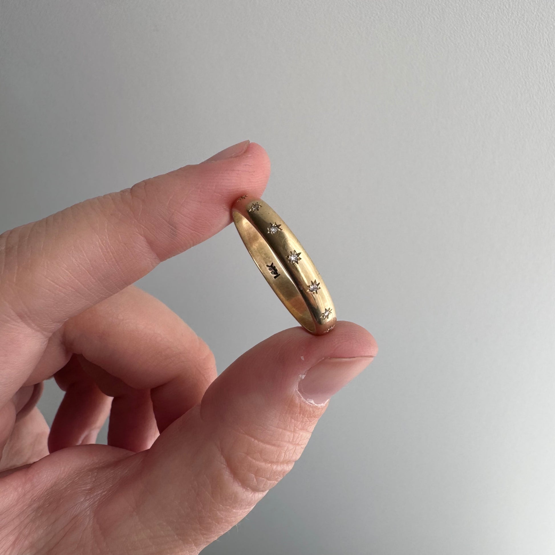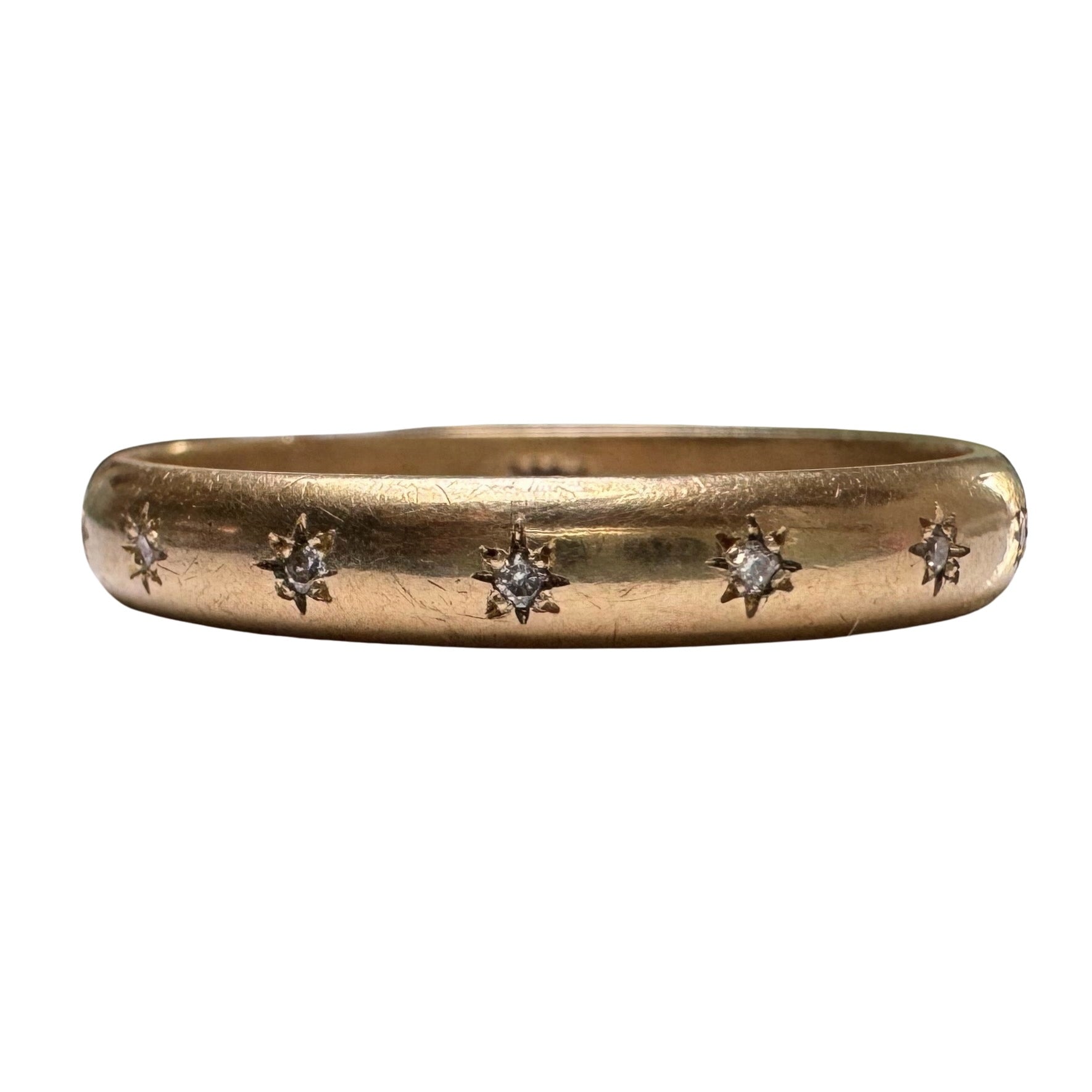 this particular band is a 1980s D-shaped band in a buttery yellow hue of solid 14k yellow gold. the seven diamonds are new round brilliant cuts. the star set diamonds are done by hand, so you'll notice they aren't perfectly equidistant or level, and each one has its own little quirks in its eight point setting. it's a wearable prayer about our connection with each other, the universe, and the magic that is in the now, which is possible only because of what has come before and what is yet to unfold