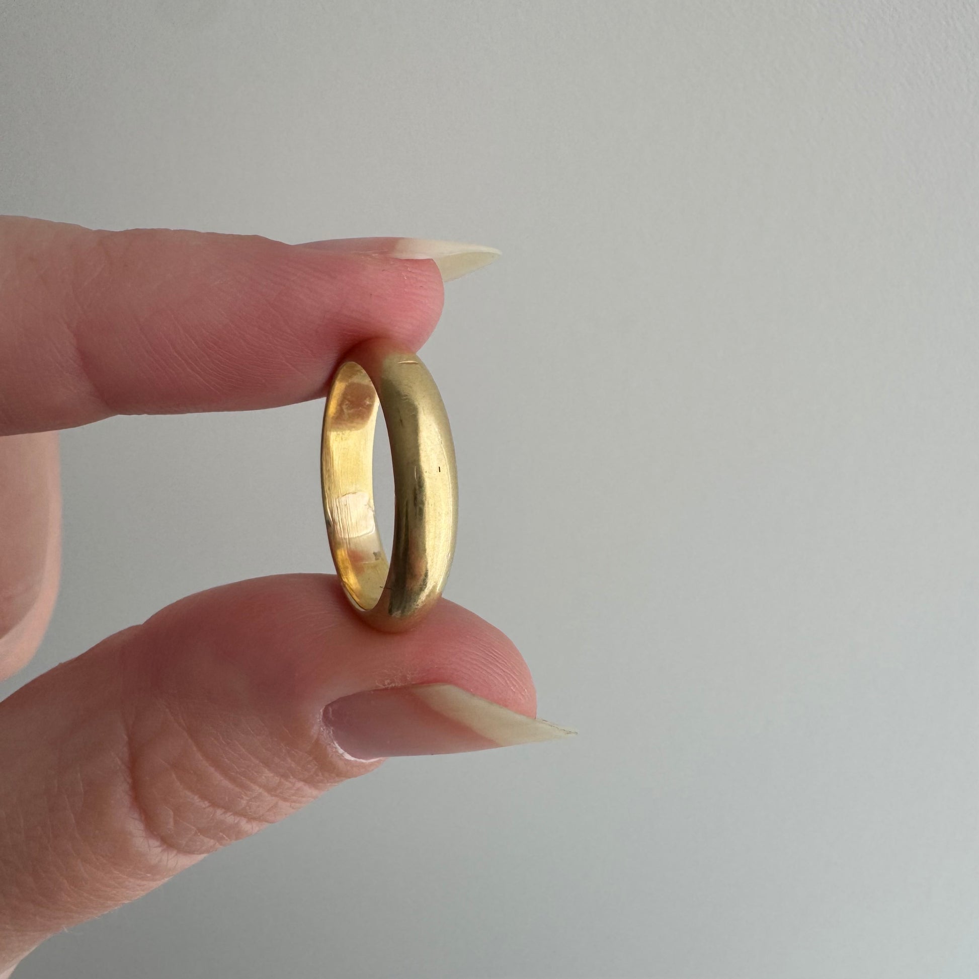 this is likely a handmade antique band so there are slight fluctuations in width from wear, and it averages to about ~3.8mm wide x ~1.65mm thick