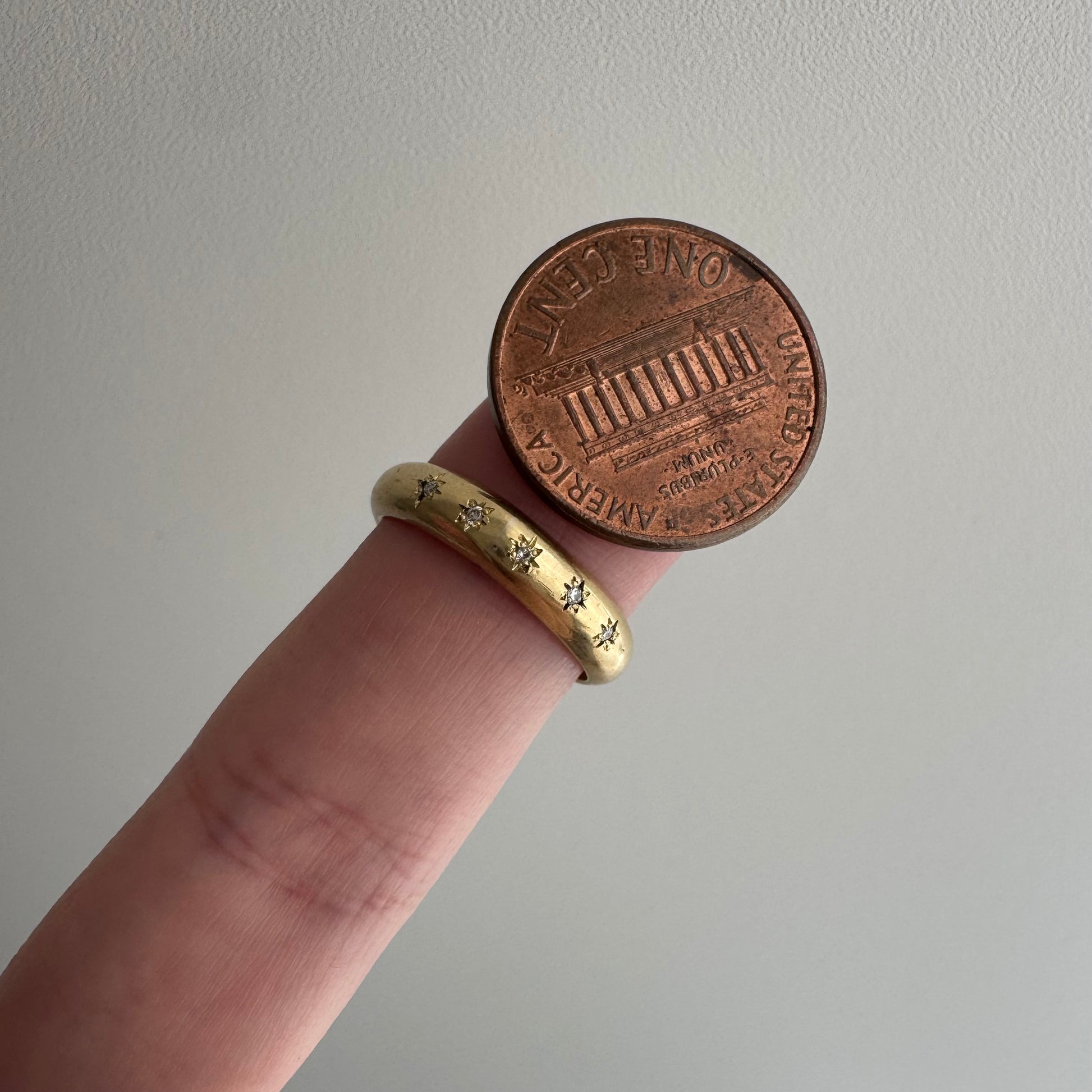 this particular band is a plump, donut band in a rich, buttery bright yellow hue of 14k that has enough blue undertones that it's almost green gold. the five diamonds are new round brilliant cuts. the star set diamonds are done by hand, so you'll notice they aren't perfectly equidistant or level, and each one has its own little quirks in its eight point setting. it's a wearable prayer about our connection with each other, the universe, and the magic that is in the now, which is possible only because of what has come before and what is yet to unfold