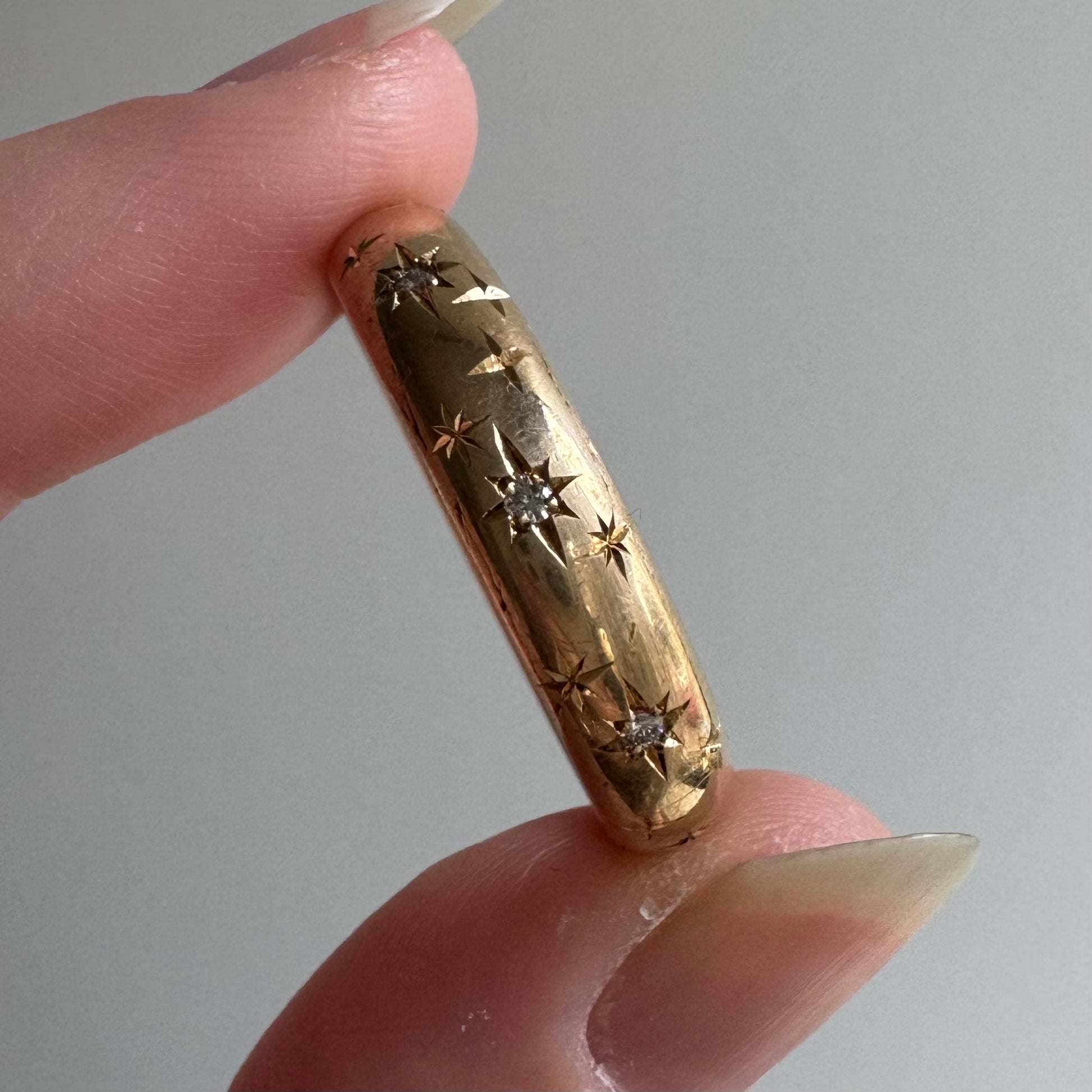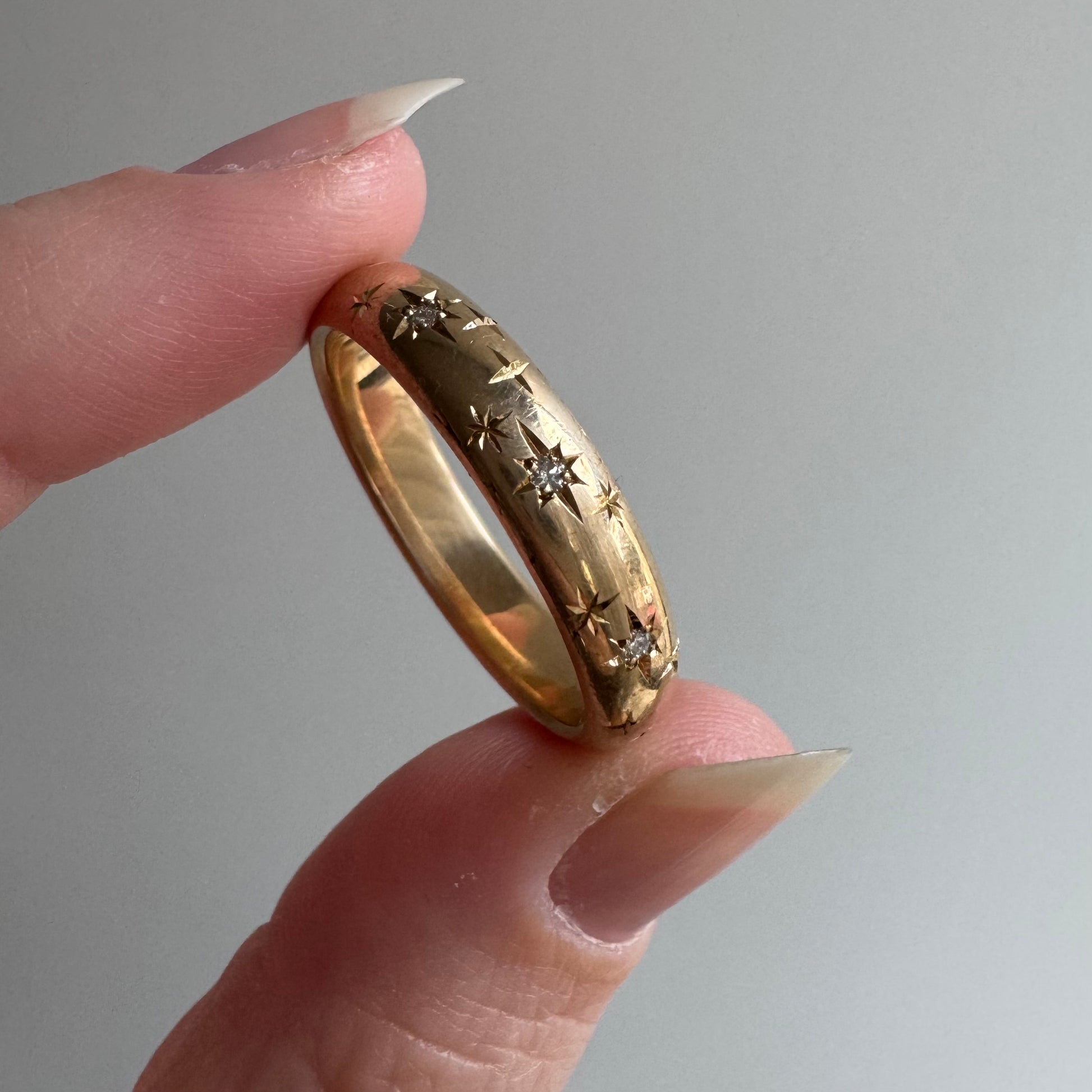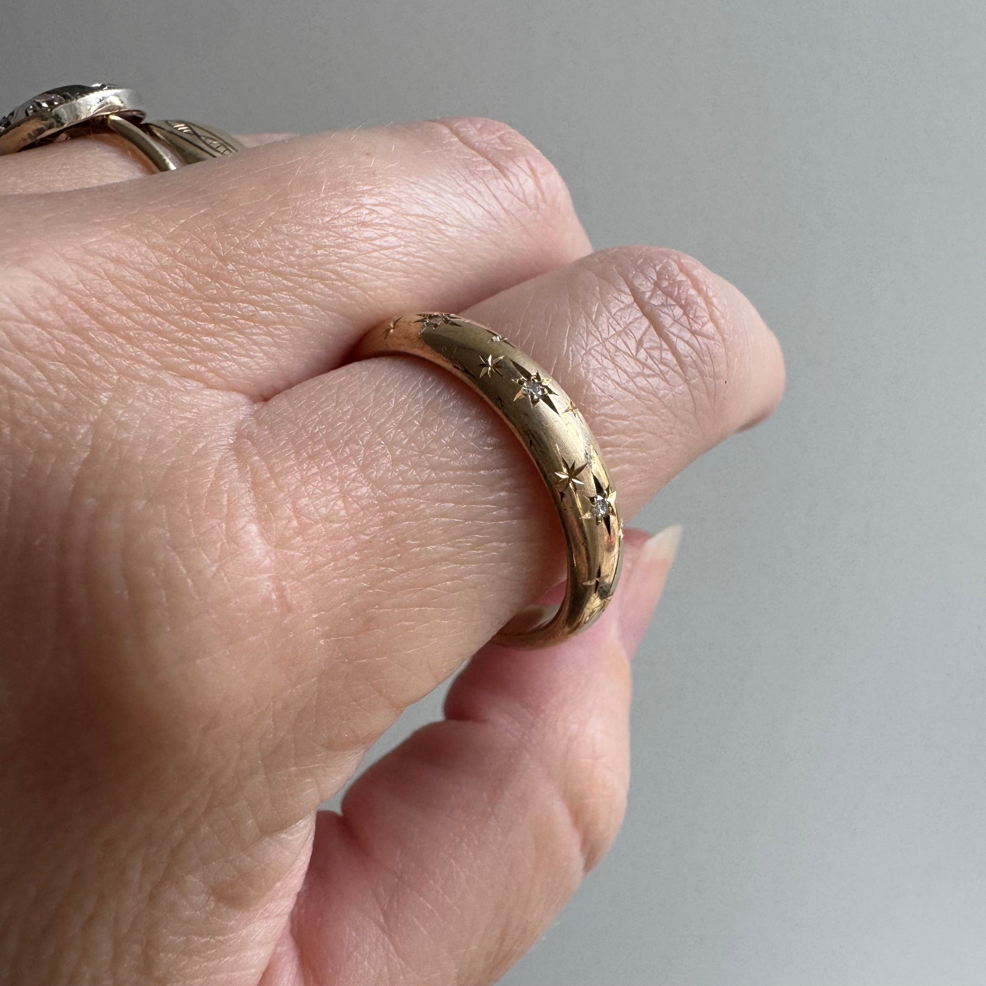 reimagined V I N T A G E // star story / 14k donut band with three new star-set diamonds and engraved starbursts / size 11 to 11.5