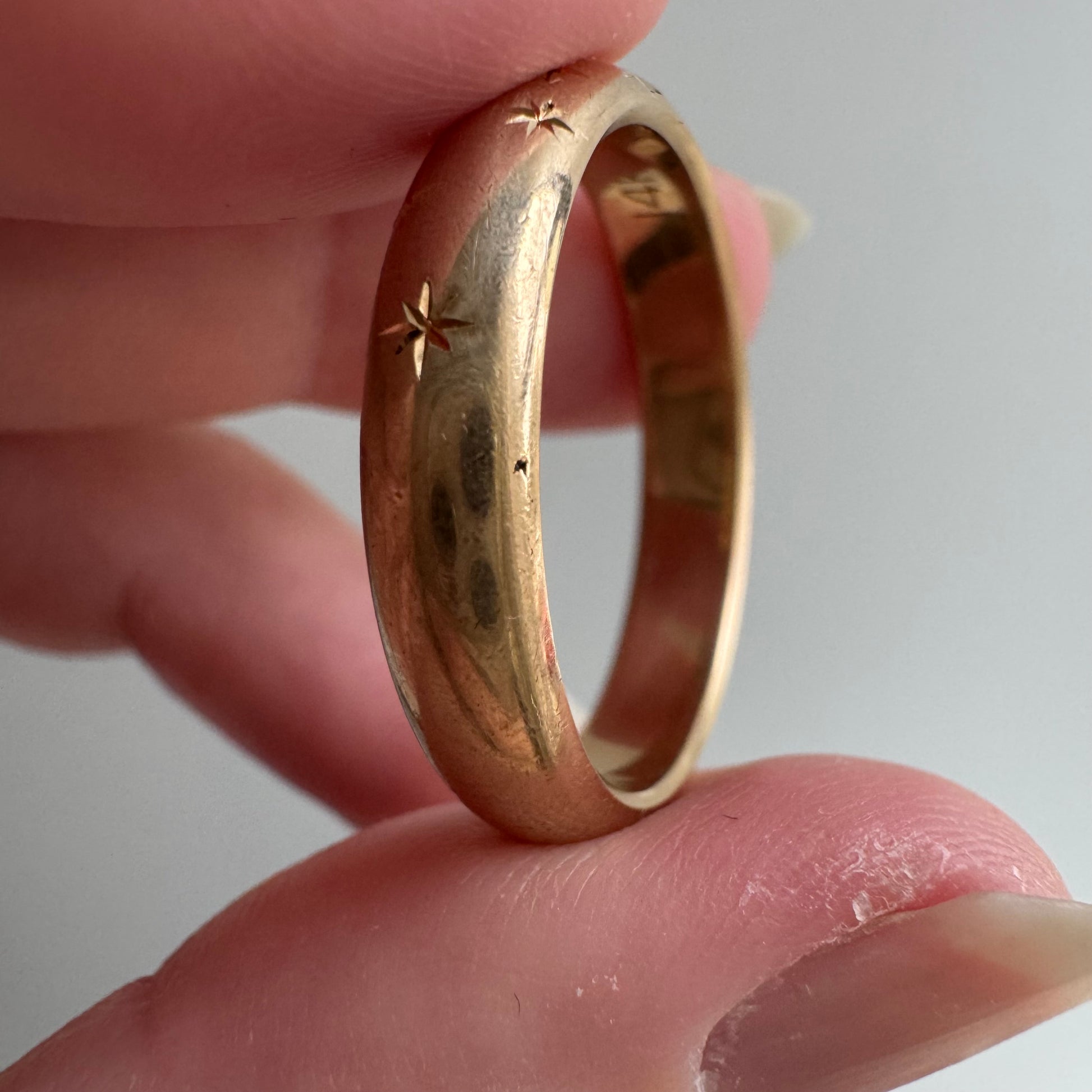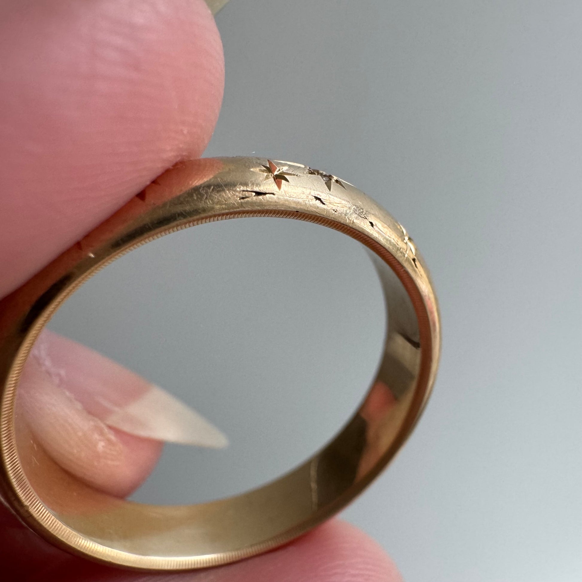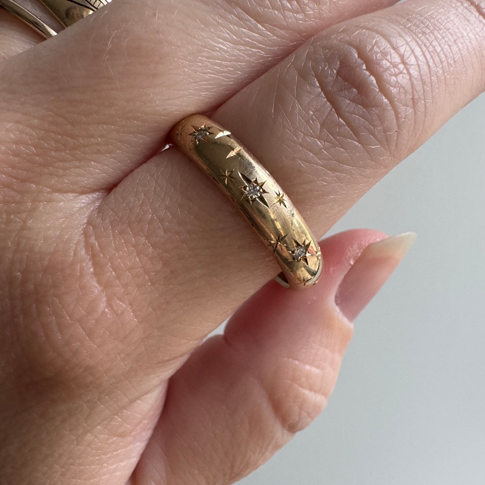 reimagined V I N T A G E // star story / 14k donut band with three new star-set diamonds and engraved starbursts / size 11 to 11.5