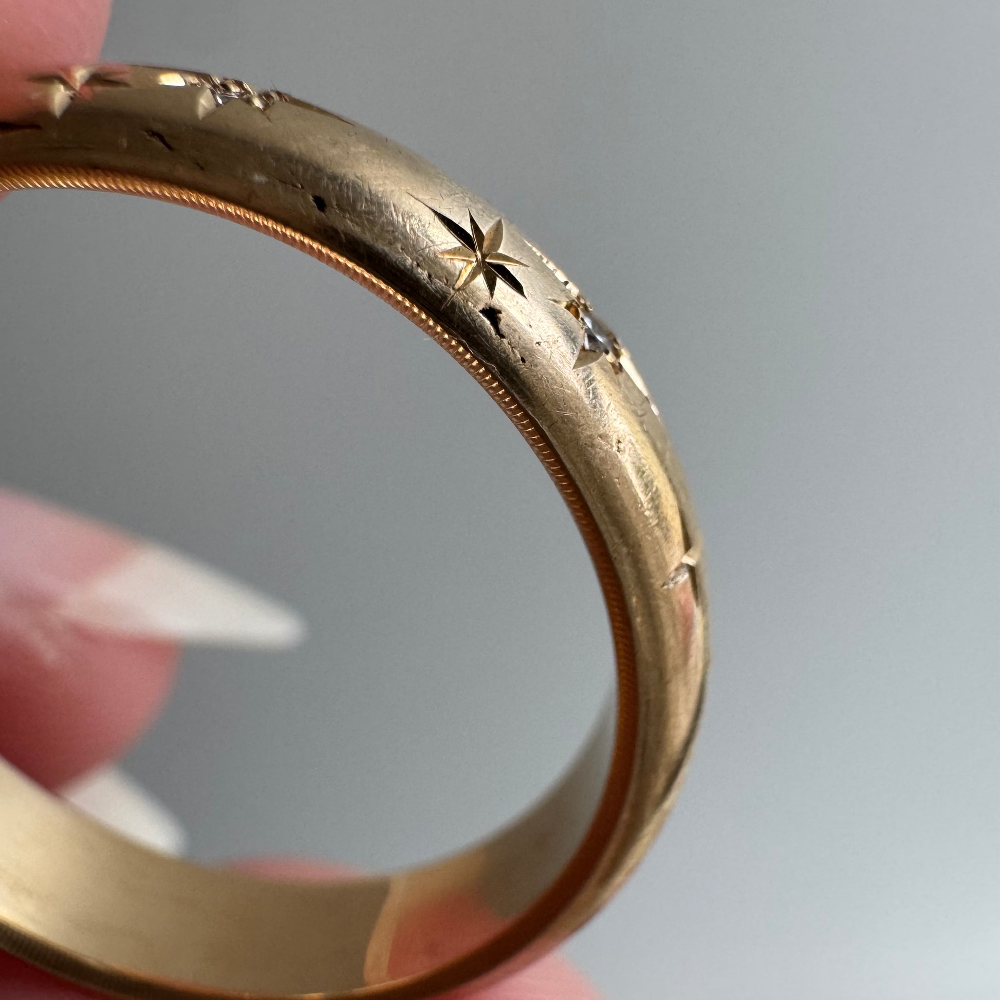 this particular band is a plump, donut-y, comfort-fit band in a coveted larger size. the band is circa ~1960s and is a rich, buttery hue of solid 14k yellow gold. the diamonds are new round brilliant cuts. the star set diamonds and engraved starbursts are done by hand, so you'll notice they aren't perfectly equidistant or level, and each one has its own little quirks in its eight point setting. it's a wearable prayer about our connection with each other, the universe, and the magic that is in the now, which is possible only because of what has come before and what is yet to unfold