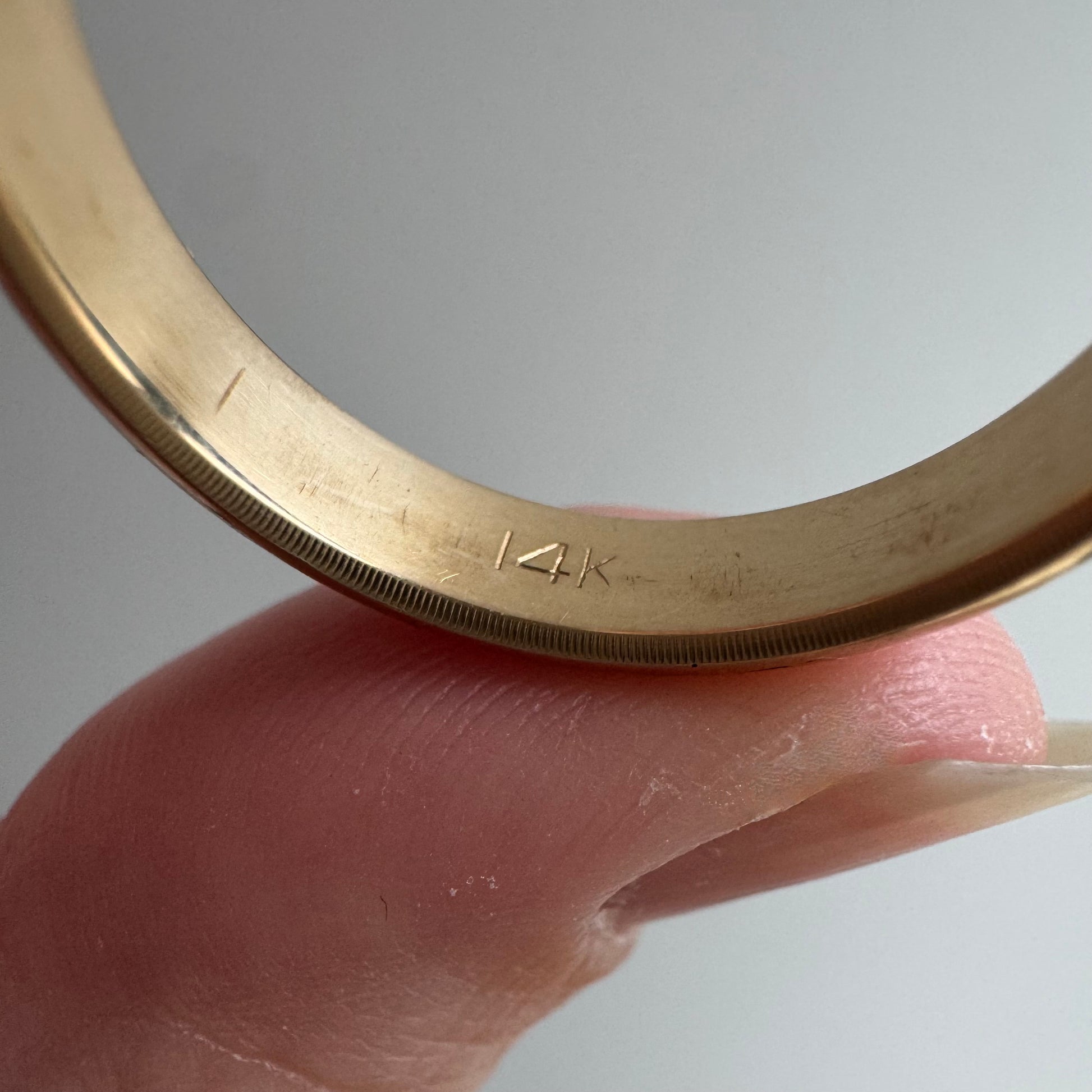 -top of the band around the stones has been polished more than the rest of the band, which means that there is a temporary minor discrepancy in luster and patina throughout the band, which will even out very quickly with wear