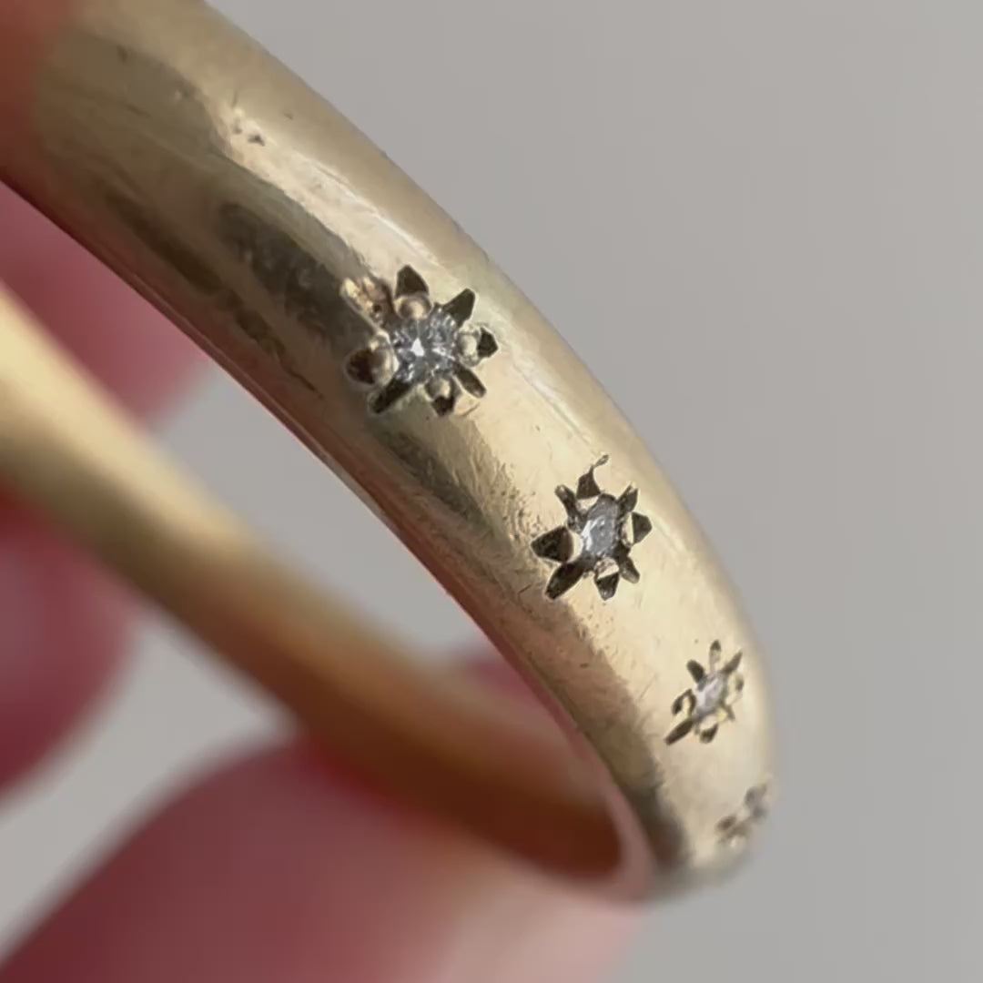 -star settings are each done by hand on a vintage band, which is extra tricky. they are neither perfectly level or equidistant and each one has eight points, but they points are all unique, like actual stars. this is the magic of a truly hand-set stone, but if you prefer precision then this isn't your perfect treasure