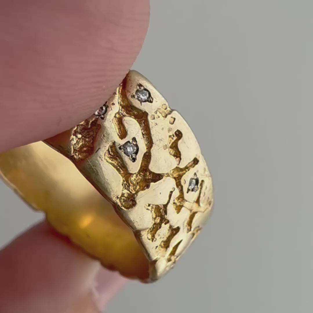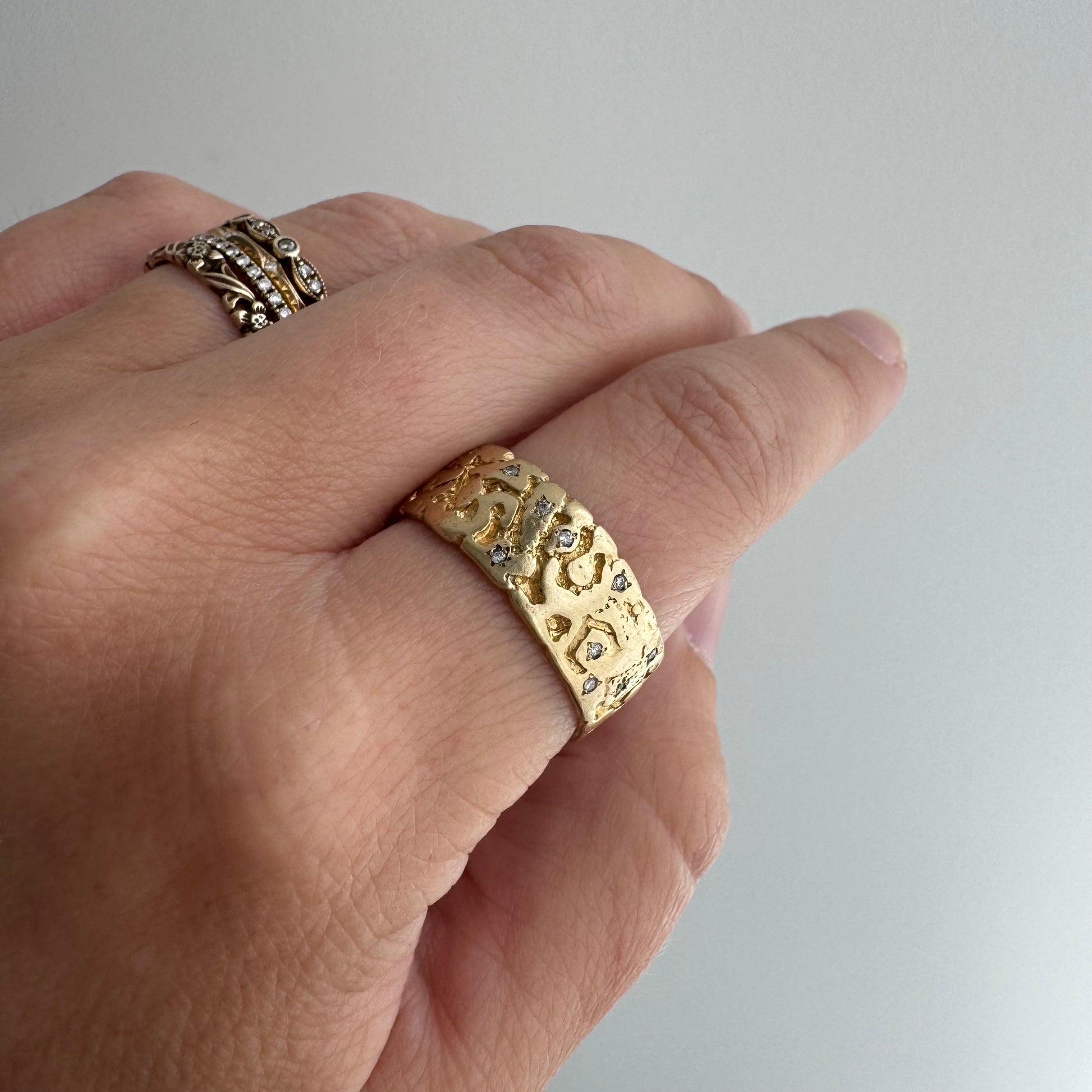 this particular band is a rustic nugget style wide, sturdy band in a buttery hue of solid 14k yellow gold. the 23 diamonds are new round brilliant cuts. the star set diamonds are done by hand, so you'll notice that each one has its own little quirks. And, because of the design of the nugget band the diamonds range from having three to six points. it's a wearable prayer about our connection with each other, the universe, and the magic that is in the now, which is possible only because of what has come before and what is yet to unfold