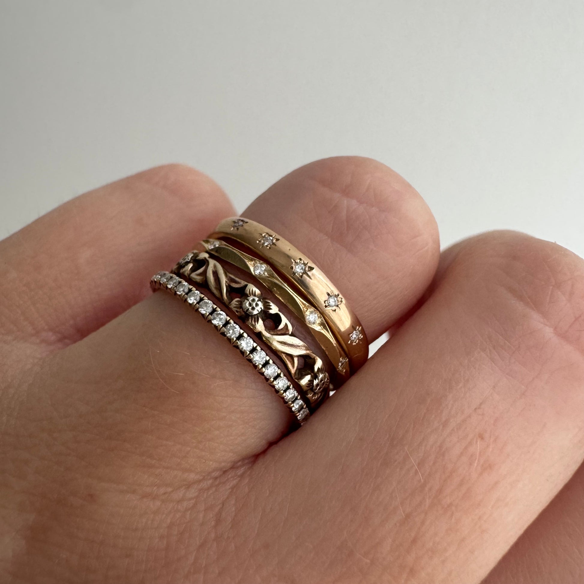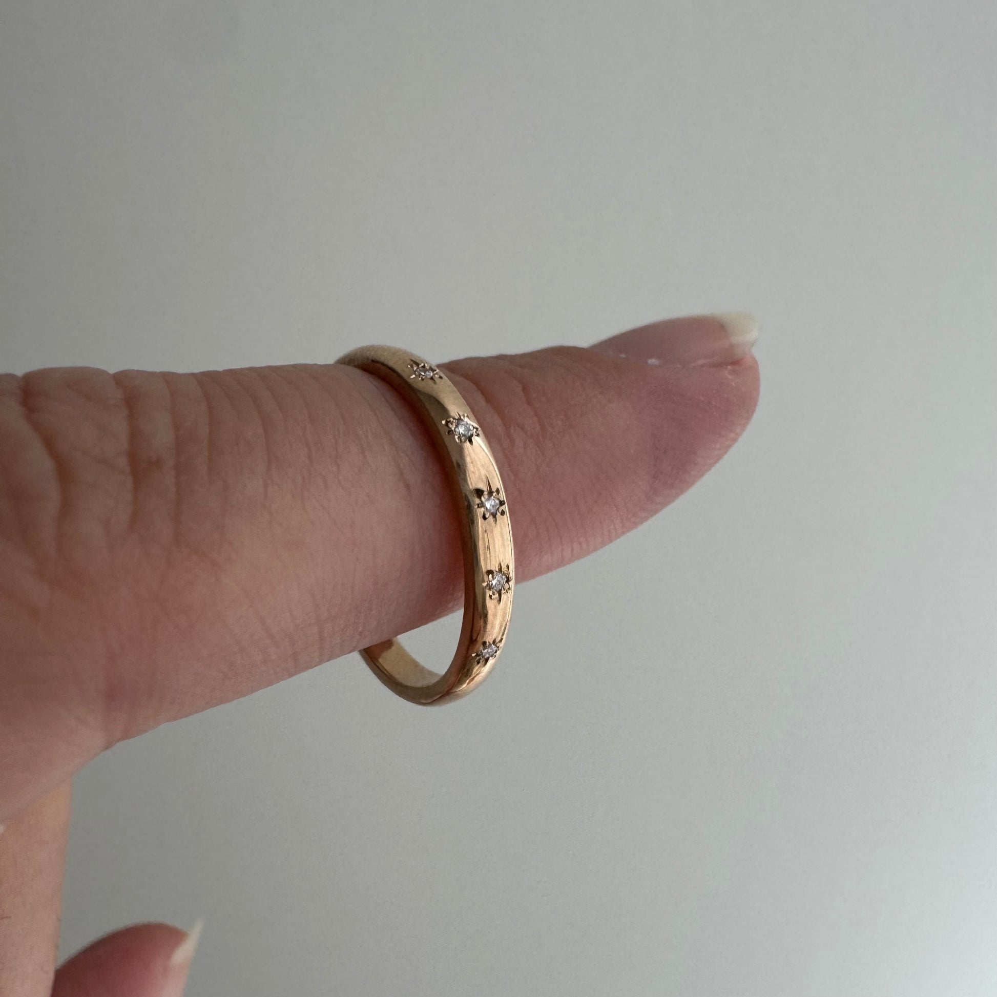 -star settings are each done by hand on a vintage band, which is extra tricky. they are neither perfectly level or equidistant and each one has eight points, but they points are all unique, like actual stars. this is the magic of a truly hand-set stone, but if you prefer precision then this isn't your perfect treasure