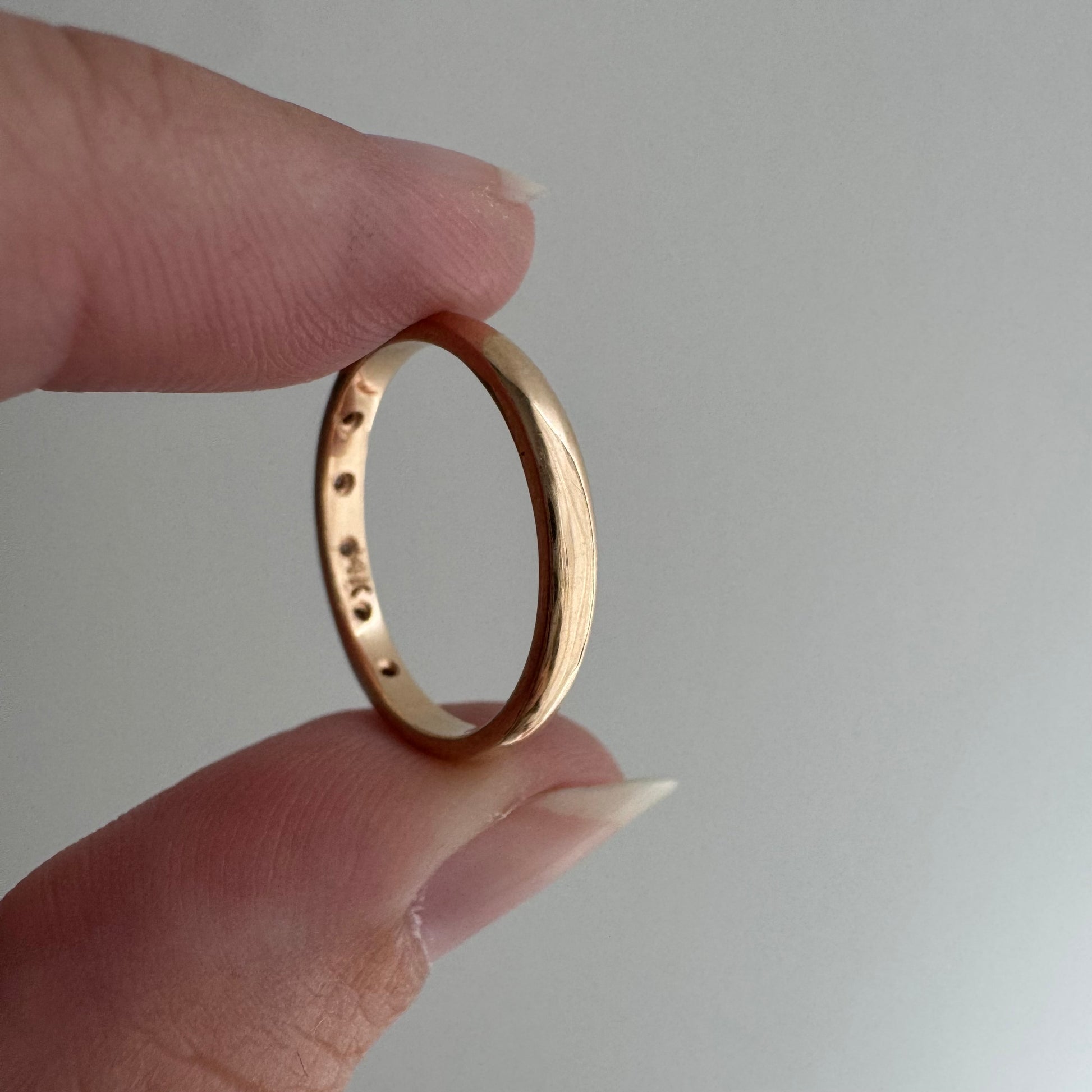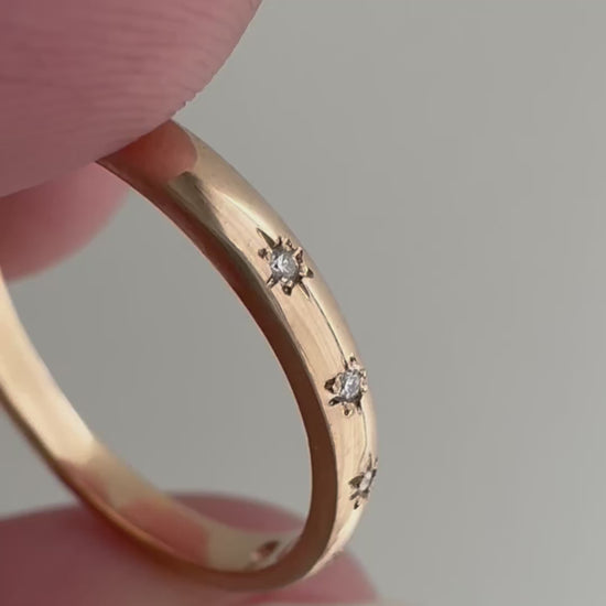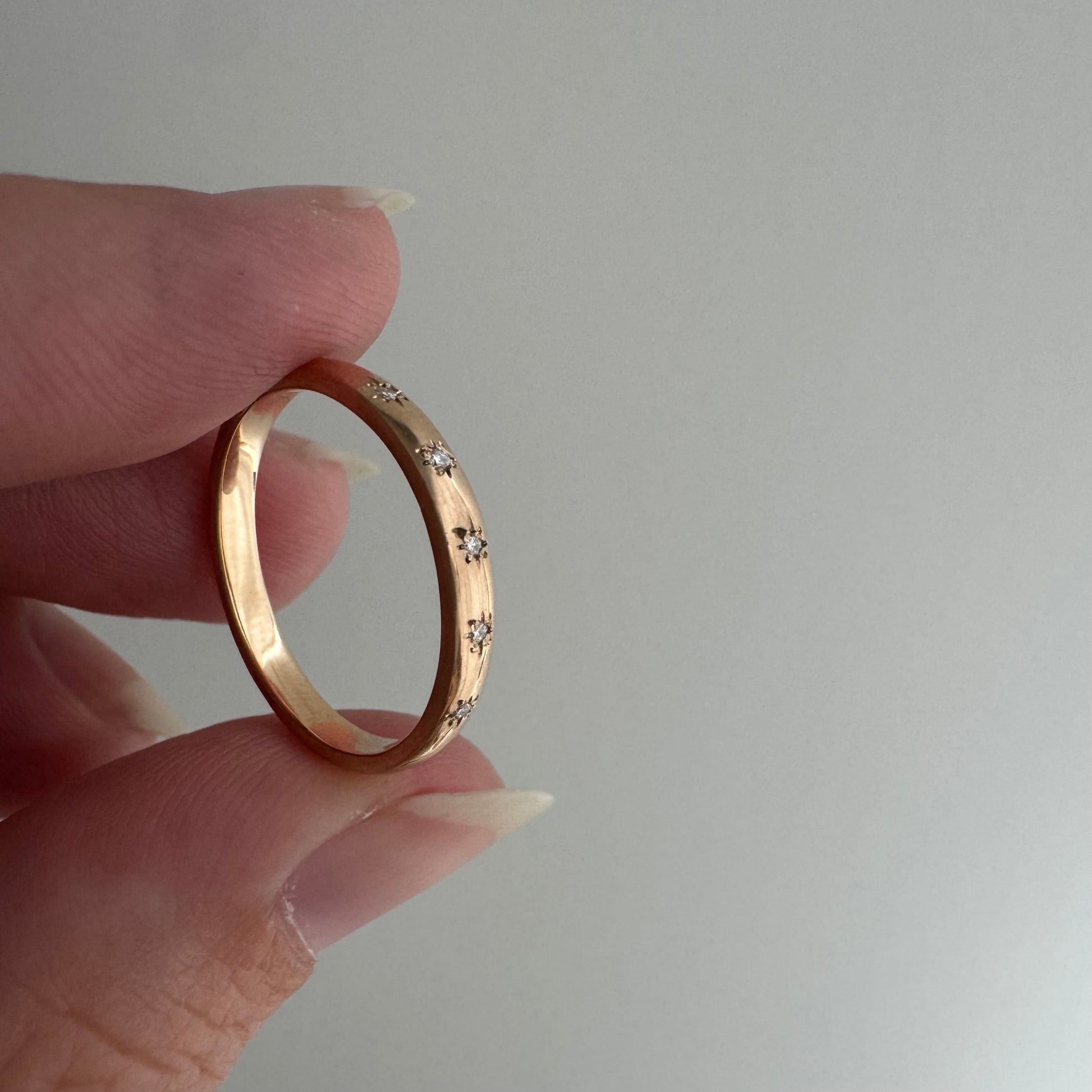 this particular band is a plump pipe cut band that's similar to a dainty donut in a slightly rosy hue of solid 14k yellow gold. the five diamonds are new round brilliant cuts. the star set diamonds are done by hand, so you'll notice they aren't perfectly equidistant or level, and each one has its own little quirks in its eight point setting. it's a wearable prayer about our connection with each other, the universe, and the magic that is in the now, which is possible only because of what has come before and what is yet to unfold