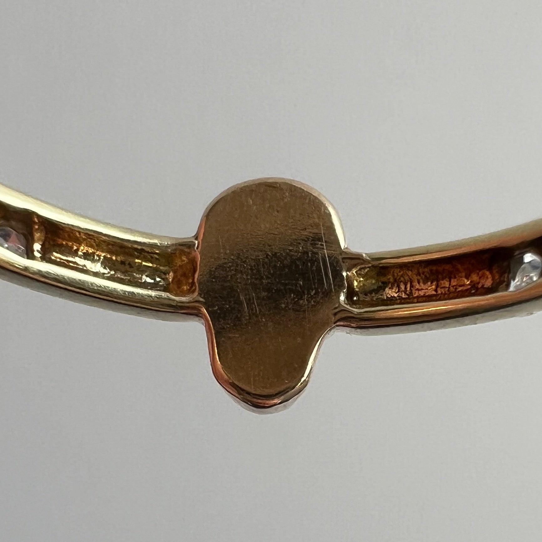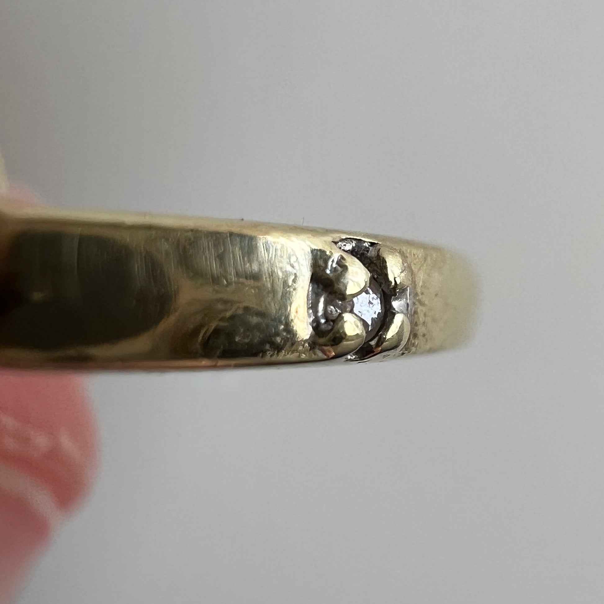 the band has surface scratches, dents and dings and the prongs around the tiny diamonds are fairly worn, but securely holding the diamonds in place