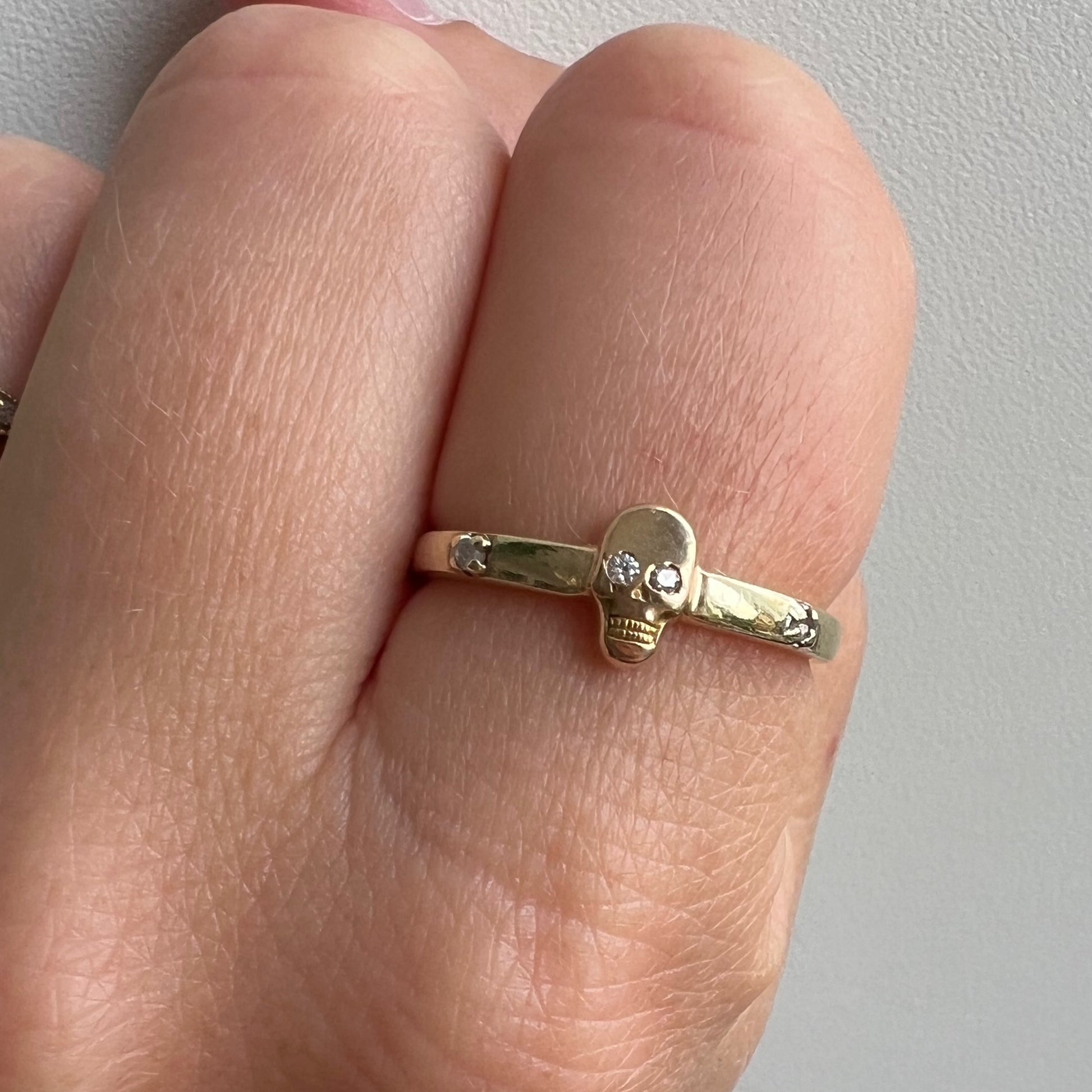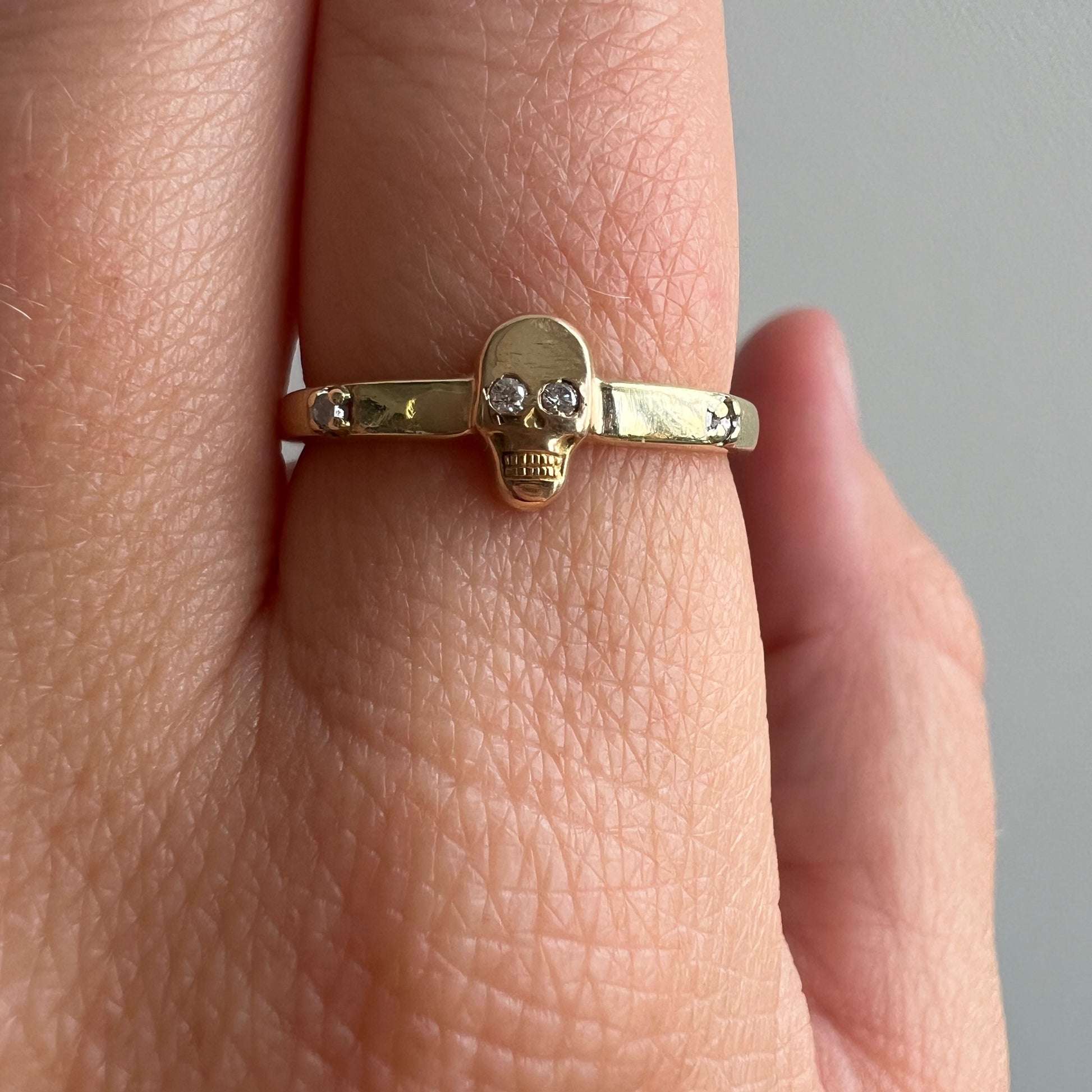 the slightly rose gold 10k skull came from an old fraternal pin, which I lovingly hand filed the Greek enameled letters off of. I sourced a perfect, pre-loved 10k yellow gold band with diamond accents. My brilliant jeweler swapped the paste eyes for diamonds, removed the hardware, and laser soldered the piece together.