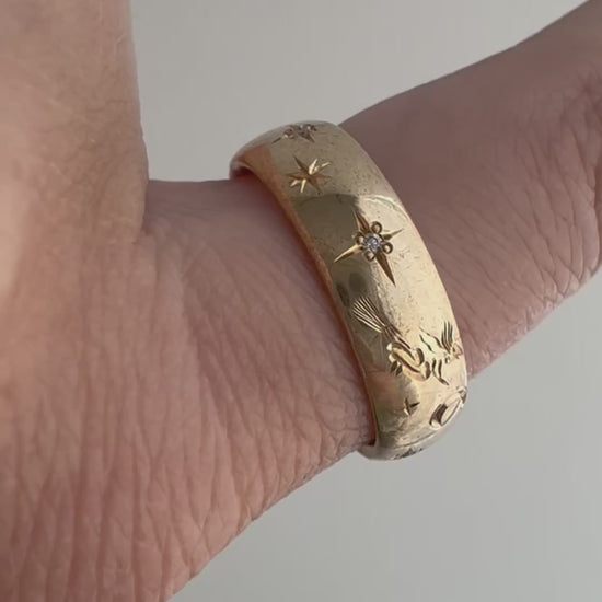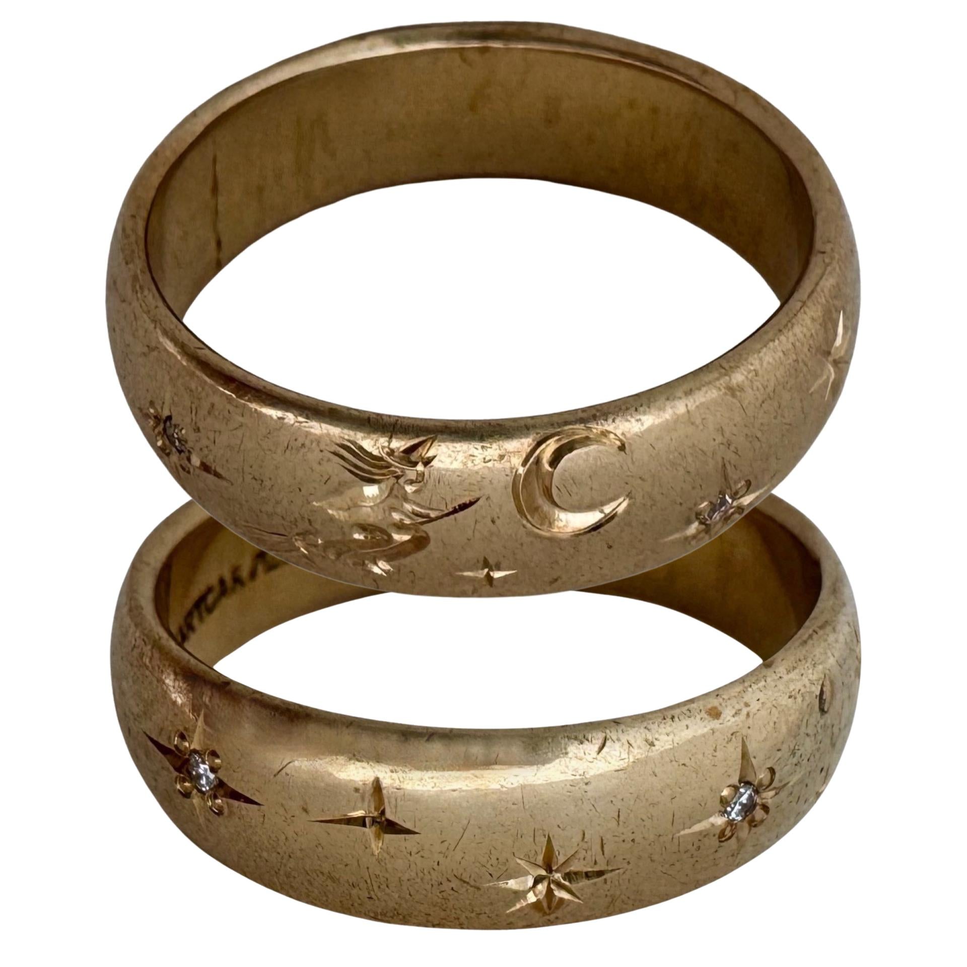 this witch is deeply inspired by antique illustrations of witches, but with a softer, sweeter vibe and a celestial mix of four and six point stars. the witch is obviously a good witch, as most are — don't be fooled by other lore about witches. unlike other iterations of this design, this is a full eternity design, meaning the engraved starbursts (five with diamonds) wrap around the full band