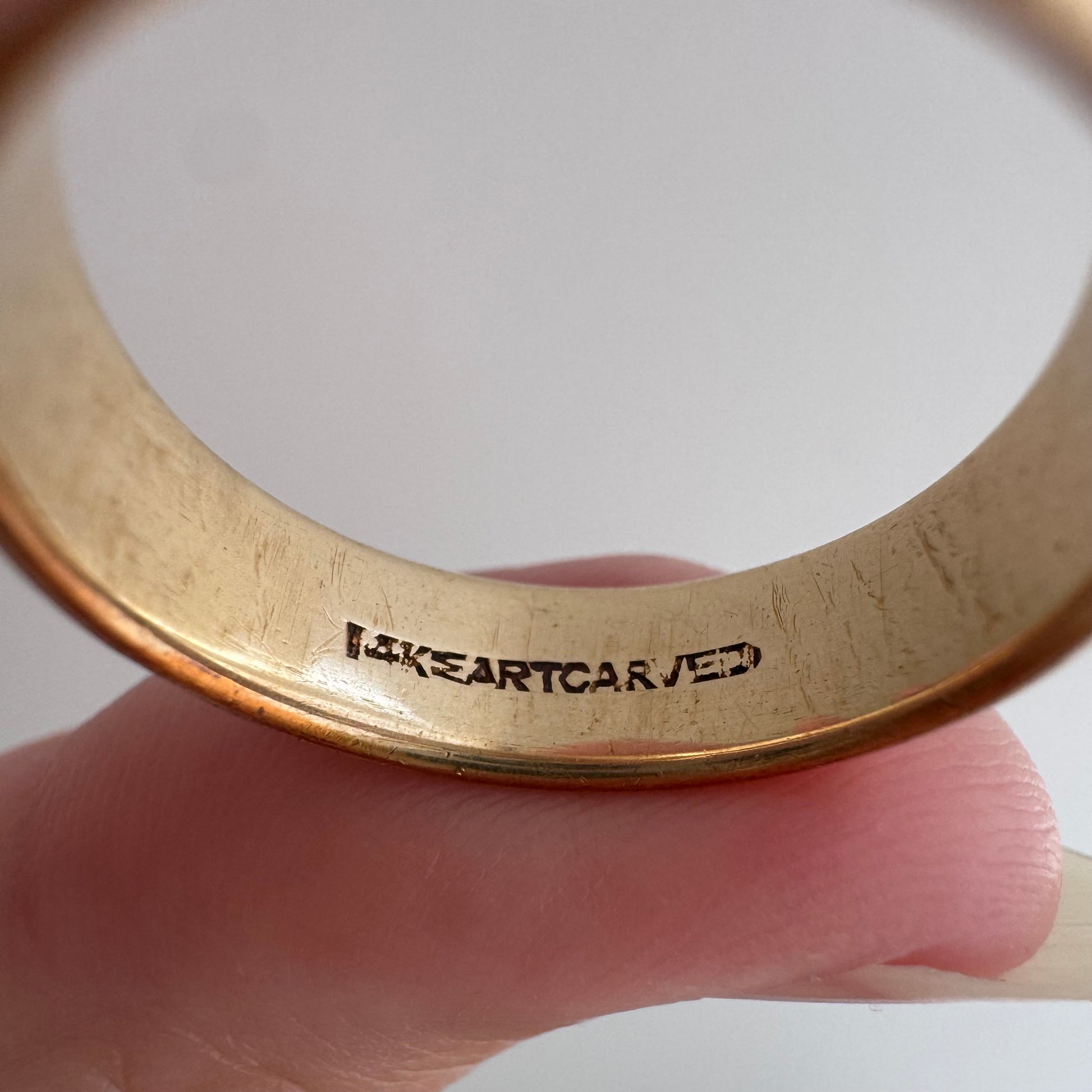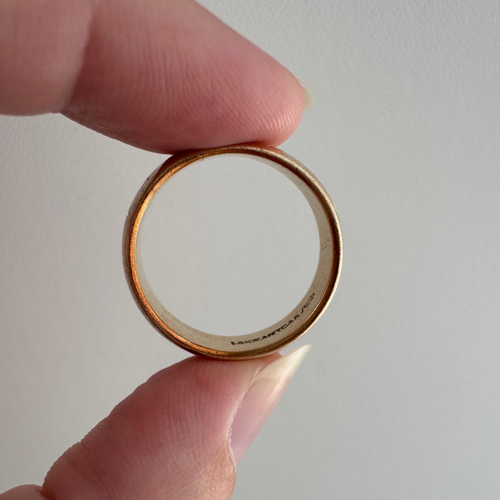 the band is a buttery 14k yellow gold vintage Artcarved band, while the the engraving and diamonds are new — while this motif will likely show up on future vintage forms, this is a true one of a kind