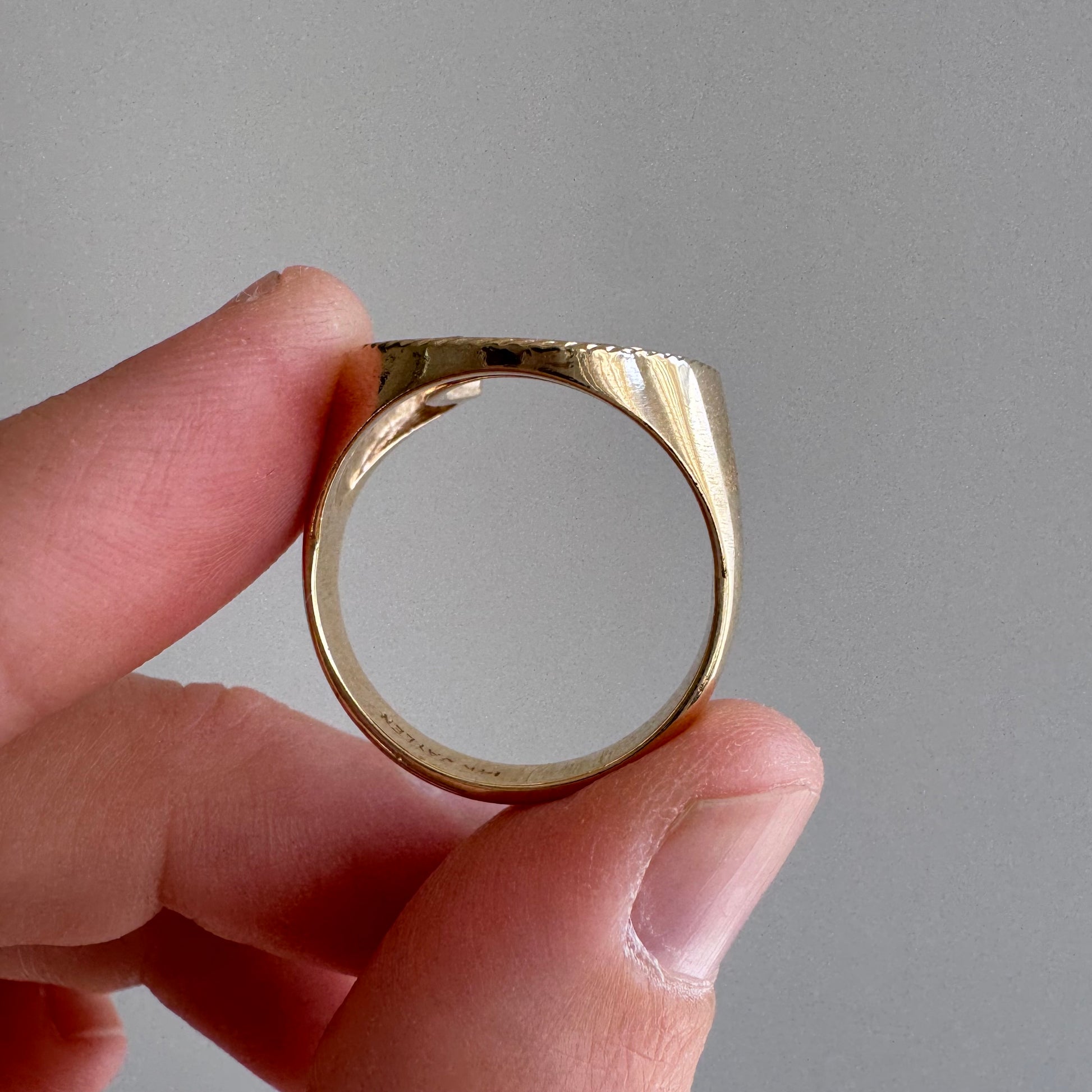 until recently this ring was in bad shape. it had once had stones, but those stones had been removed and the settings had been poorly filled with solder. it's just been expertly rehabbed by Chris Neff, a master hand engraver, who set new stones, added nail details, and a roped milgrain border. it's a true one of a kind custom ring leveraging an old form. this is the magic of vintage jewelry — it has more lifetimes than a cat.