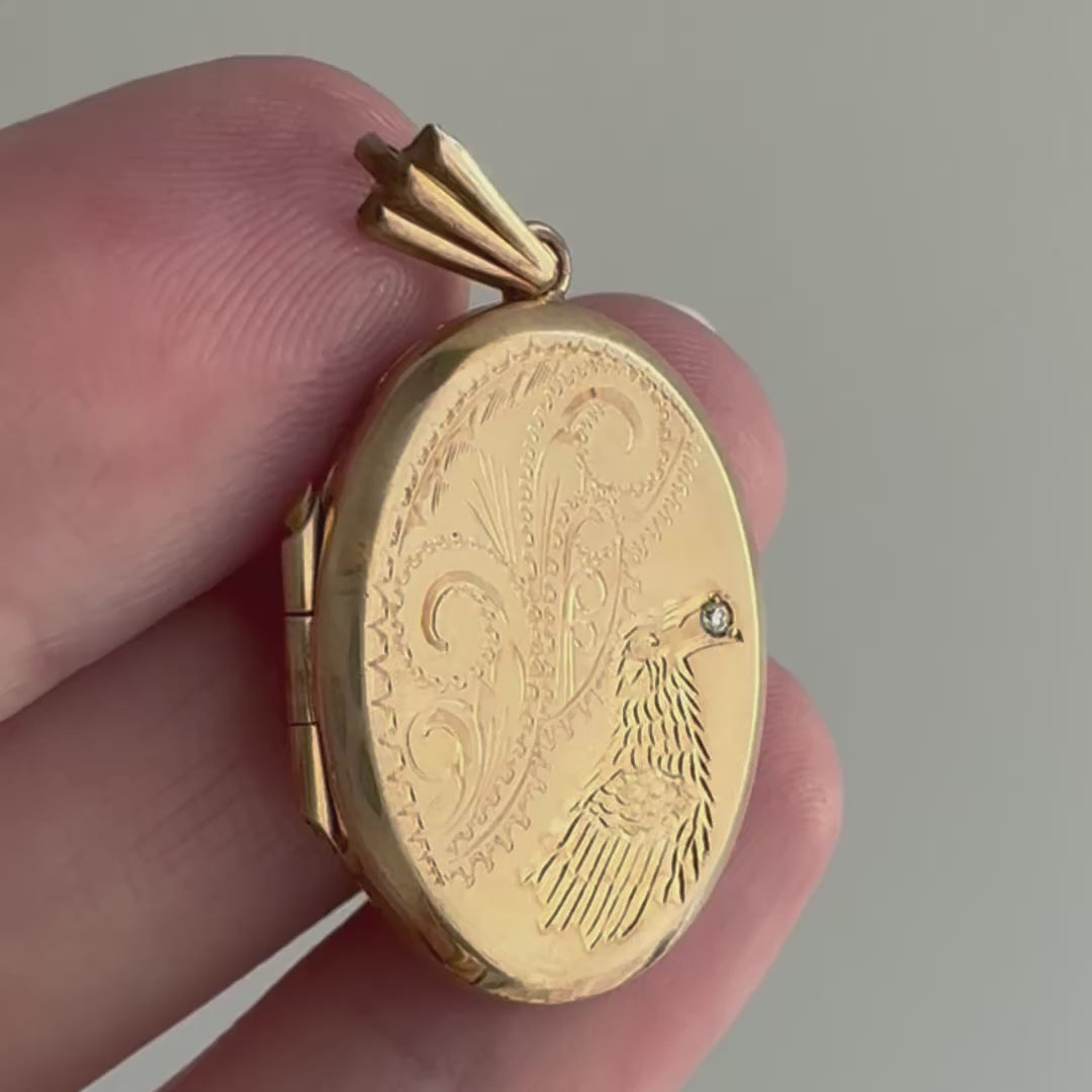 while this design will show up on other vintage and antique forms, this is a vintage locket originally adorned with swirly engraving and newly adorned with our feathered friend