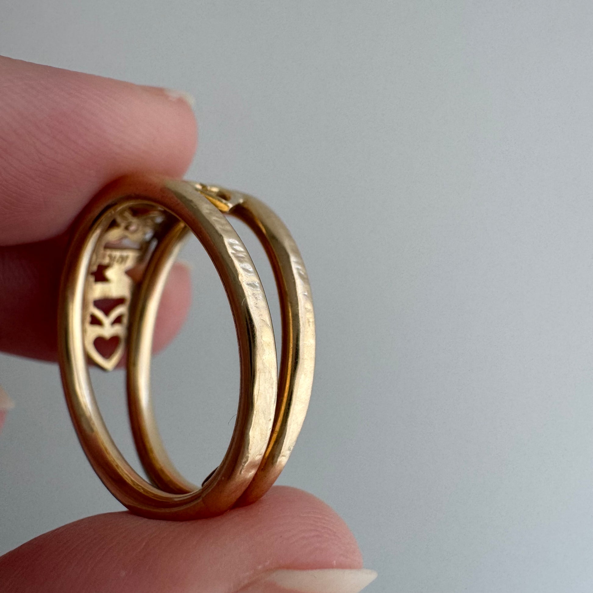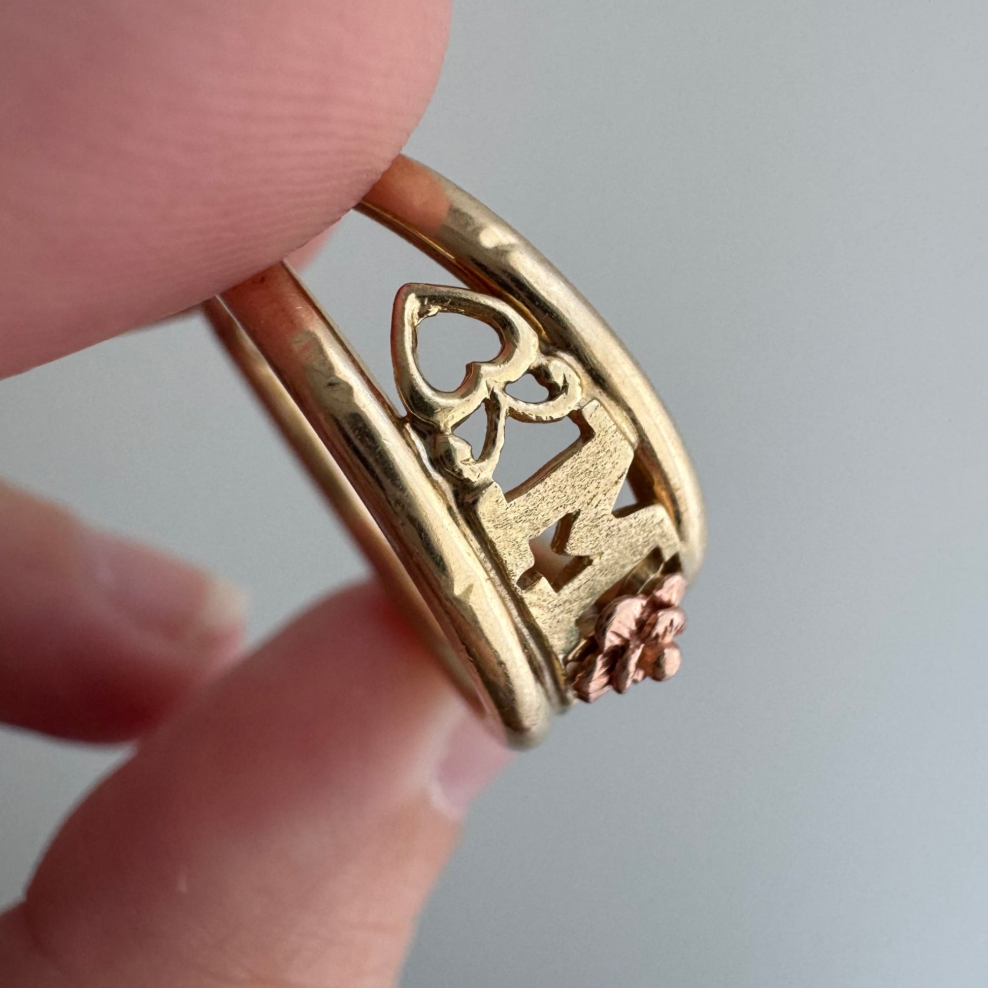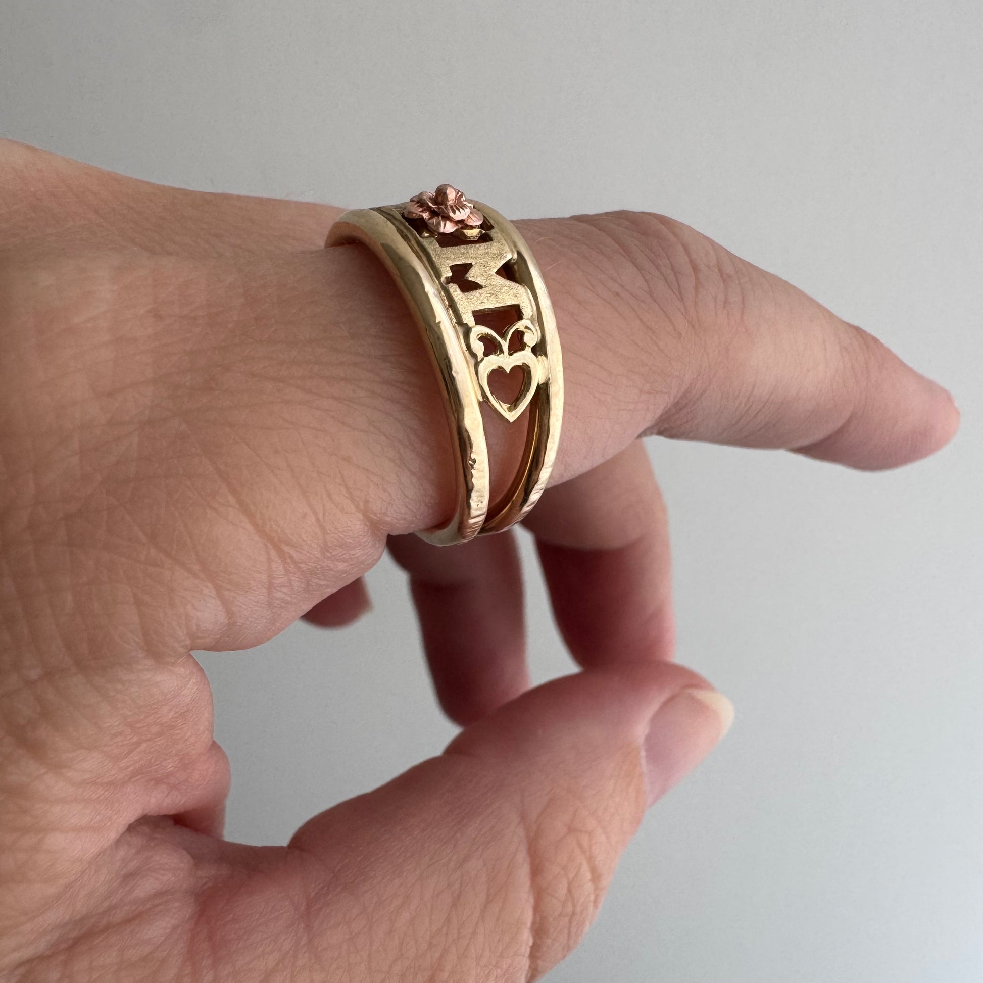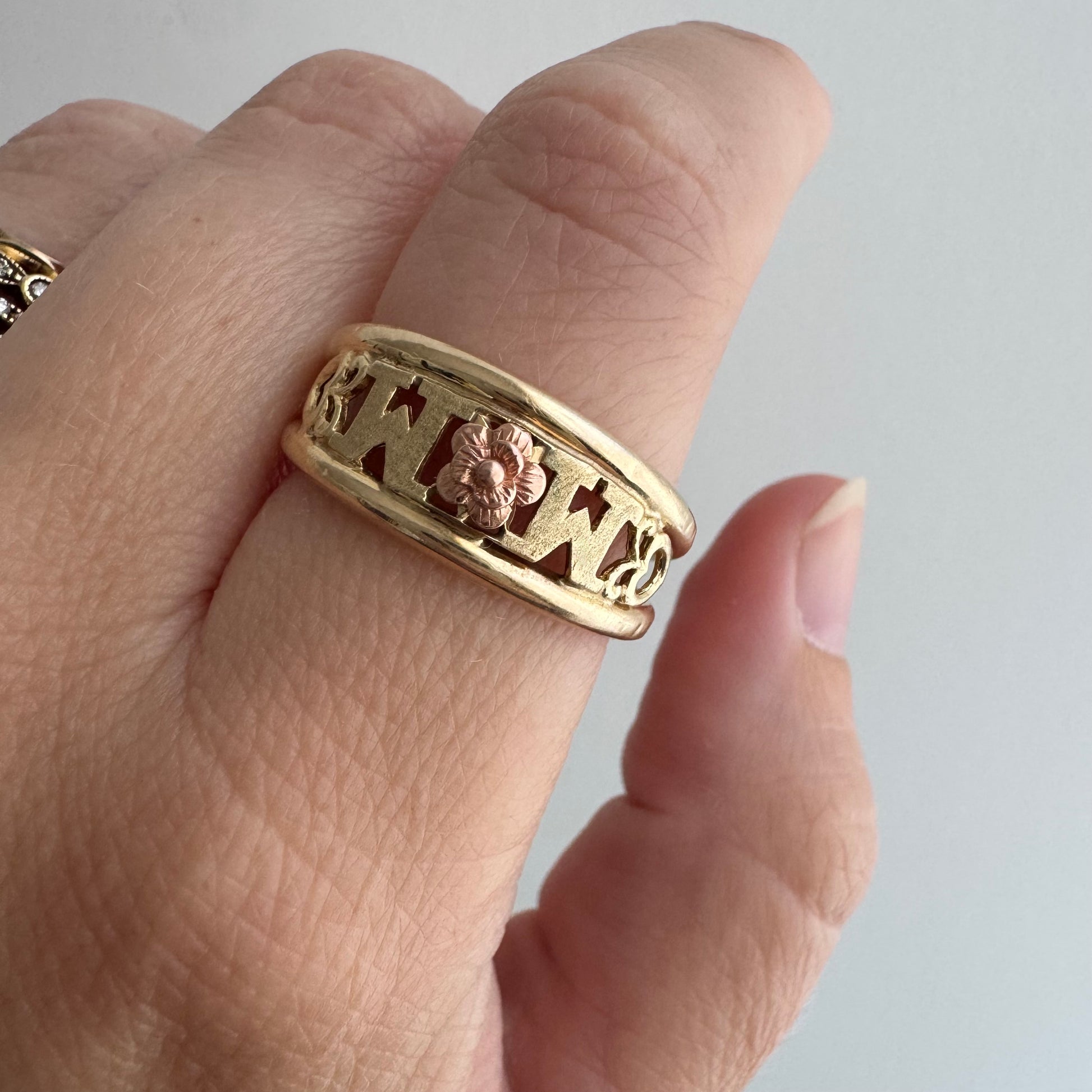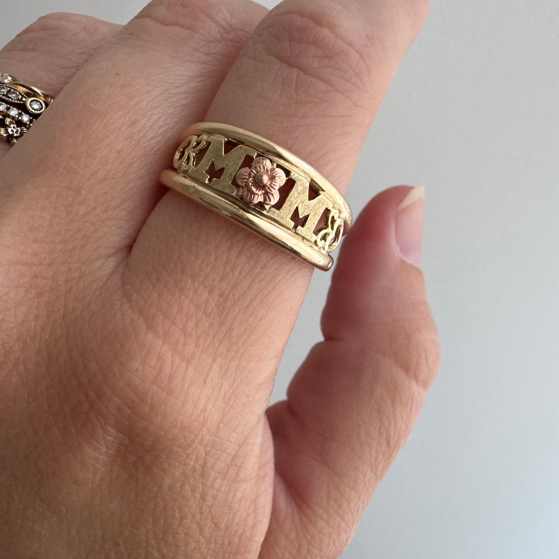we do love a MOM ring that doubles as a WOW ring and this one is a playful example, though much like the experience of modern motherhood, this band has time-earned character and wrinkles