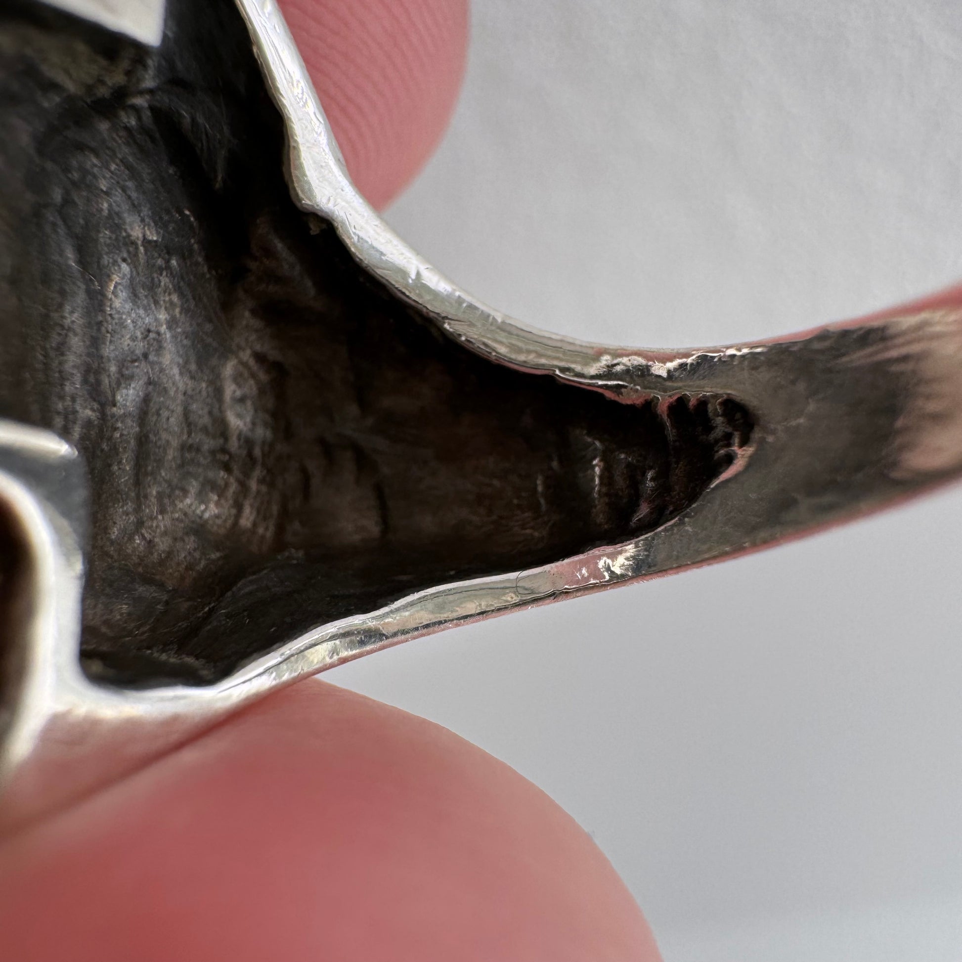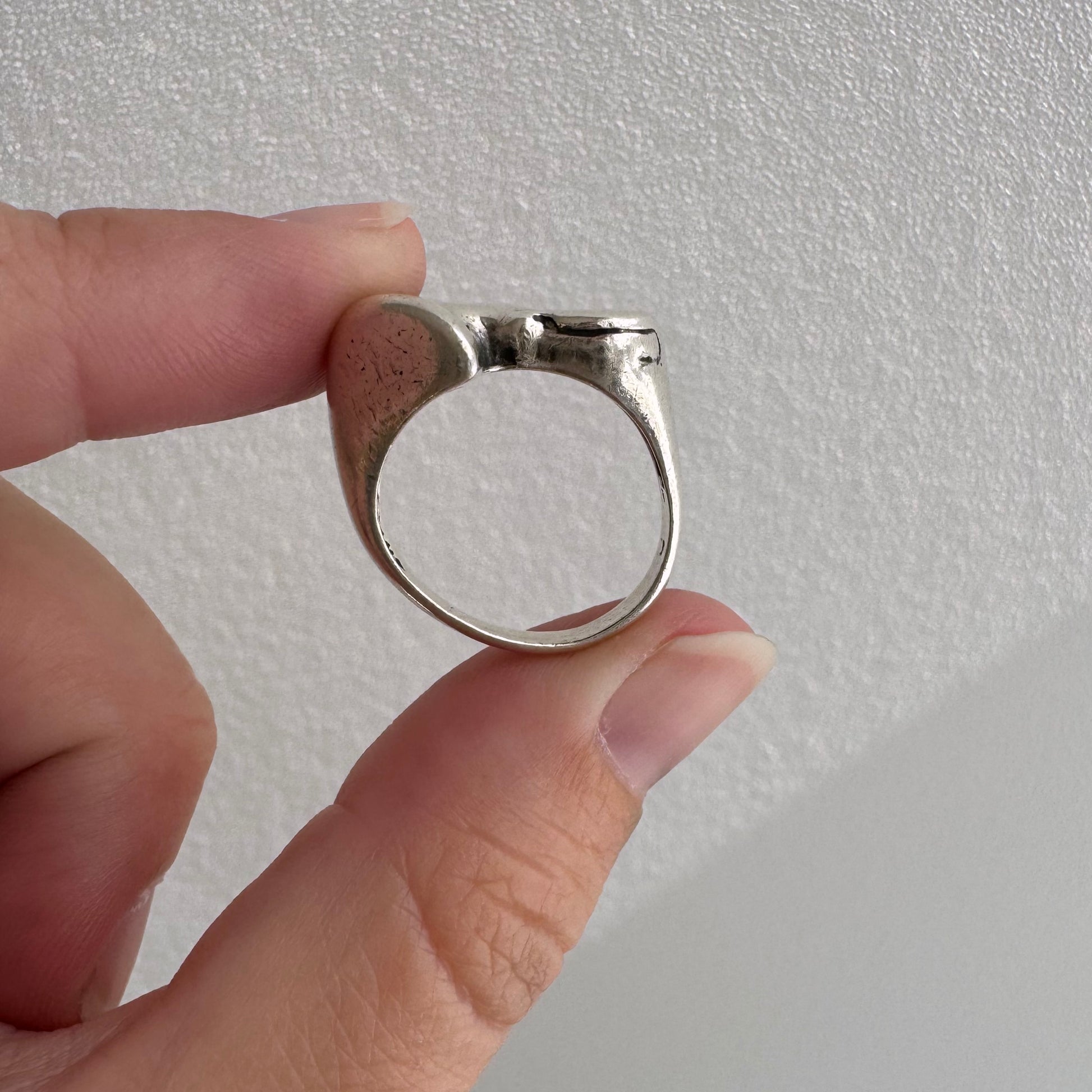 is this a vintage ring? hard to tell. is it well-loved and pre-loved? absolutely. a striking minimalist, modernist manifestation of a dog's face with a subtle black diamond eye