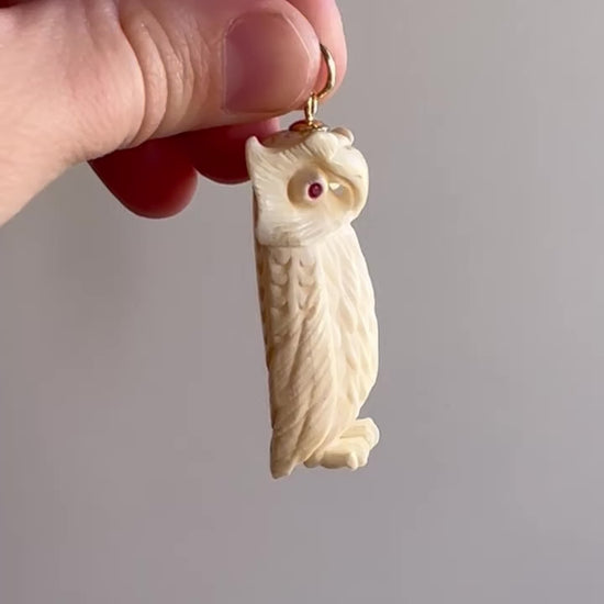 vintage carved bone owl with endless hand carved details now features new ruby eyes and a custom made 14k bolt and bail