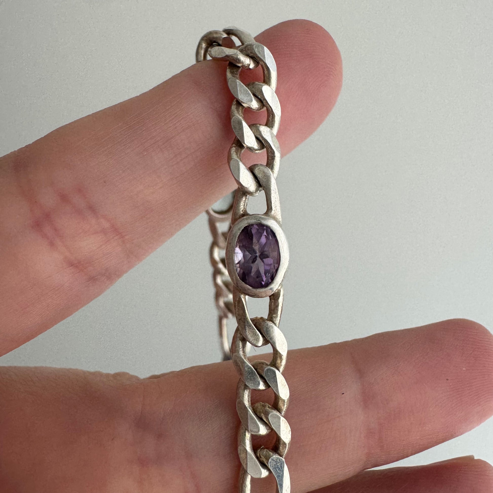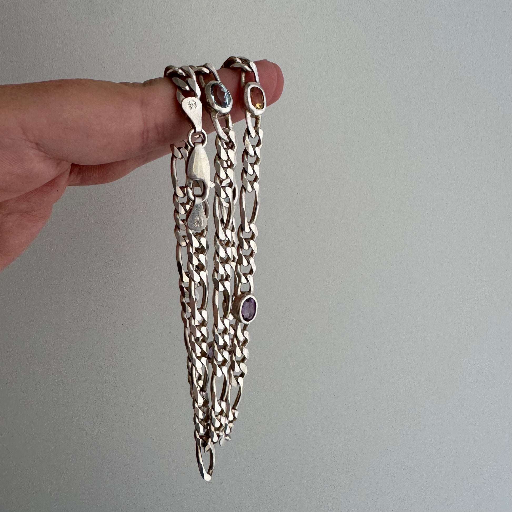 a classic Italian sterling silver three-to-one figaro chain in a longer, bold length and this one has a delightful addition: bezel-set semiprecious stones! the stones repeat their order: blue, yellow, purple, which means that there isn't symmetry when worn, which is a nice quirk