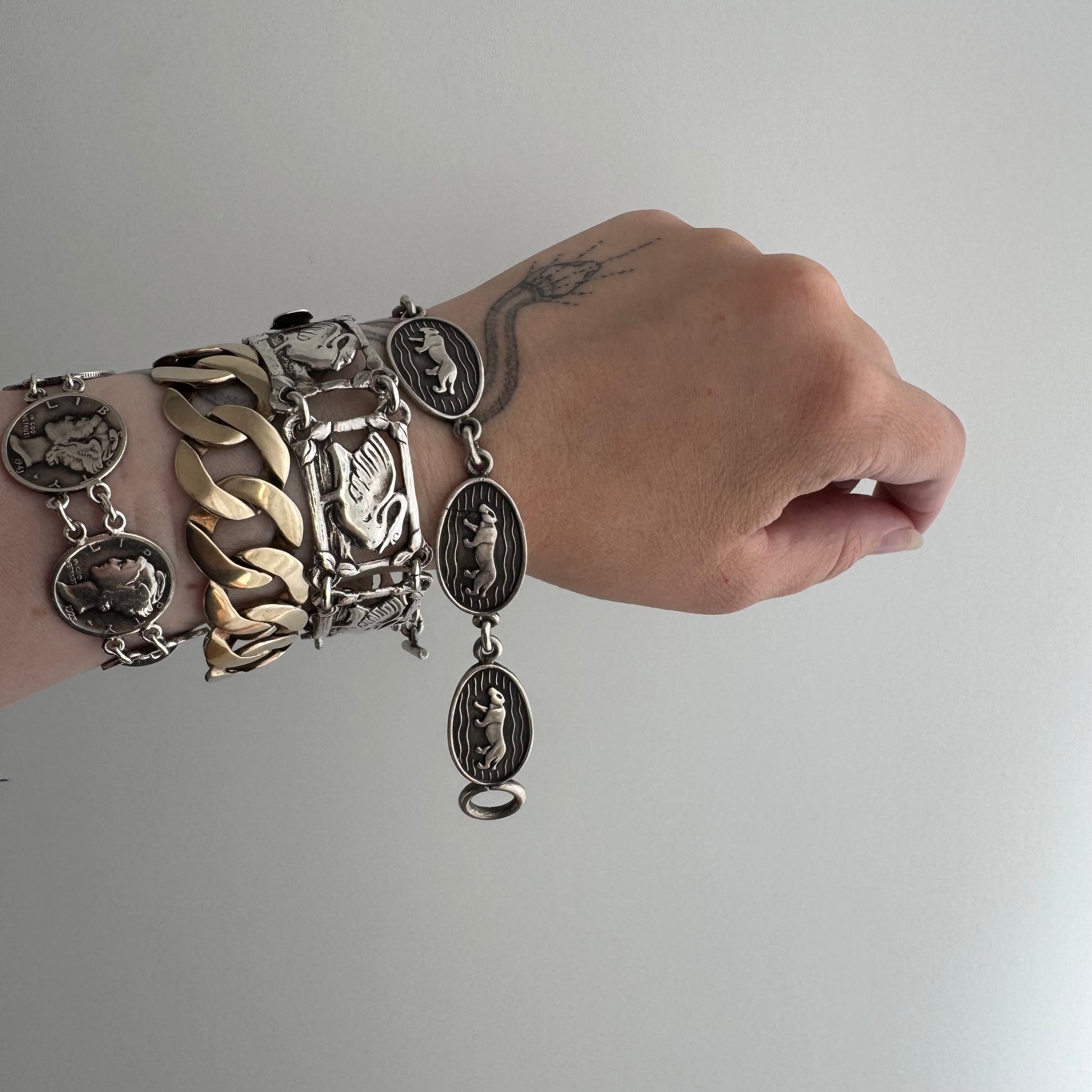 a classic oval link masterfully brought to life with a subtle curve and chunky, handmade connector links, finished with a timeless toggle clasp. it's a lovely way to add some width and shine on a wrist with a sturdy weight. and can we talk about the magic of having a bunch of big cats calming stroll through energetic waves around your wrist!?