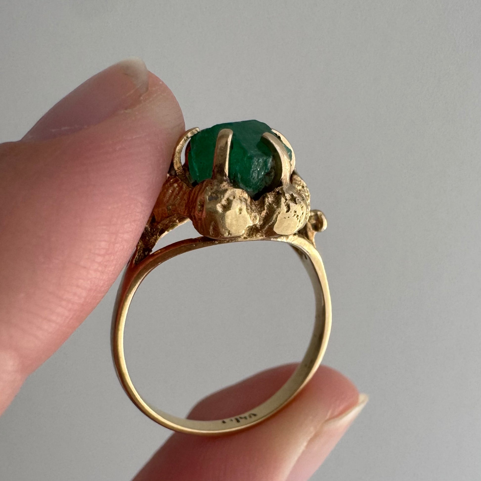 V I N T A G E // brutalist bloom / 14k and raw emerald floral solitaire ring / size 6