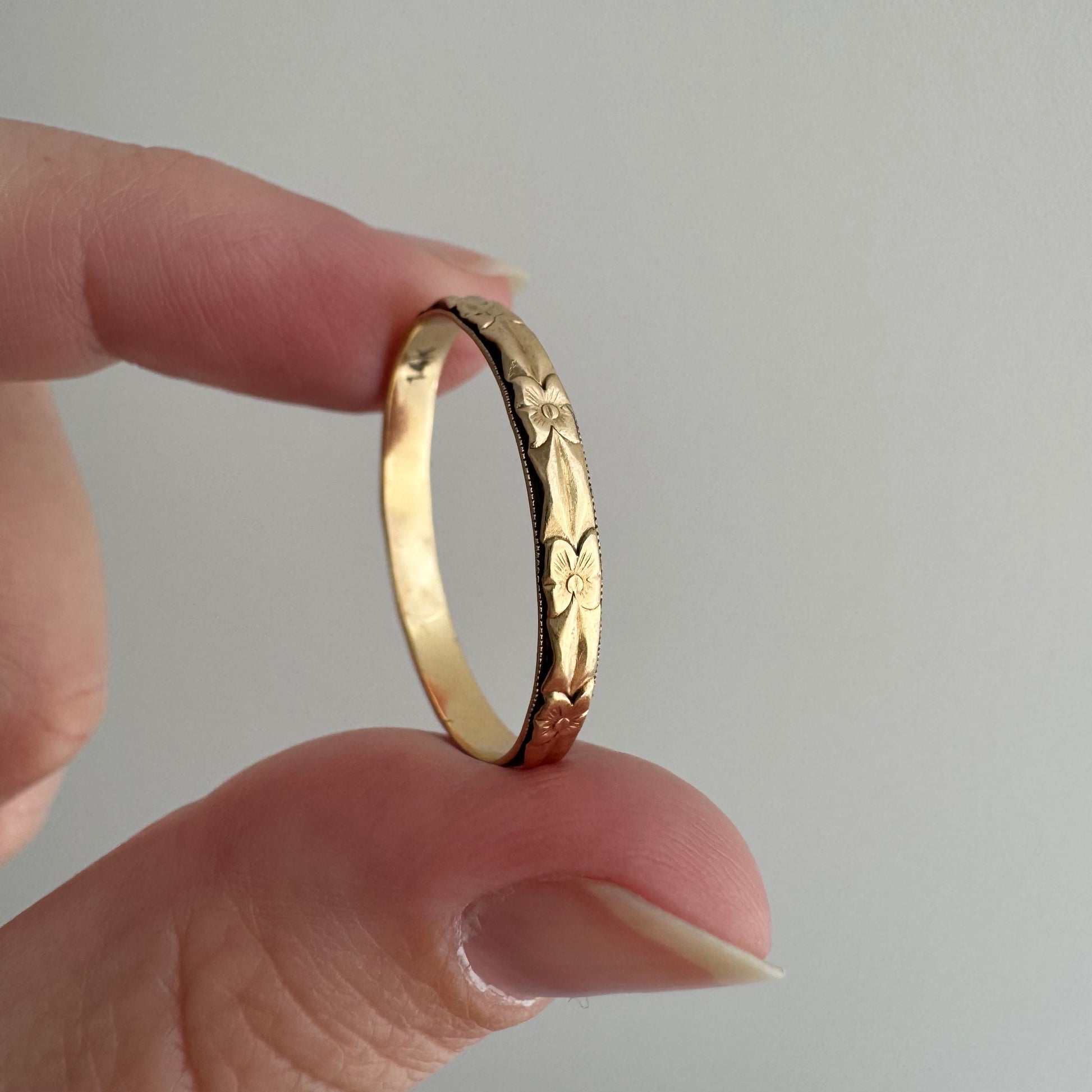 V I N T A G E // crisp blooms / solid 14k yellow floral patterned thin eternity band / size 11