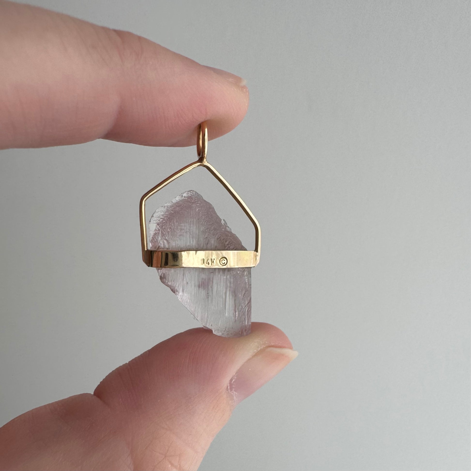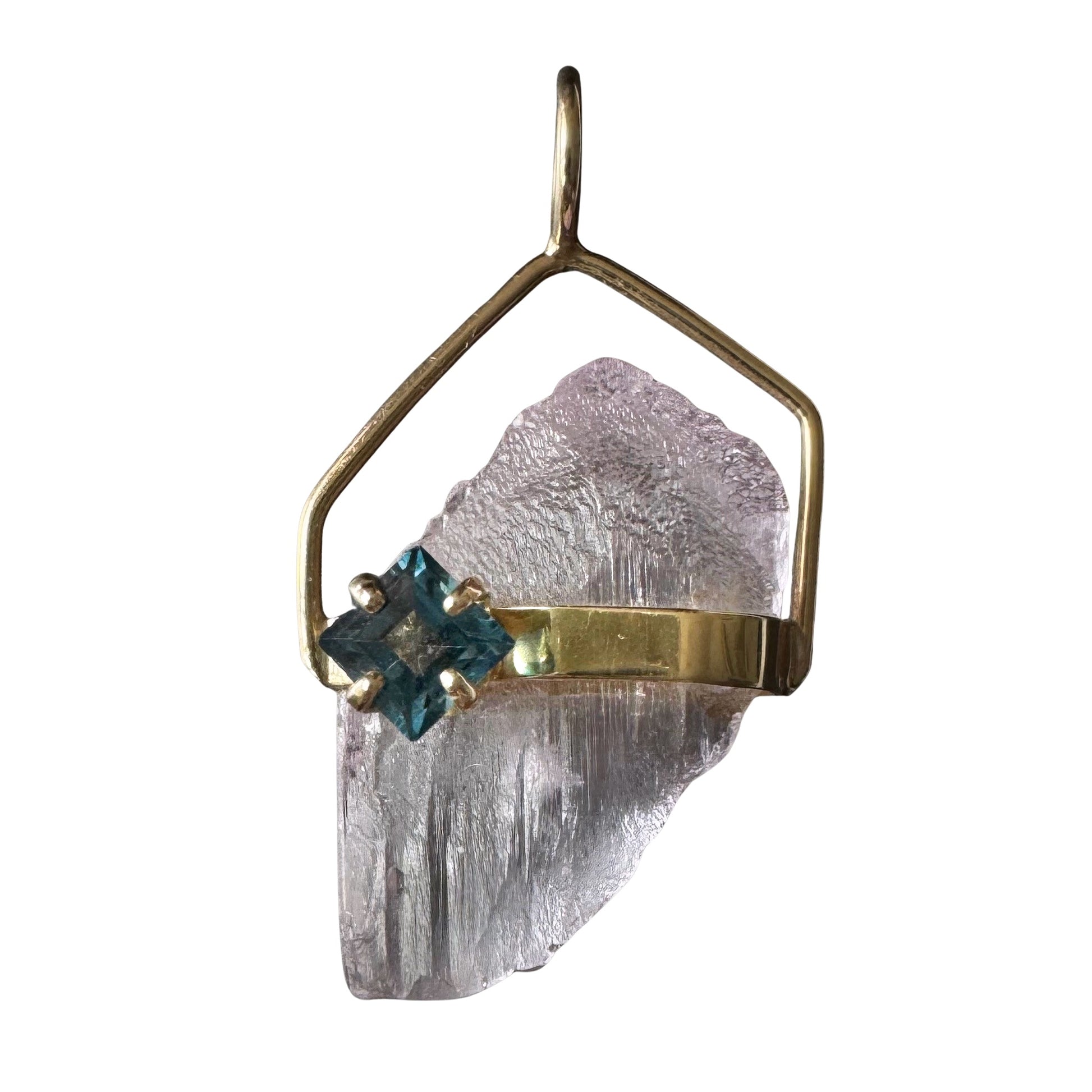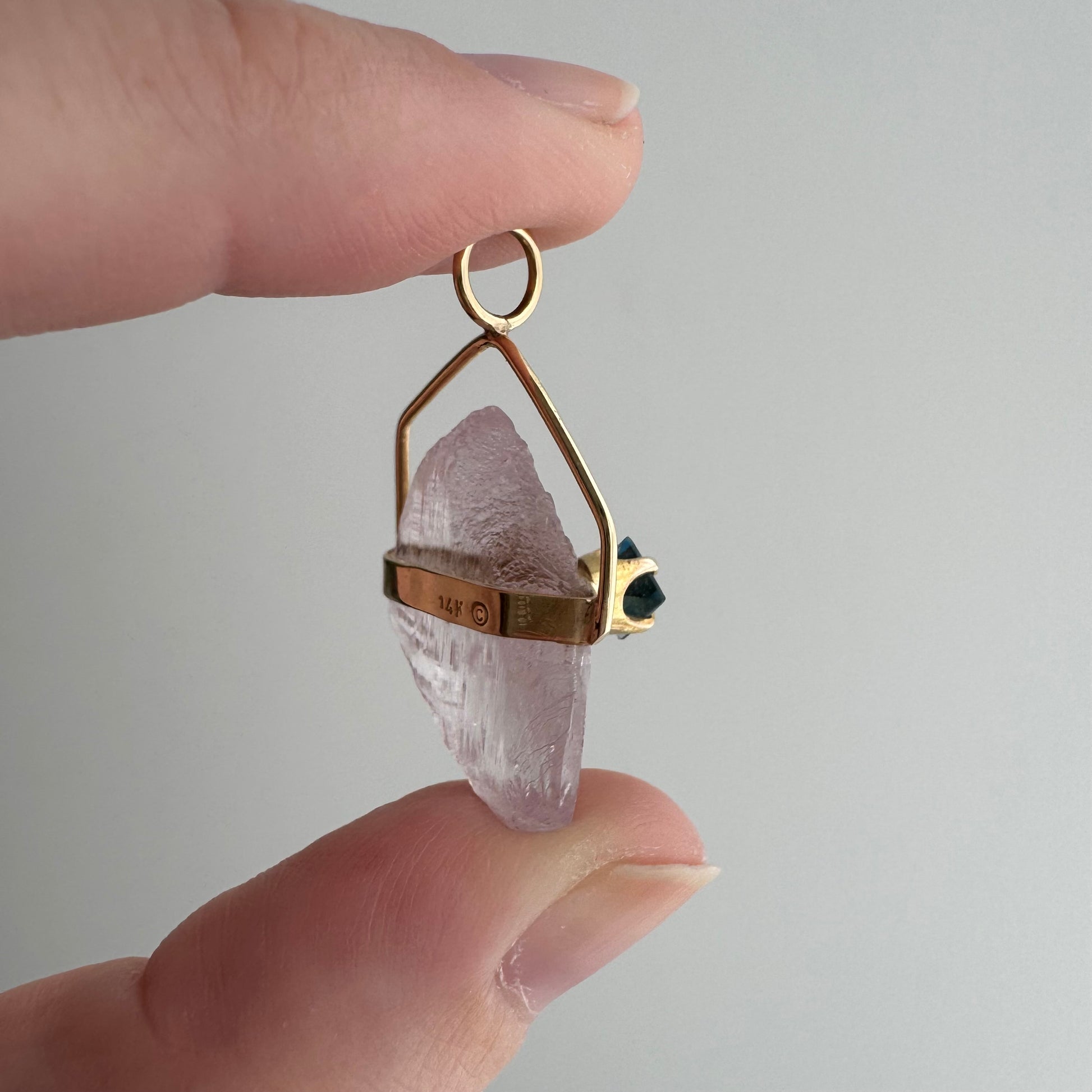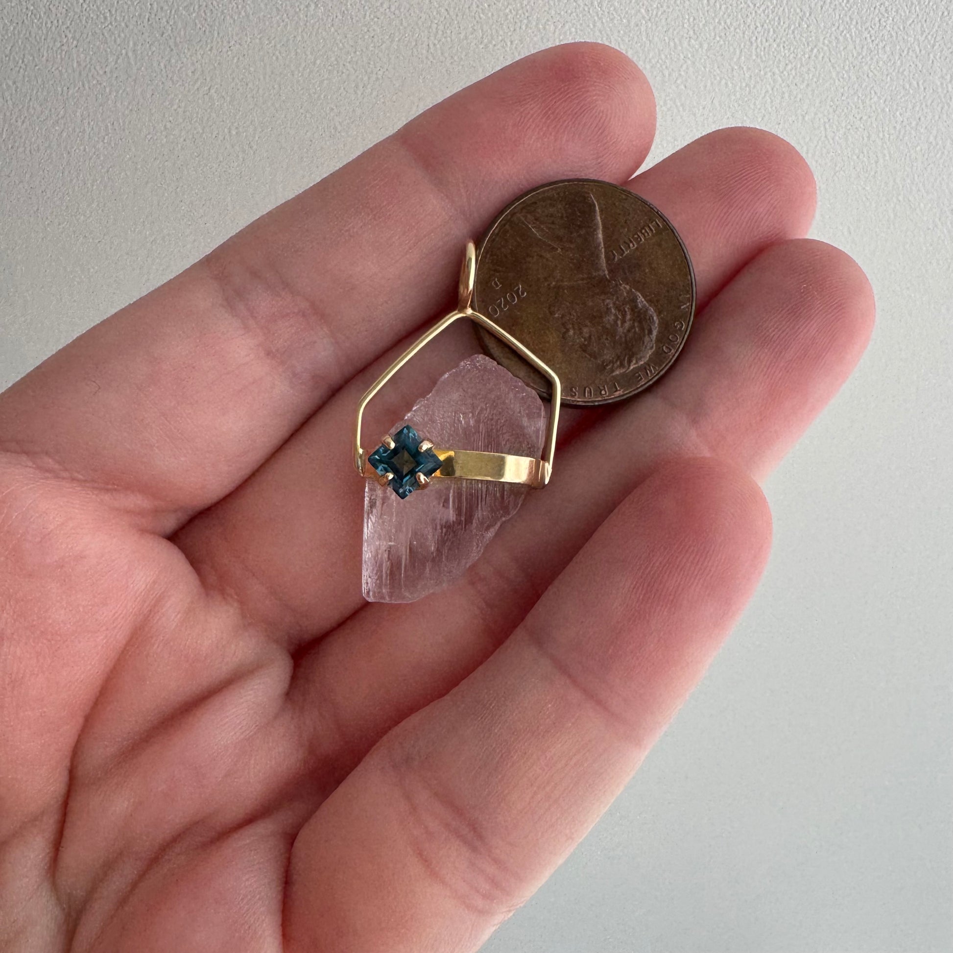 new old stock artist-made one of a kind crystal magic pendant. a rough piece of pale purple amethyst is wrapped in 14k and adorned with a square blue topaz set in a round prong — sassy! this pendant has 1990s vibe and timeless good energy and it's bold on its own, but great paired with other pendants