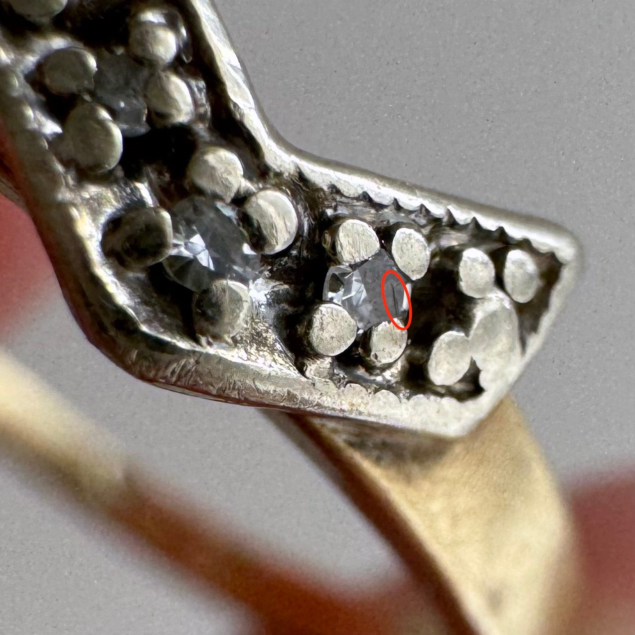 -the chevron setting once had crisp prongs, milgrain edges, and illusion settings at either end — the design details are all there, but have softened significantly