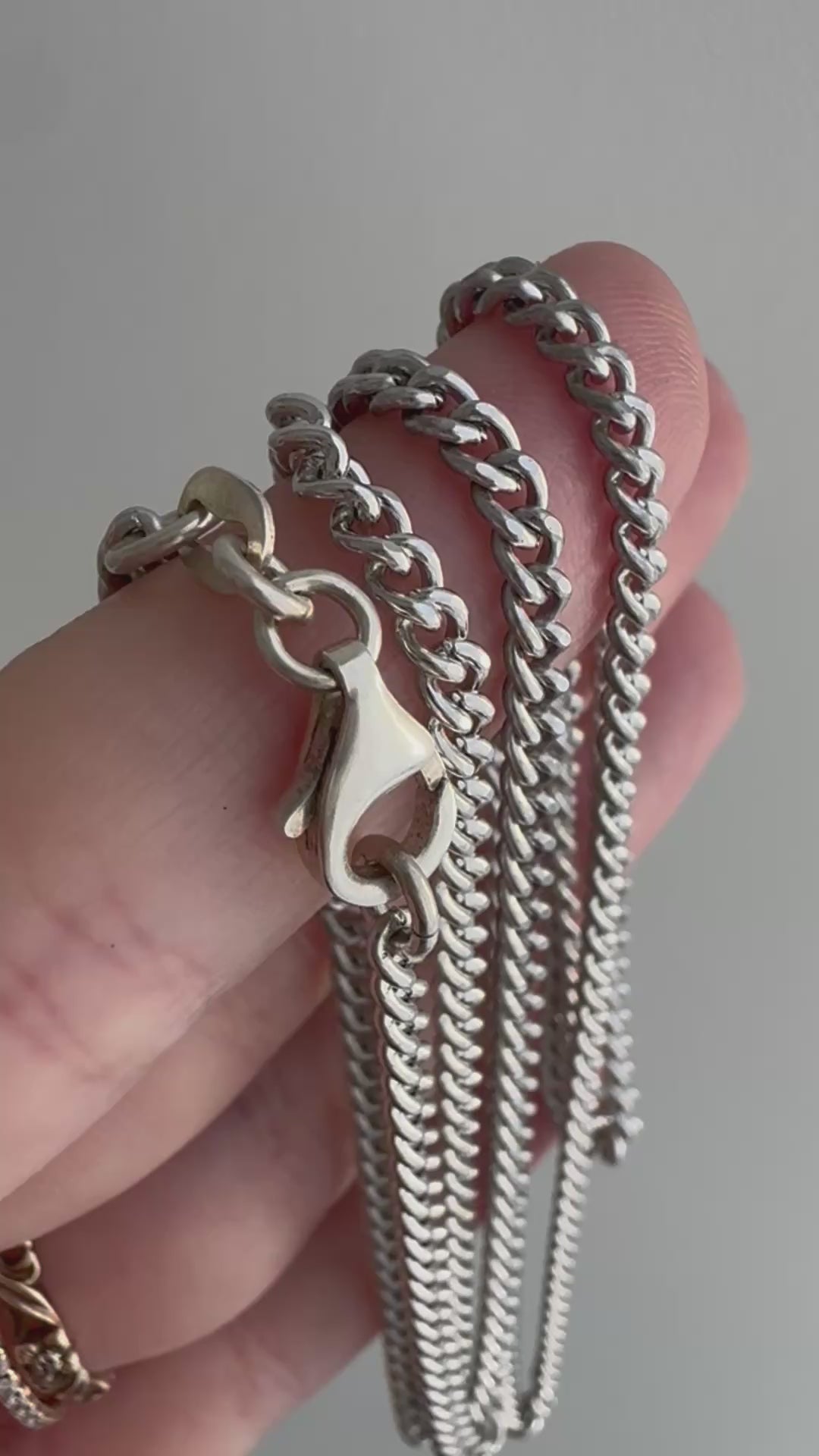curb chain: the findings (jump rings, clasp, etc) are not rhodium plated, which is a mismatch with the rest of the chain. the rhodium plating on the curb links has minimal wear. the end bail is an oval jump ring (not soldered). at least one of the links is bent slightly, so it doesn't nestle perfectly with its neighbors