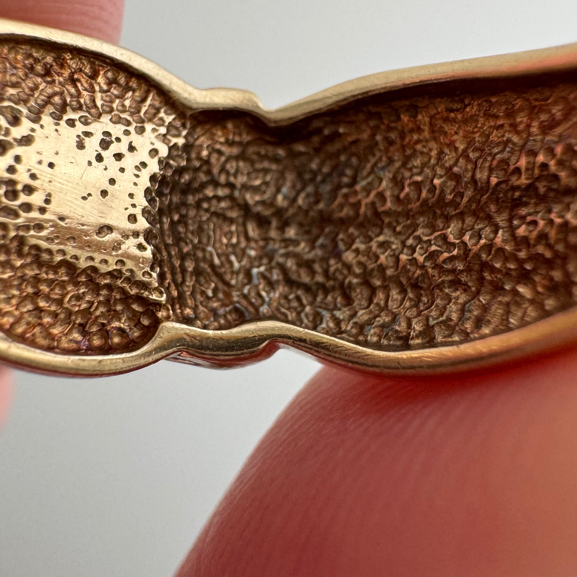 minor surface wear to the three small diamonds, and one maybe a little crooked in its setting? they were all once accented by white gold, which is fading/faded/gone