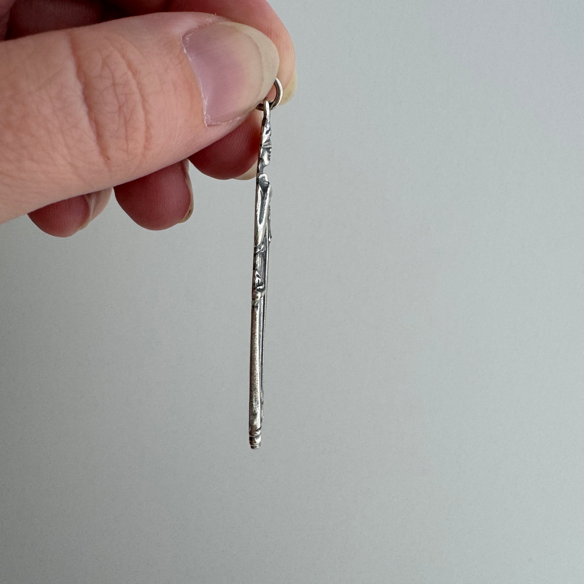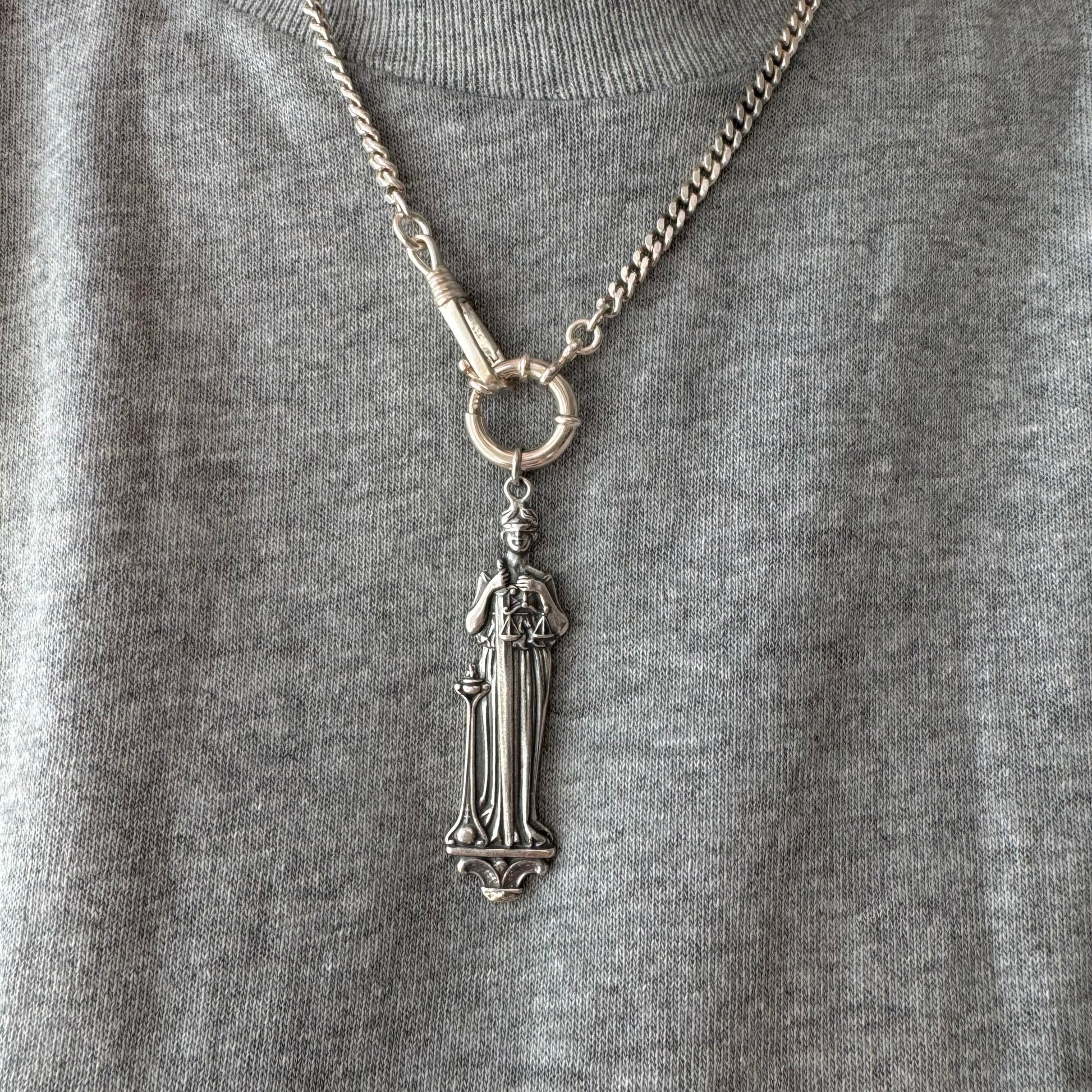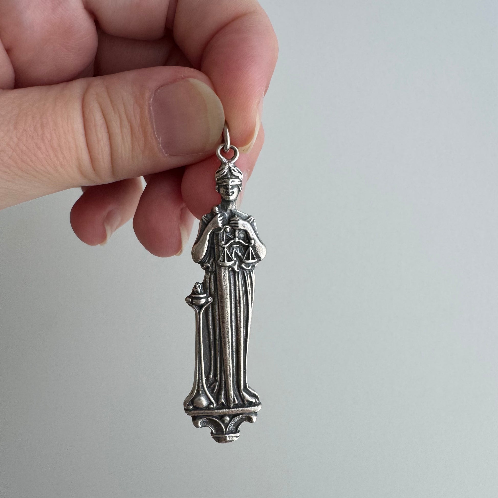 a wonderful sterling silver Justitia pendant, quite possibly a spoon handle conversion. she's blindfolded, has a body length sword, and she's carrying her balanced scales of justice with her.