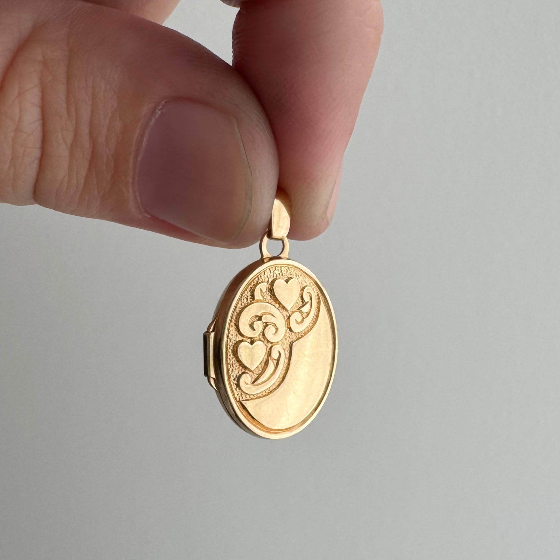 V I N T A G E // lovely memories / 14k oval locket with embossed heart and swirly details / a pendant
