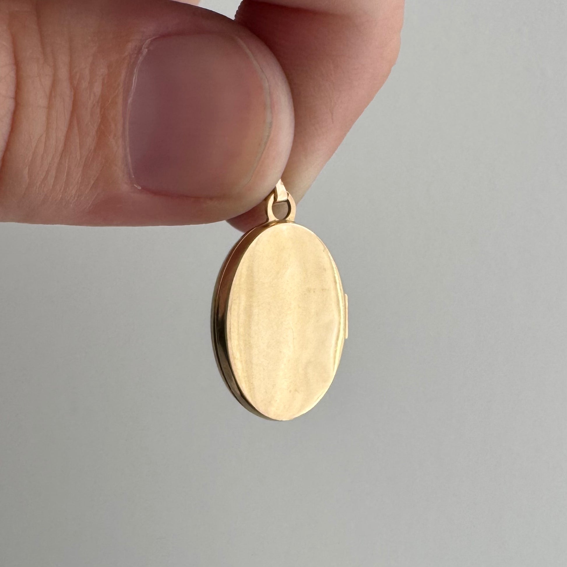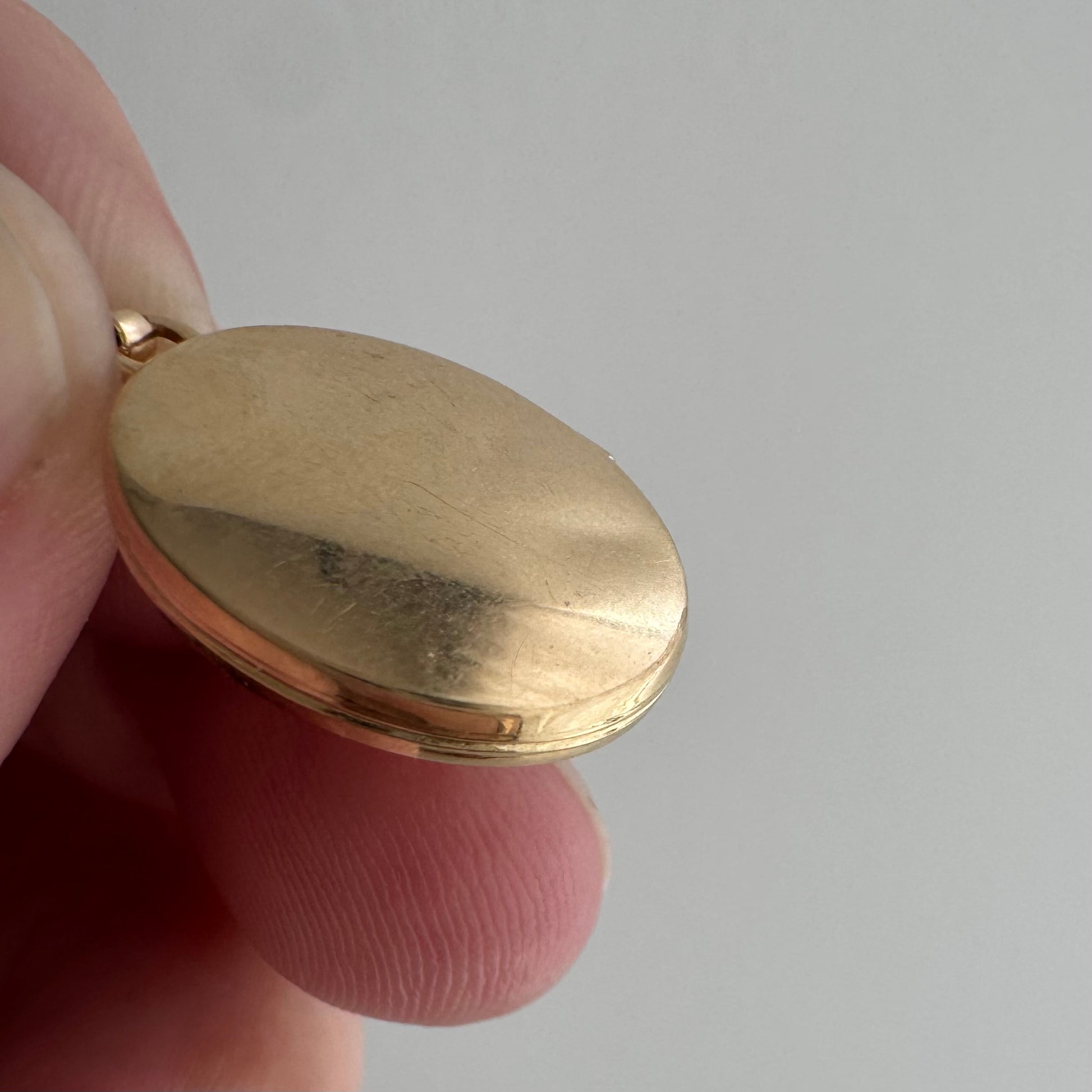 -this is a 1990s locket in the style of a 1940s locket and the main difference is how much gold was used — much less in the 1990s than in the 1940s, which means that there is some denting on the backside of the locket