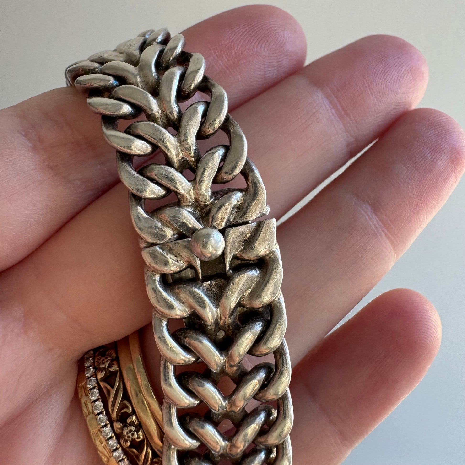 do you see it? how the interlocking links resemble curled ram horns or fallopian tubes? ha! it's also possible you see an expertly-crafted wide chain crafted in Mexico by a Taxco artist.