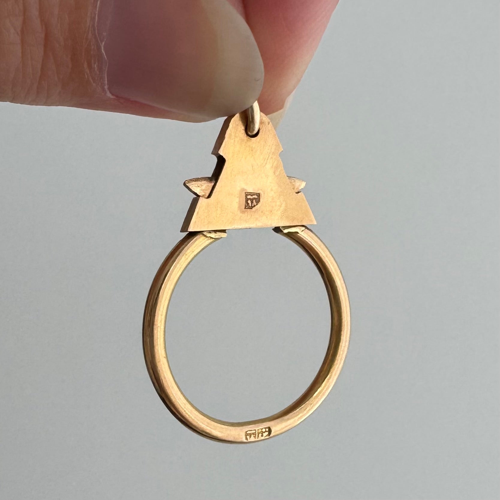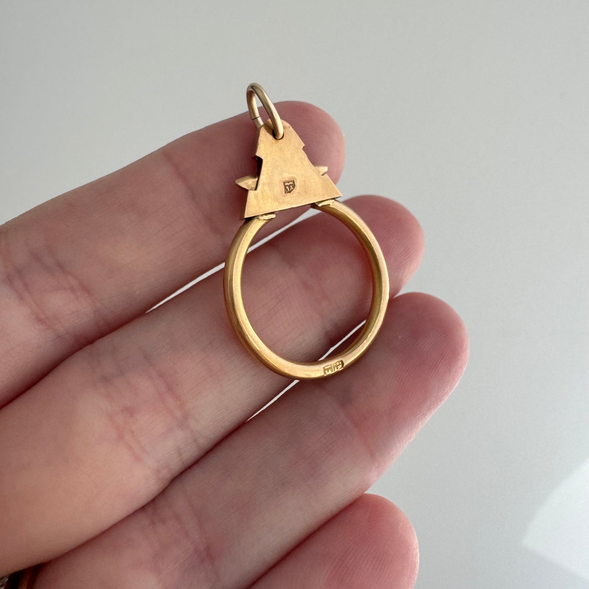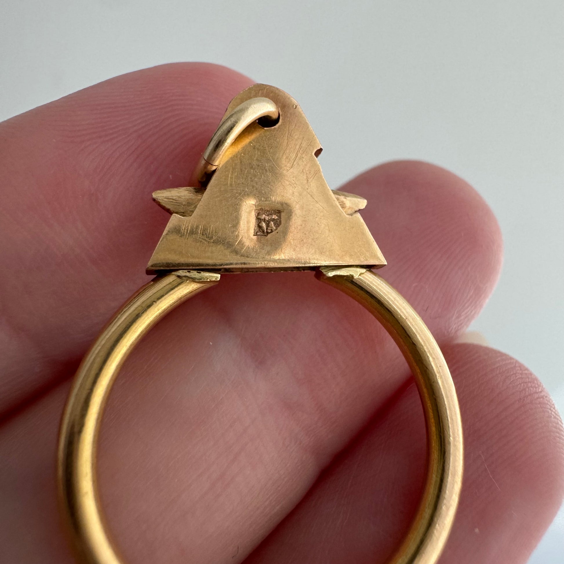 18k yellow gold with a slight rosy hue & tiny Egyptian hallmarks + 14k jump ring bail